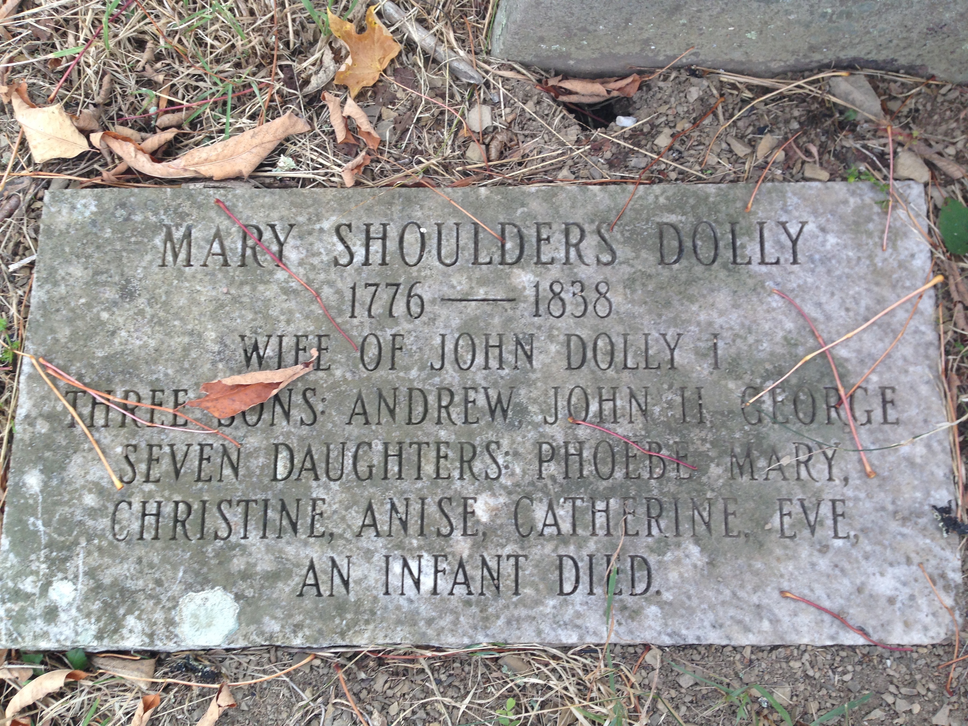 Mary Shoulders Dahle (Dolly) (b. 1776; d. Oct 14, 1838), daughter of Conrad Shoulders, wife of Johann Dahle (John Dolly).