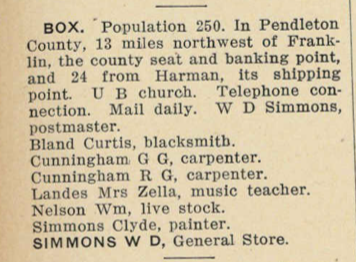 Box. Population 250. In Pendleton County, 13 miles northwest of Franklin. UB Church. Telephone connection. Mail daily. W. D. Simmons postmaster. Zella Landes is listed as "music teacher" and Curtis Bland as blacksmith. Box, WV was probably what is known today by locals as, "Monkeytown." There is a United Brethren church in Monkeytown just east of the Roots Run Rd. Also, Box is listed separately from these other communities: