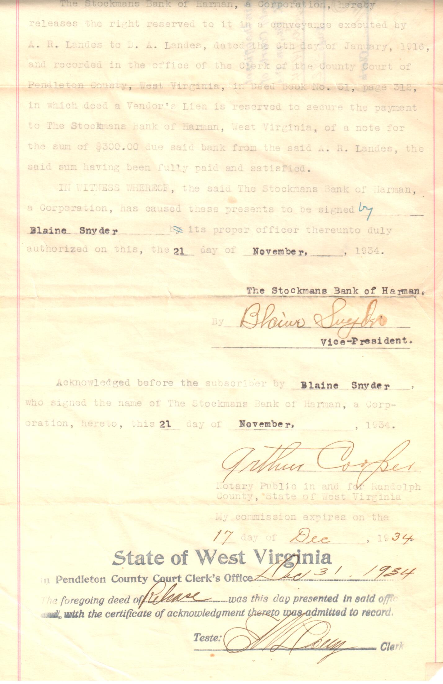 Here is a link to a release of debt [lien] from A. R. Landes to D. A. Landes from the Stockmans Bank of Harman, WV originated on January 6, 1916 and released on November 21, 1934: Deed Bood No. 61, page 318, Clerks Office, Pendleton County, Franklin, WV. D. A. died on November 29, 1934.