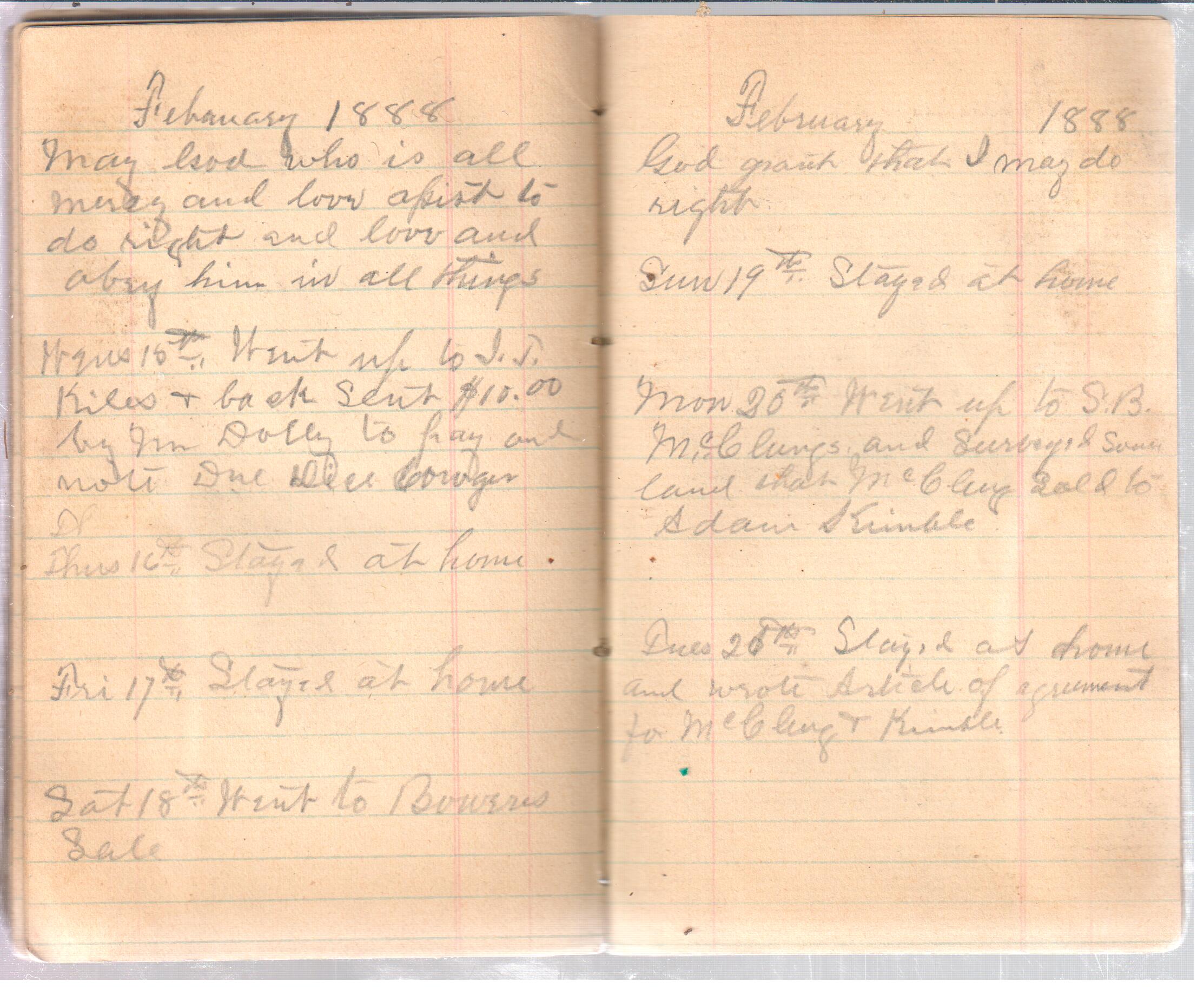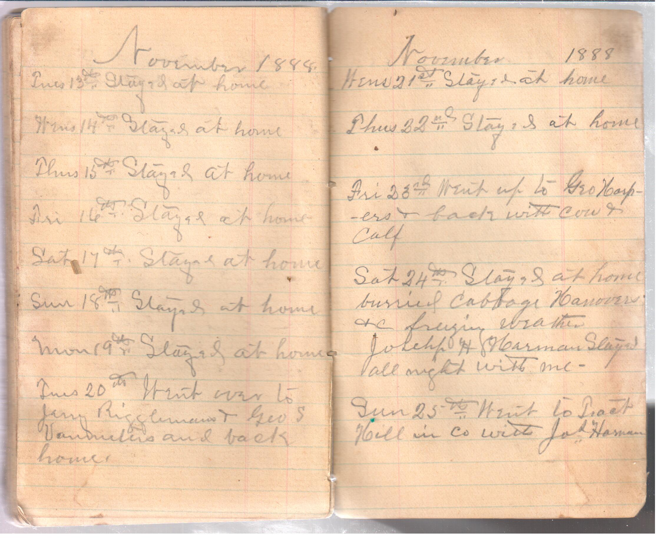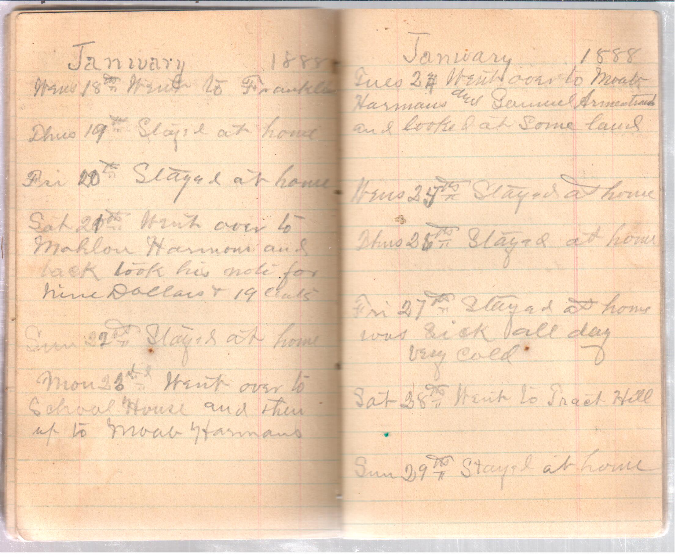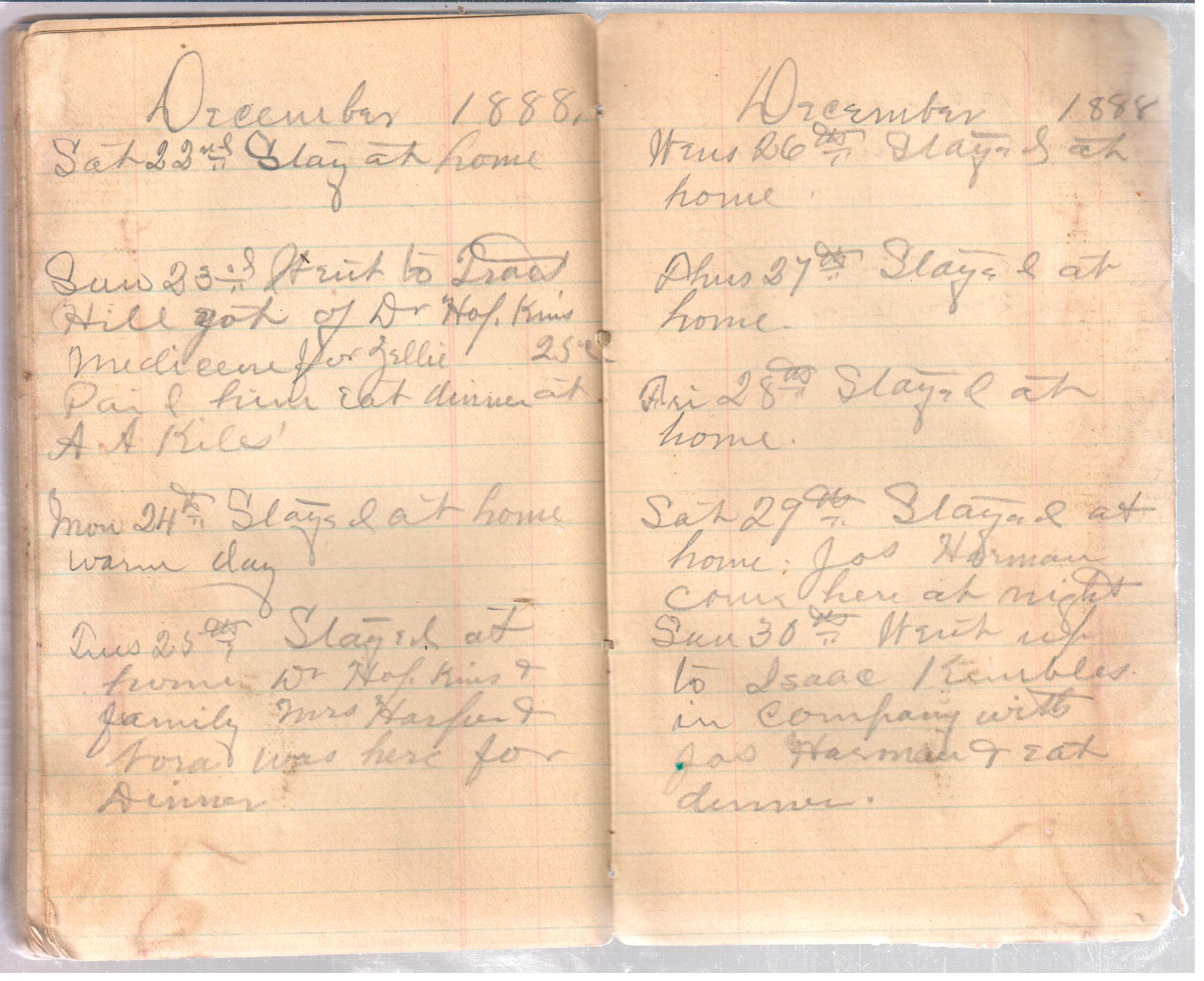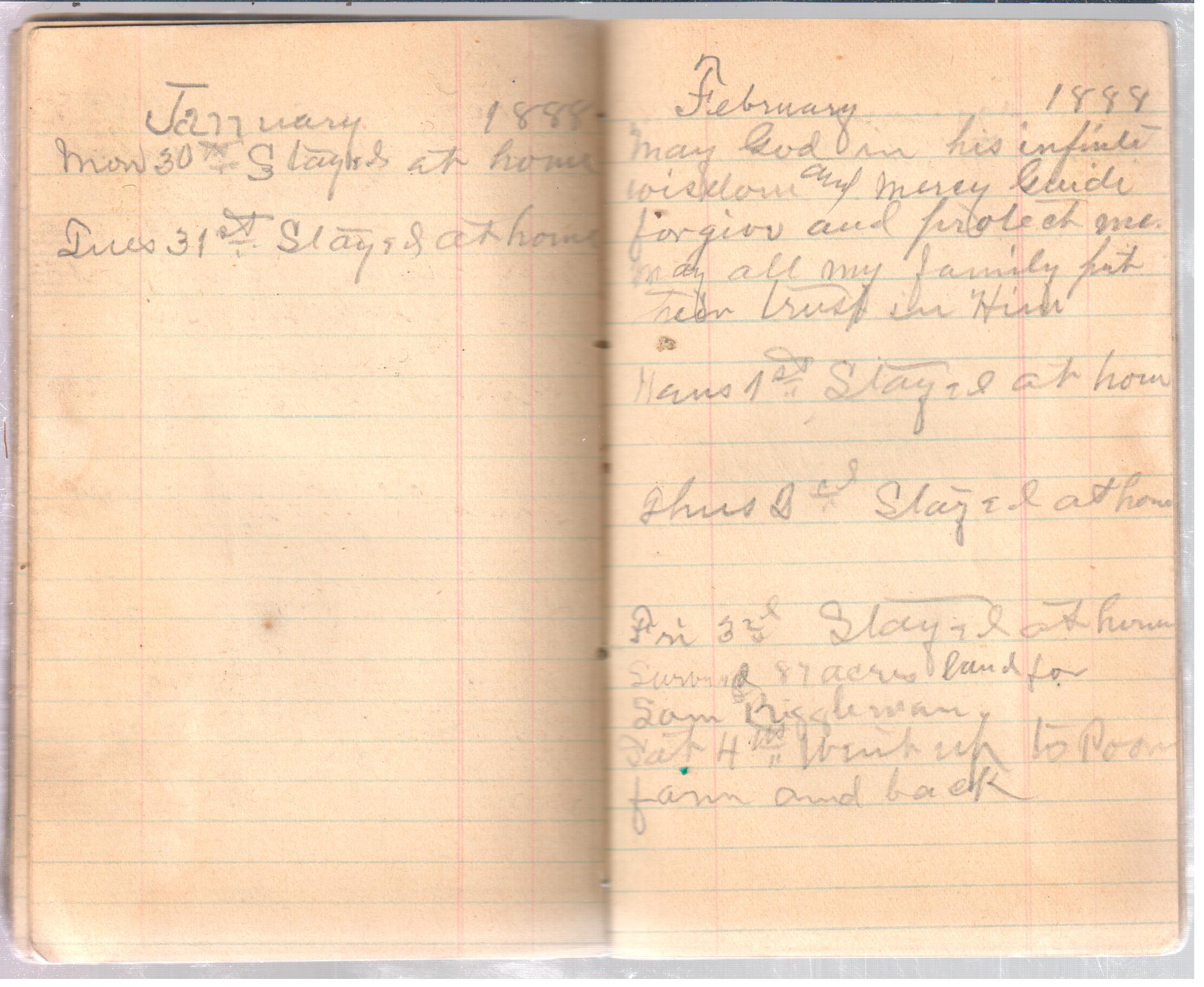 D. A. Landes Diaries: 1887-1888-1889 Only the first 2 weeks of 1889 are entered in this diary. The majority of 1889 is entered in a separate diary. Use slideshow or see pages individually: Page 0 Pages 1-2 Pages 2-3 Pages 4-5 Pages 6-7 Pages 9-10 Pages 11-12 Pages 13-14 Pages 15-16 Pages 17-18 Pages 19-20 Pages 21-22 Pages 23-24 Pages 25-26 Pages 27-28 Pages 29-30 Pages 31-32 Pages 33-34 Pages 35-36 Pages 37-38 Pages 39-40 Pages 41-42 Pages 43-44 Pages 45-46 Pages 47-48 Pages 49-50 Pages 51-52 Pages 53-54 Pages 55-56 Pages 57-58 Pages 59-60 Pages 61-62 Pages 63-64 Pages 65-66 Pages 67-68 Pages 69-70 Pages 71-72 Pages 73-74 Pages 75-76 Pages 77-78 Pages 79-80 Pages 81-82 Pages 83-84 Pages 85-86 Pages 87-88 Pages 89-90 Pages 91-92 Pages 93-94 Pages 95-96 Pages 97-98 Pages 99-100 Pages 101-102 Pages 103-104 Pages 105-106 Pages 107-108 Pages 109-110 Pages 111-112 Pages 113-114 Pages 115-116 Pages 117-118 Pages 119-120 Pages 121-122 Pages 123-124 Pages 125-126 Pages 127-128 Pages 129-130 Pages 131-132 Pages 133-134 Pages 135-136 Pages 137-138 Pages 139-140 Pages 141-142 Pages 143-144 Pages 145-146