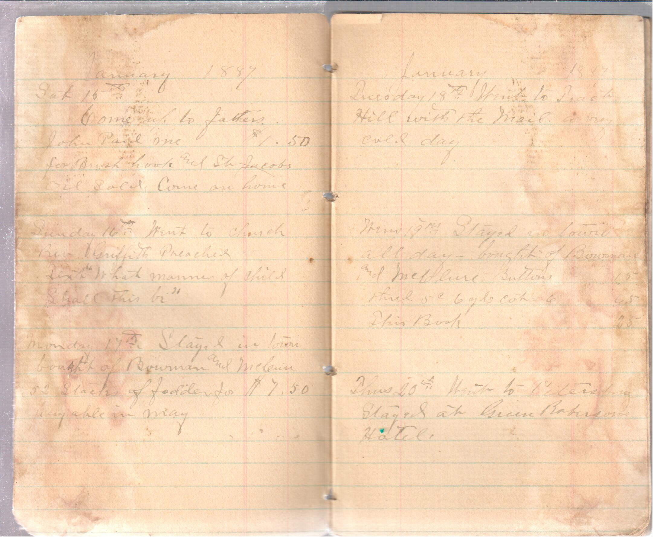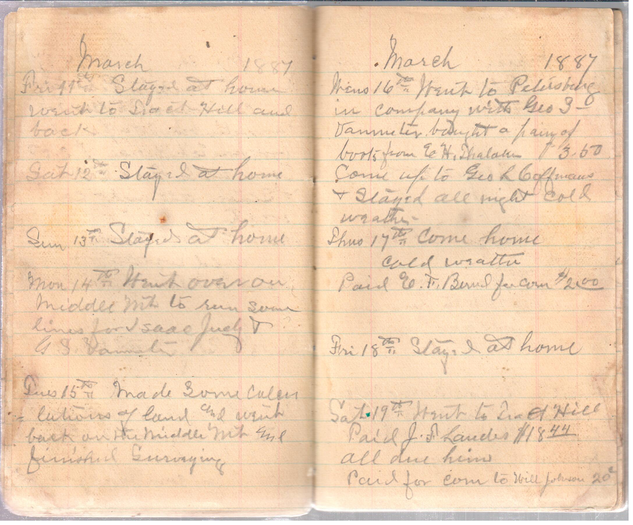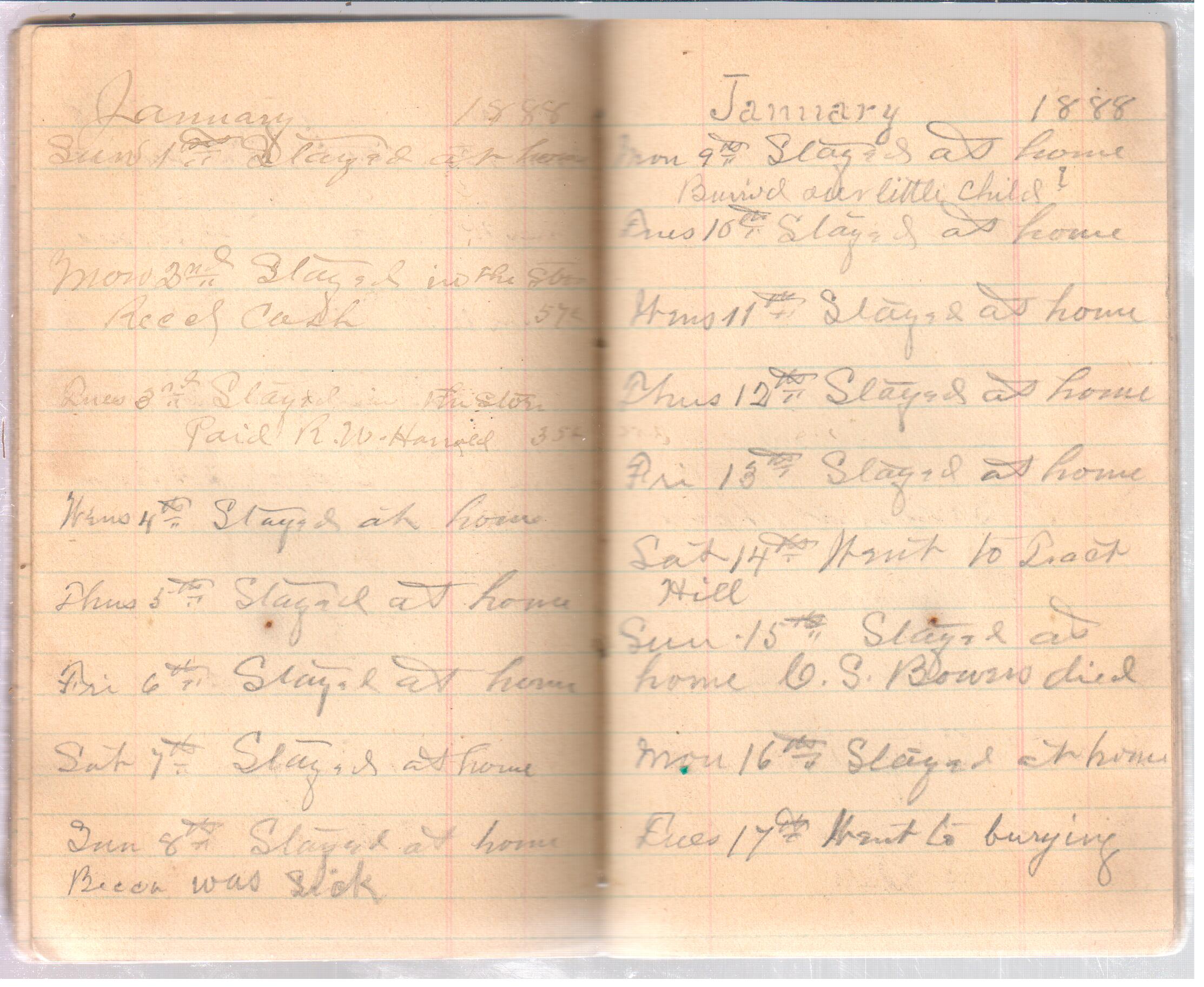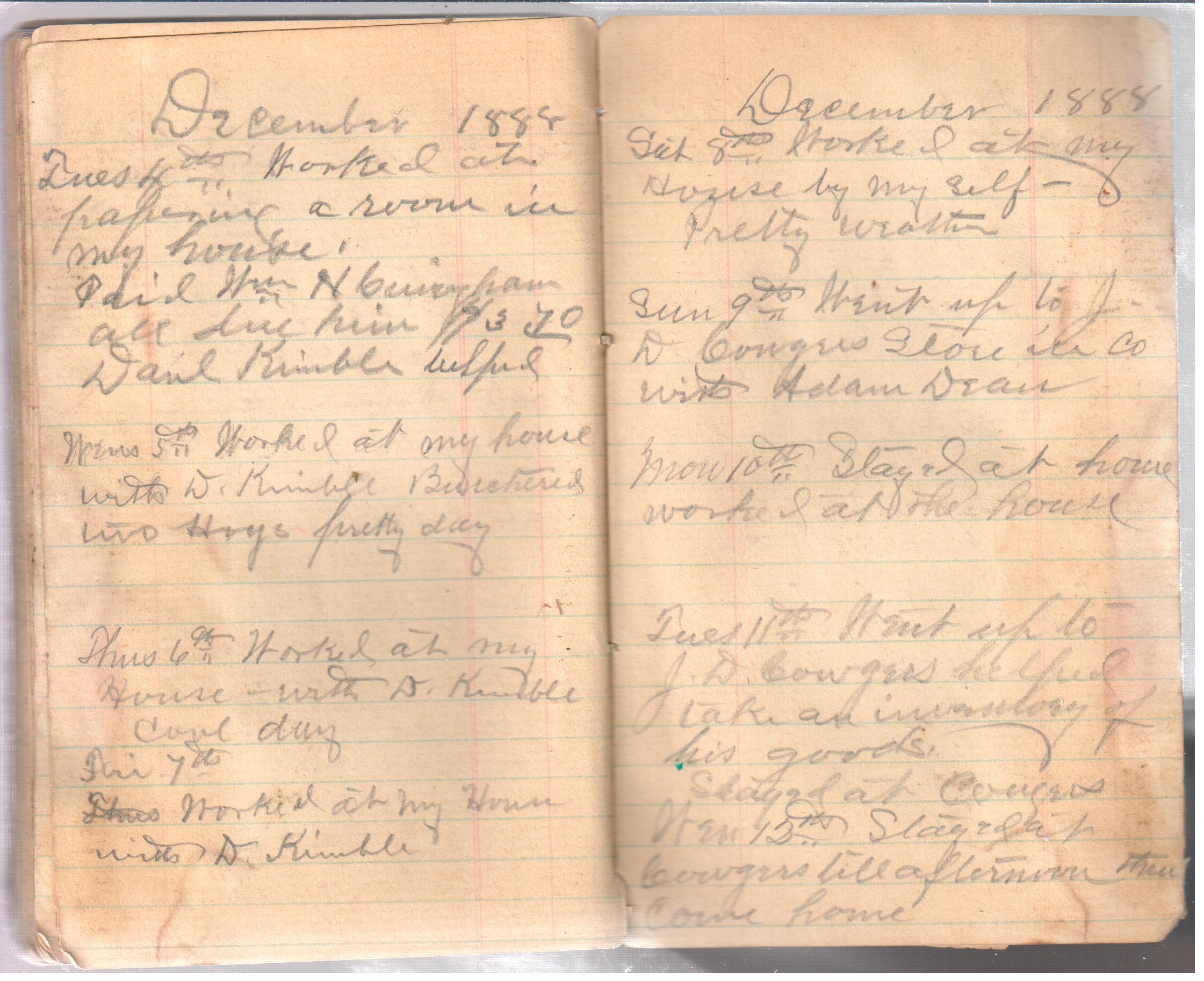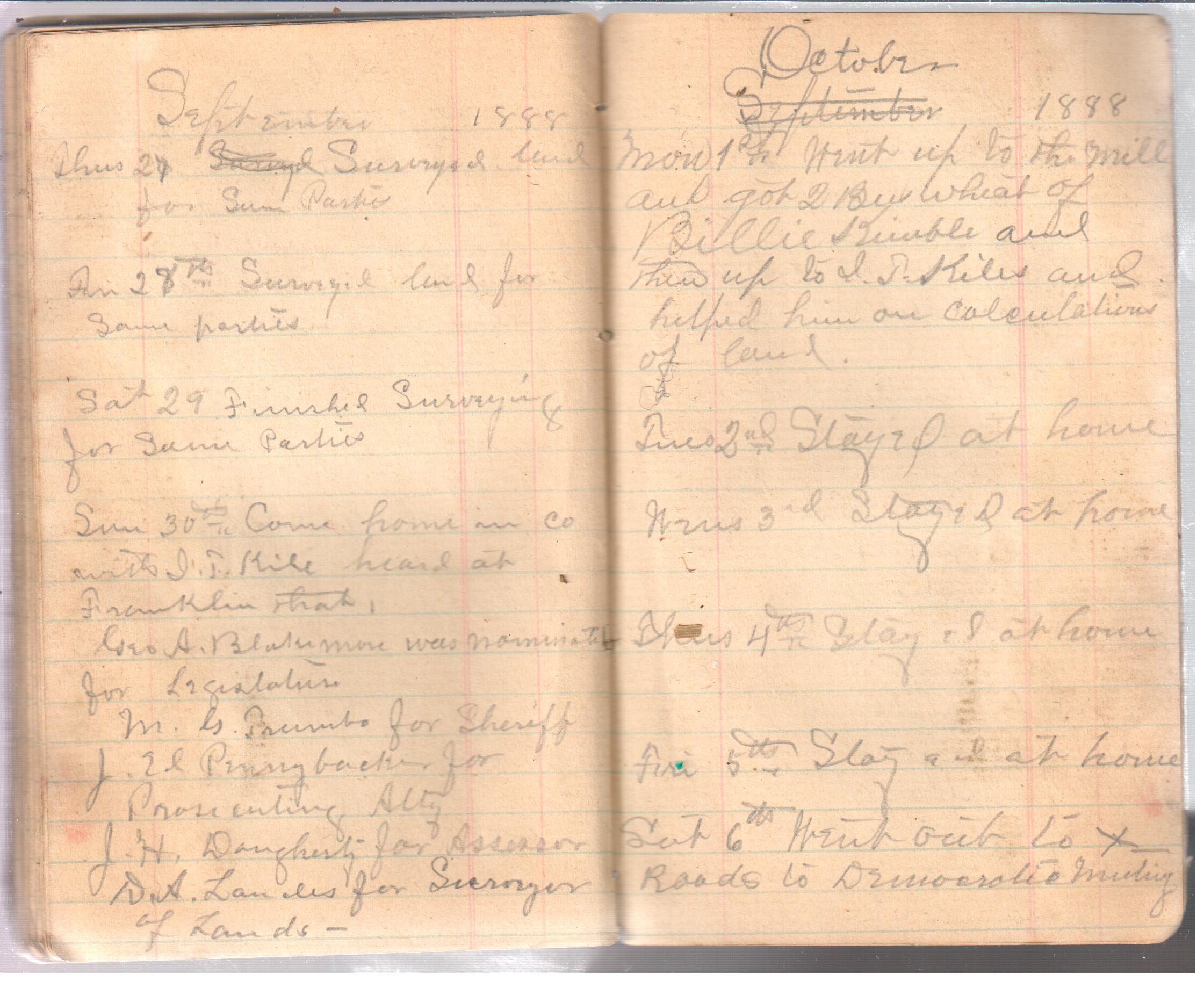D. A. Landes Diaries: 1887-1888-1889 Only the first 2 weeks of 1889 are entered in this diary. The majority of 1889 is entered in a separate diary. Use slideshow or see pages individually: Page 0 Pages 1-2 Pages 2-3 Pages 4-5 Pages 6-7 Pages 9-10 Pages 11-12 Pages 13-14 Pages 15-16 Pages 17-18 Pages 19-20 Pages 21-22 Pages 23-24 Pages 25-26 Pages 27-28 Pages 29-30 Pages 31-32 Pages 33-34 Pages 35-36 Pages 37-38 Pages 39-40 Pages 41-42 Pages 43-44 Pages 45-46 Pages 47-48 Pages 49-50 Pages 51-52 Pages 53-54 Pages 55-56 Pages 57-58 Pages 59-60 Pages 61-62 Pages 63-64 Pages 65-66 Pages 67-68 Pages 69-70 Pages 71-72 Pages 73-74 Pages 75-76 Pages 77-78 Pages 79-80 Pages 81-82 Pages 83-84 Pages 85-86 Pages 87-88 Pages 89-90 Pages 91-92 Pages 93-94 Pages 95-96 Pages 97-98 Pages 99-100 Pages 101-102 Pages 103-104 Pages 105-106 Pages 107-108 Pages 109-110 Pages 111-112 Pages 113-114 Pages 115-116 Pages 117-118 Pages 119-120 Pages 121-122 Pages 123-124 Pages 125-126 Pages 127-128 Pages 129-130 Pages 131-132 Pages 133-134 Pages 135-136 Pages 137-138 Pages 139-140 Pages 141-142 Pages 143-144 Pages 145-146