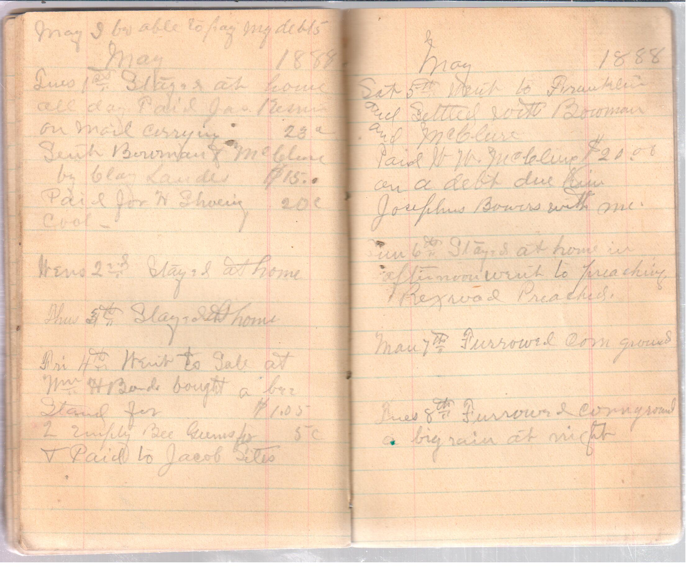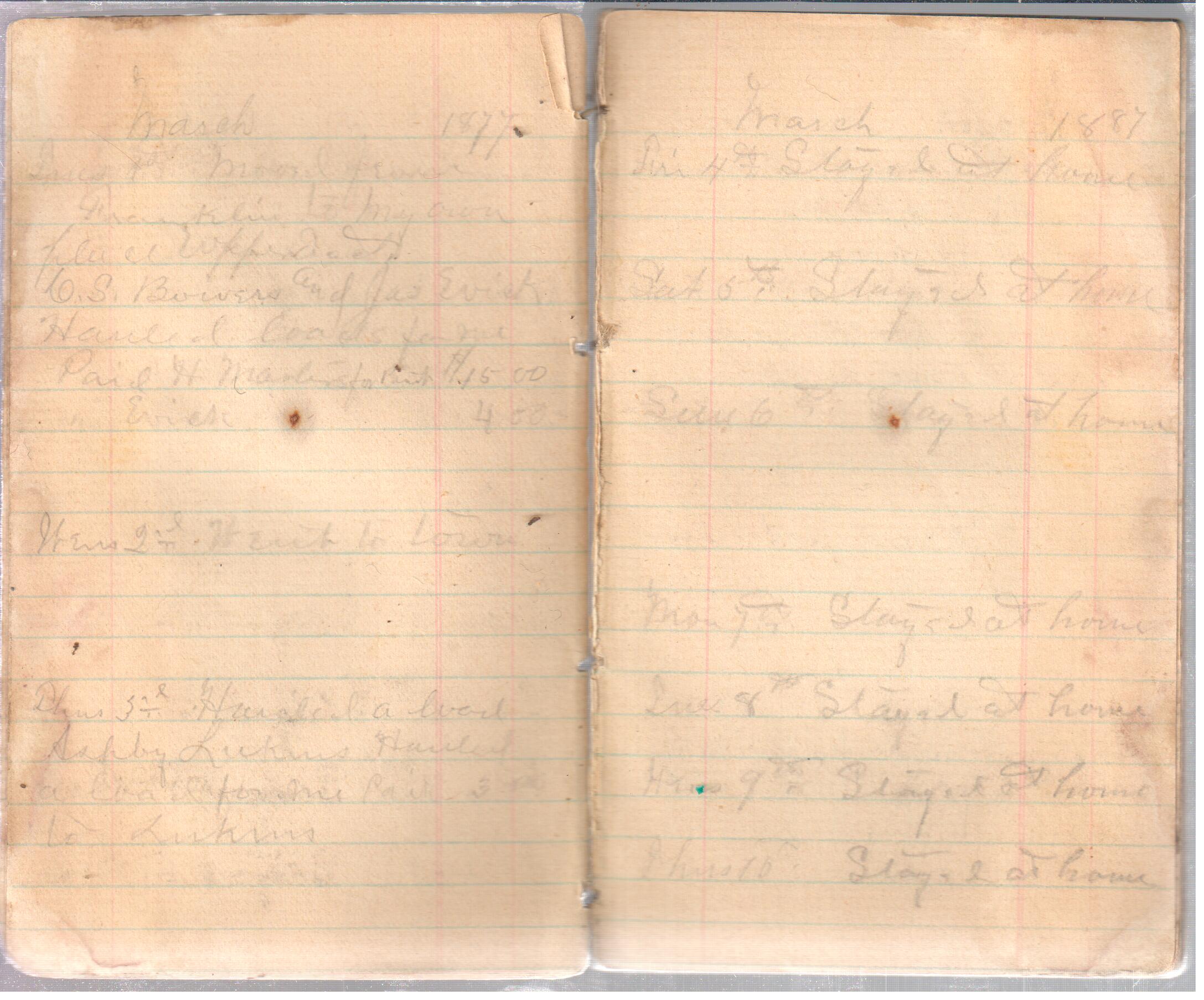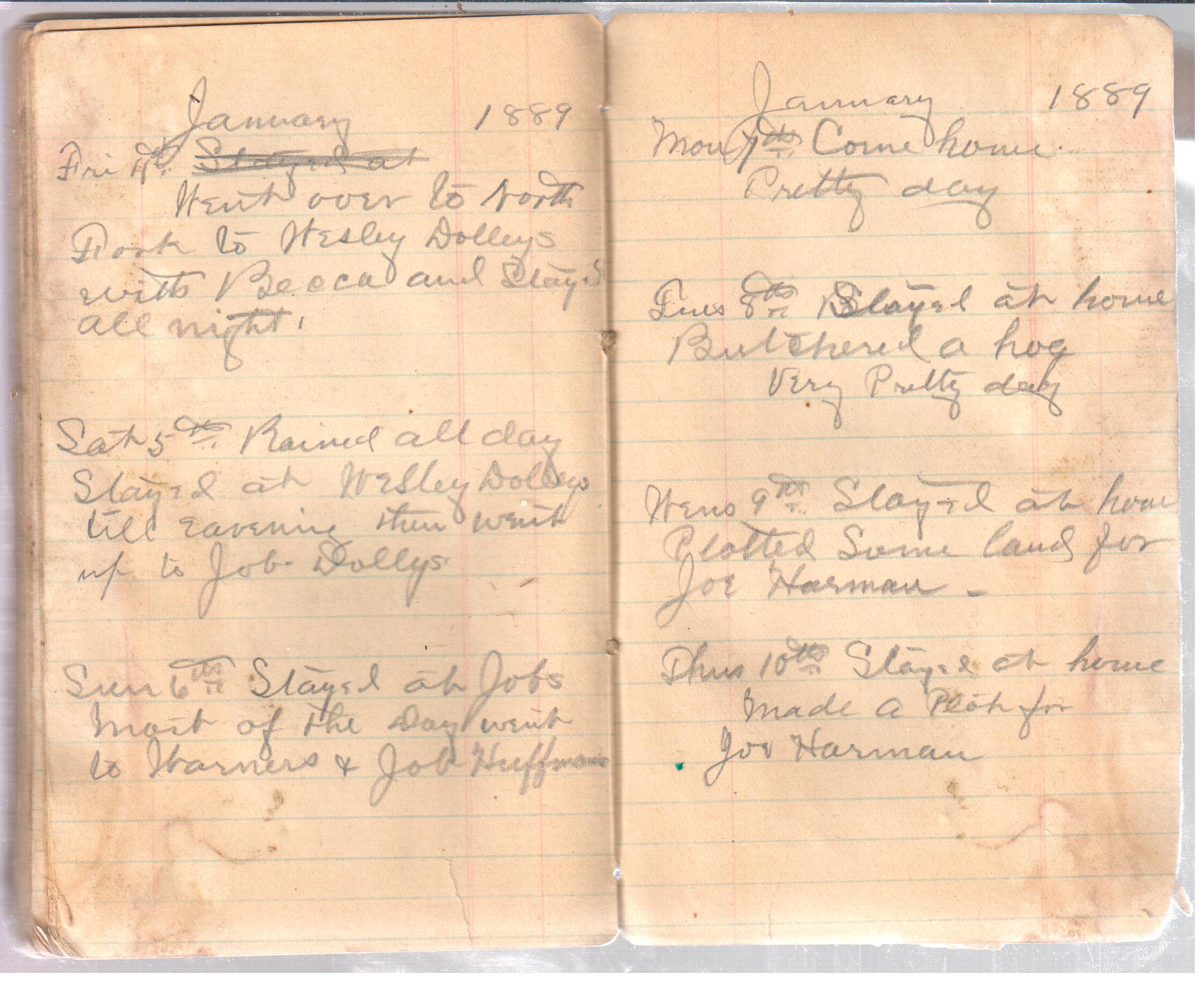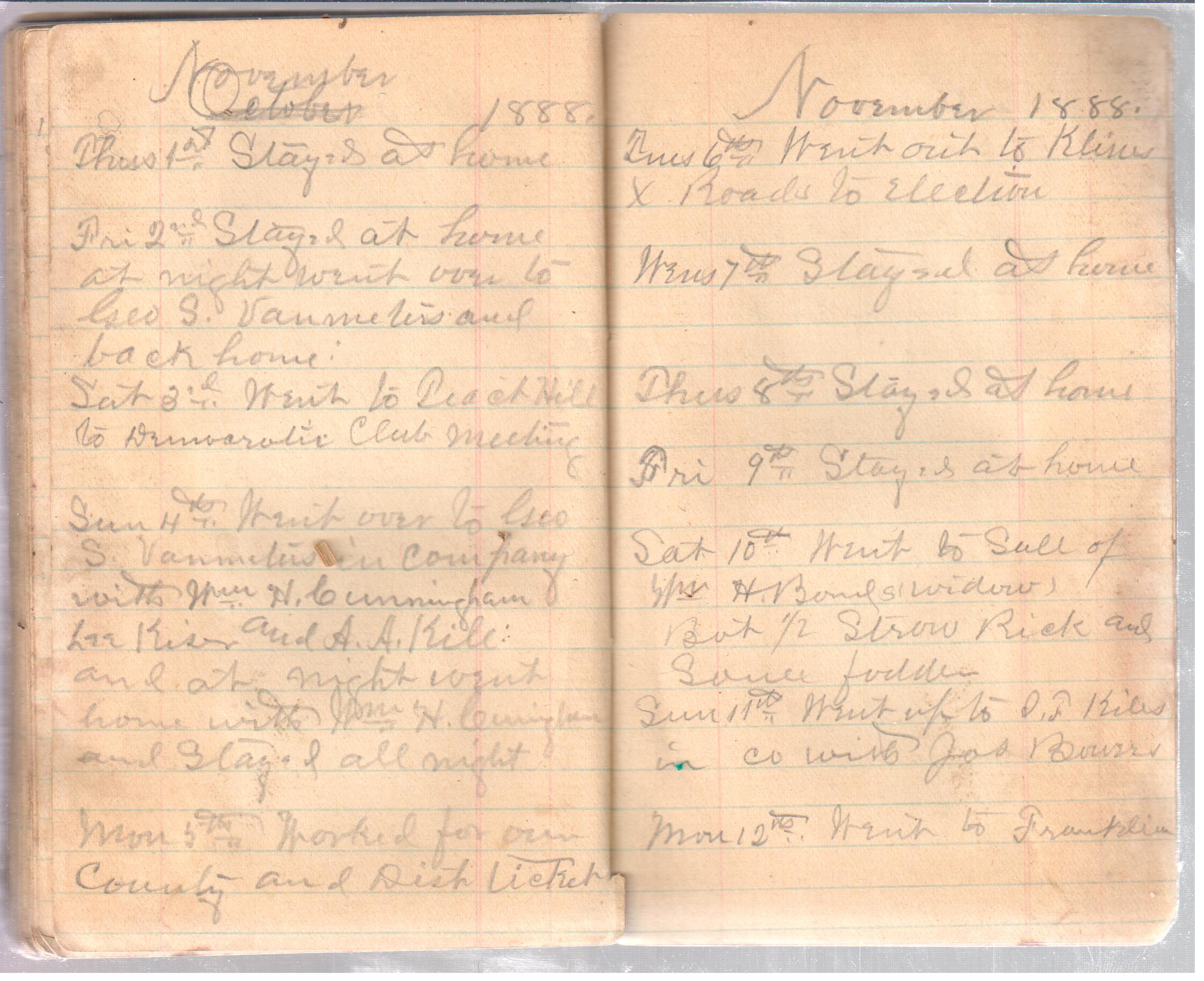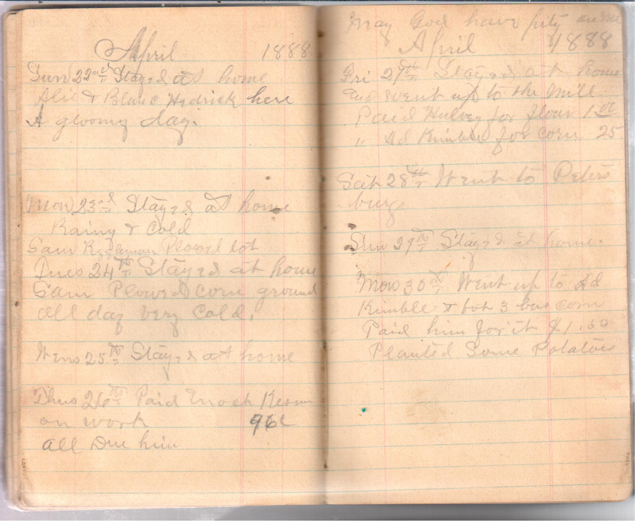D. A. Landes Diaries: 1887-1888-1889 Only the first 2 weeks of 1889 are entered in this diary. The majority of 1889 is entered in a separate diary. Use slideshow or see pages individually: Page 0 Pages 1-2 Pages 2-3 Pages 4-5 Pages 6-7 Pages 9-10 Pages 11-12 Pages 13-14 Pages 15-16 Pages 17-18 Pages 19-20 Pages 21-22 Pages 23-24 Pages 25-26 Pages 27-28 Pages 29-30 Pages 31-32 Pages 33-34 Pages 35-36 Pages 37-38 Pages 39-40 Pages 41-42 Pages 43-44 Pages 45-46 Pages 47-48 Pages 49-50 Pages 51-52 Pages 53-54 Pages 55-56 Pages 57-58 Pages 59-60 Pages 61-62 Pages 63-64 Pages 65-66 Pages 67-68 Pages 69-70 Pages 71-72 Pages 73-74 Pages 75-76 Pages 77-78 Pages 79-80 Pages 81-82 Pages 83-84 Pages 85-86 Pages 87-88 Pages 89-90 Pages 91-92 Pages 93-94 Pages 95-96 Pages 97-98 Pages 99-100 Pages 101-102 Pages 103-104 Pages 105-106 Pages 107-108 Pages 109-110 Pages 111-112 Pages 113-114 Pages 115-116 Pages 117-118 Pages 119-120 Pages 121-122 Pages 123-124 Pages 125-126 Pages 127-128 Pages 129-130 Pages 131-132 Pages 133-134 Pages 135-136 Pages 137-138 Pages 139-140 Pages 141-142 Pages 143-144 Pages 145-146