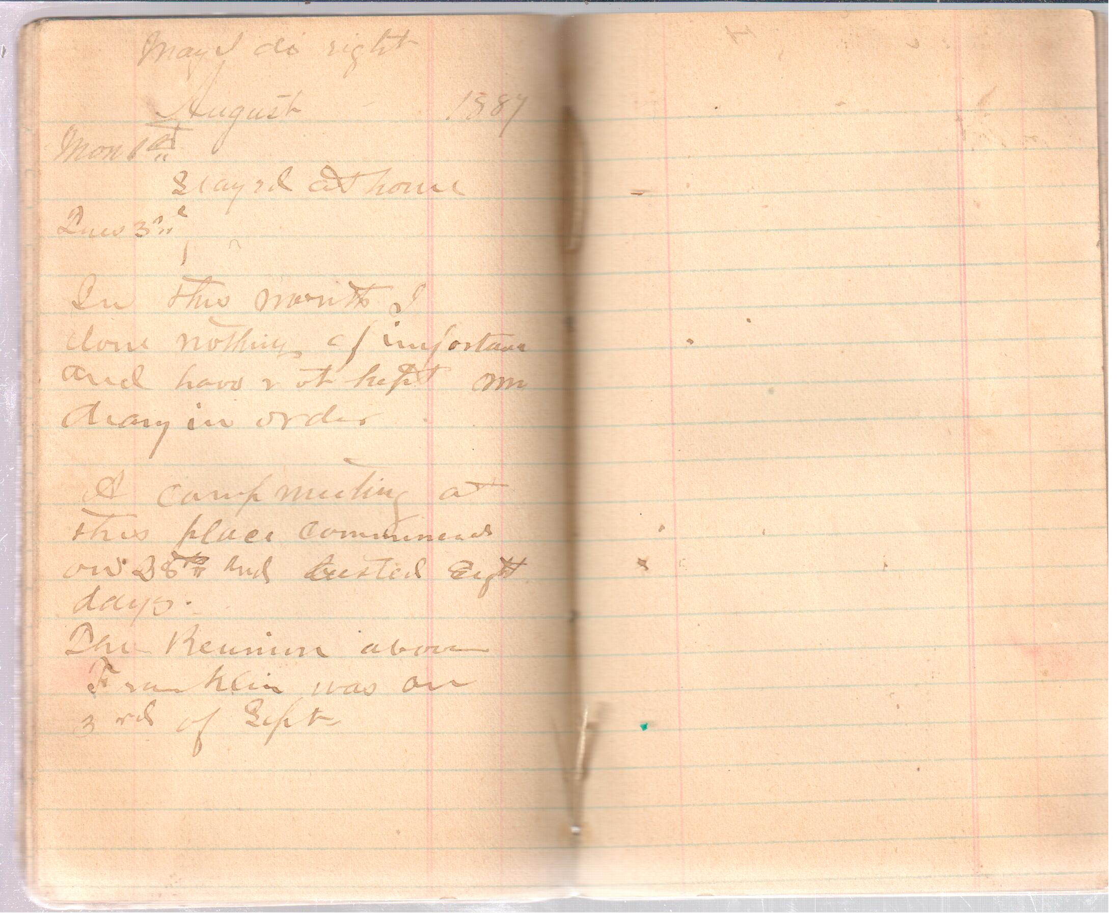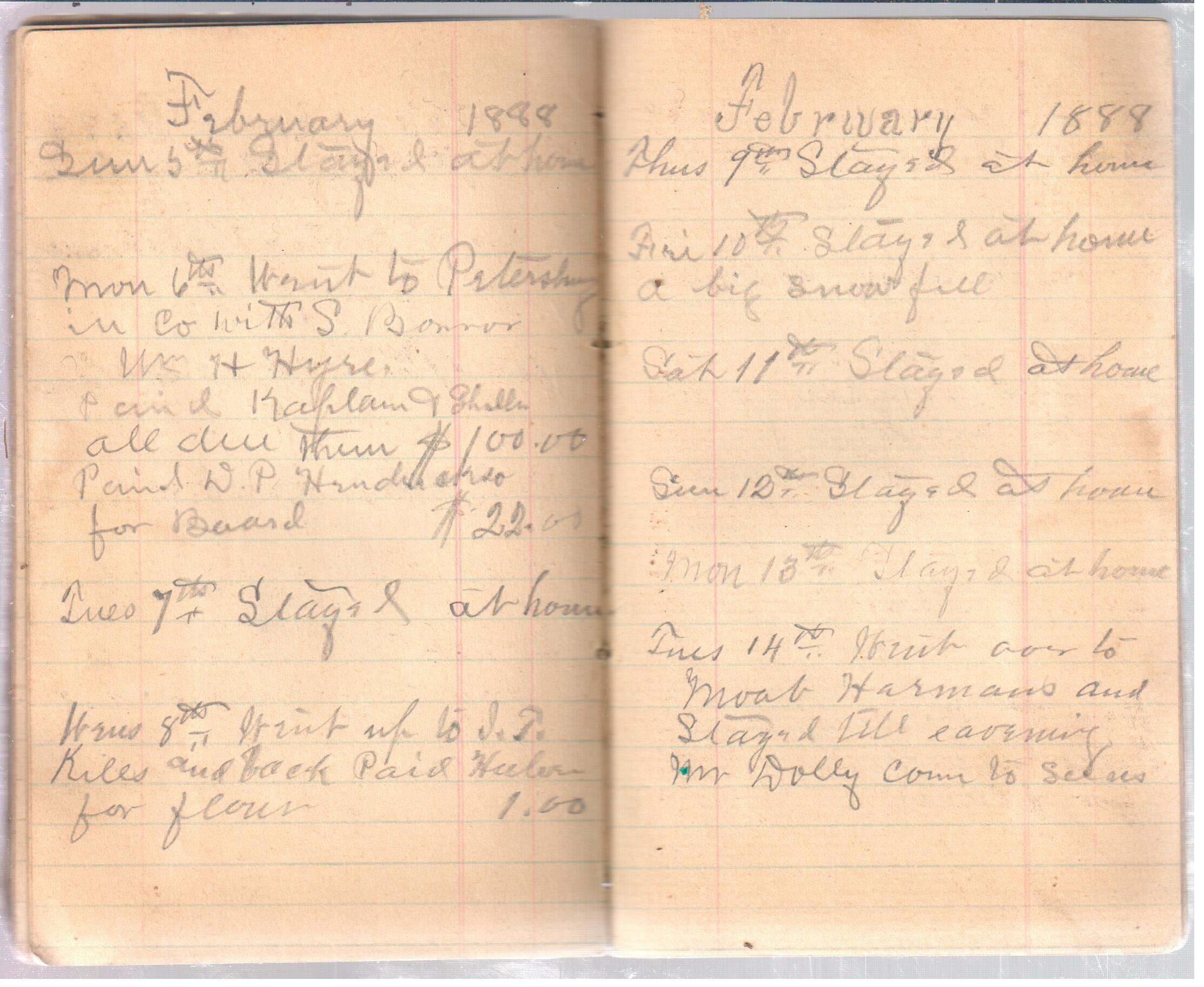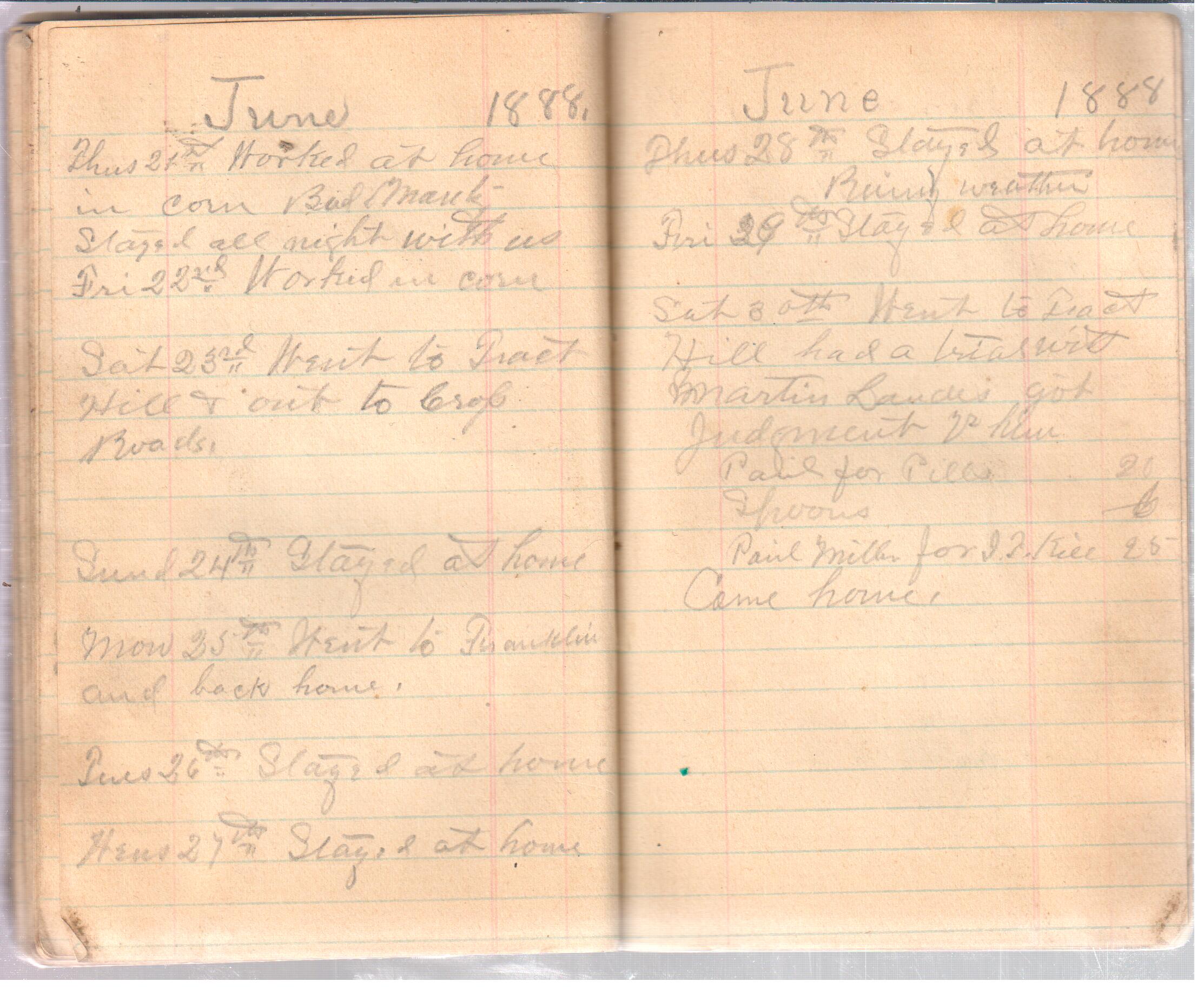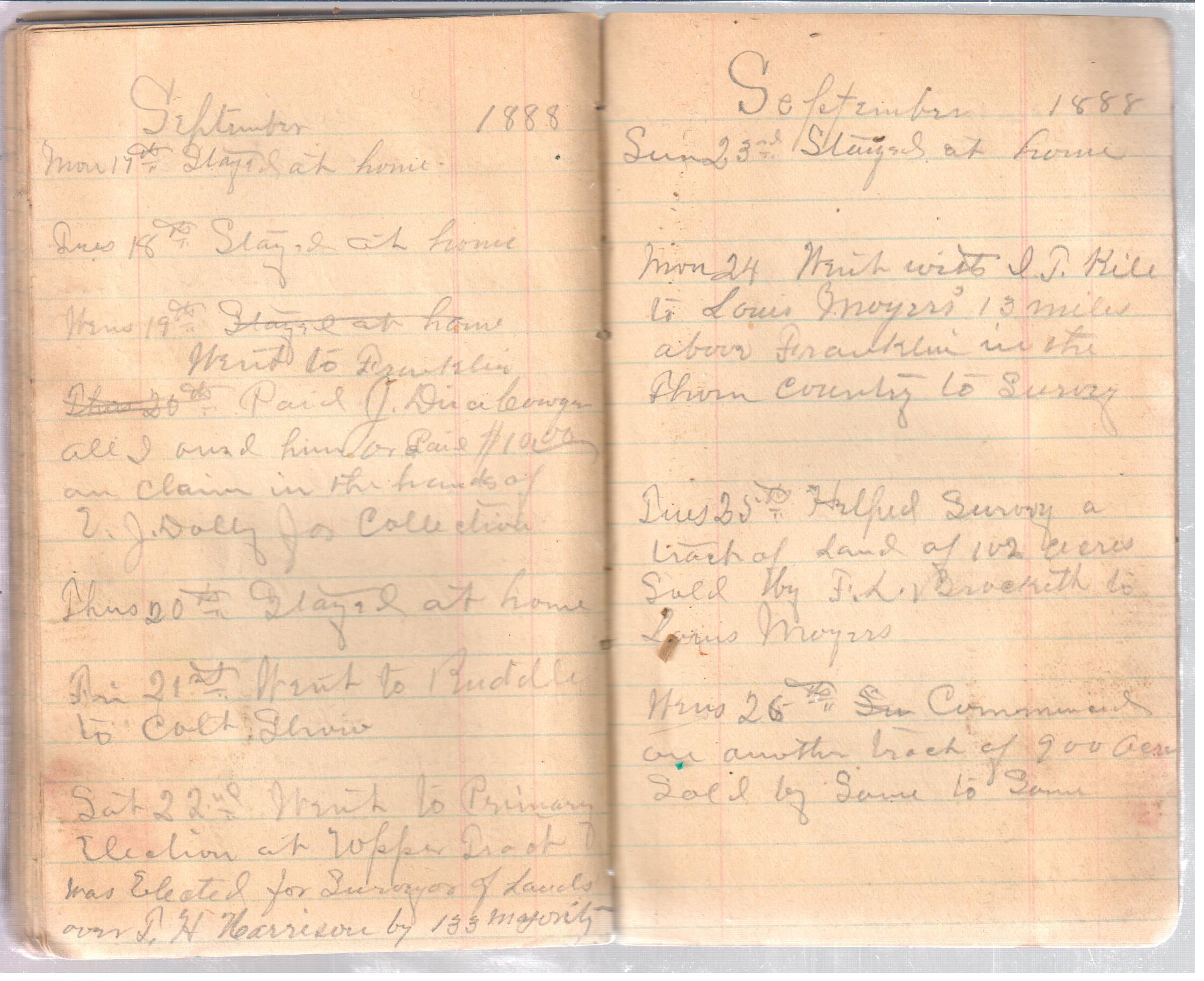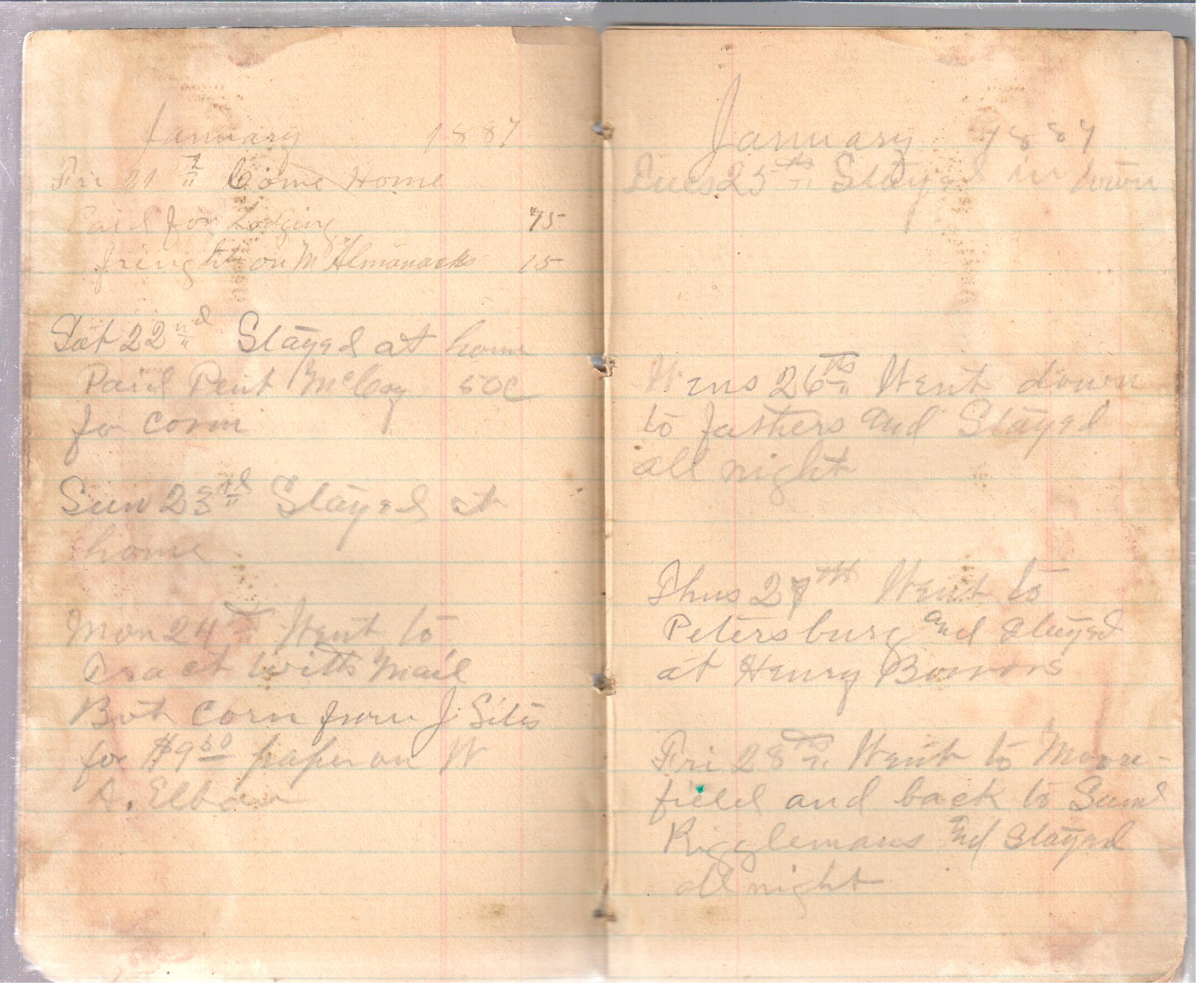 D. A. Landes Diaries: 1887-1888-1889 Only the first 2 weeks of 1889 are entered in this diary. The majority of 1889 is entered in a separate diary. Use slideshow or see pages individually: Page 0 Pages 1-2 Pages 2-3 Pages 4-5 Pages 6-7 Pages 9-10 Pages 11-12 Pages 13-14 Pages 15-16 Pages 17-18 Pages 19-20 Pages 21-22 Pages 23-24 Pages 25-26 Pages 27-28 Pages 29-30 Pages 31-32 Pages 33-34 Pages 35-36 Pages 37-38 Pages 39-40 Pages 41-42 Pages 43-44 Pages 45-46 Pages 47-48 Pages 49-50 Pages 51-52 Pages 53-54 Pages 55-56 Pages 57-58 Pages 59-60 Pages 61-62 Pages 63-64 Pages 65-66 Pages 67-68 Pages 69-70 Pages 71-72 Pages 73-74 Pages 75-76 Pages 77-78 Pages 79-80 Pages 81-82 Pages 83-84 Pages 85-86 Pages 87-88 Pages 89-90 Pages 91-92 Pages 93-94 Pages 95-96 Pages 97-98 Pages 99-100 Pages 101-102 Pages 103-104 Pages 105-106 Pages 107-108 Pages 109-110 Pages 111-112 Pages 113-114 Pages 115-116 Pages 117-118 Pages 119-120 Pages 121-122 Pages 123-124 Pages 125-126 Pages 127-128 Pages 129-130 Pages 131-132 Pages 133-134 Pages 135-136 Pages 137-138 Pages 139-140 Pages 141-142 Pages 143-144 Pages 145-146