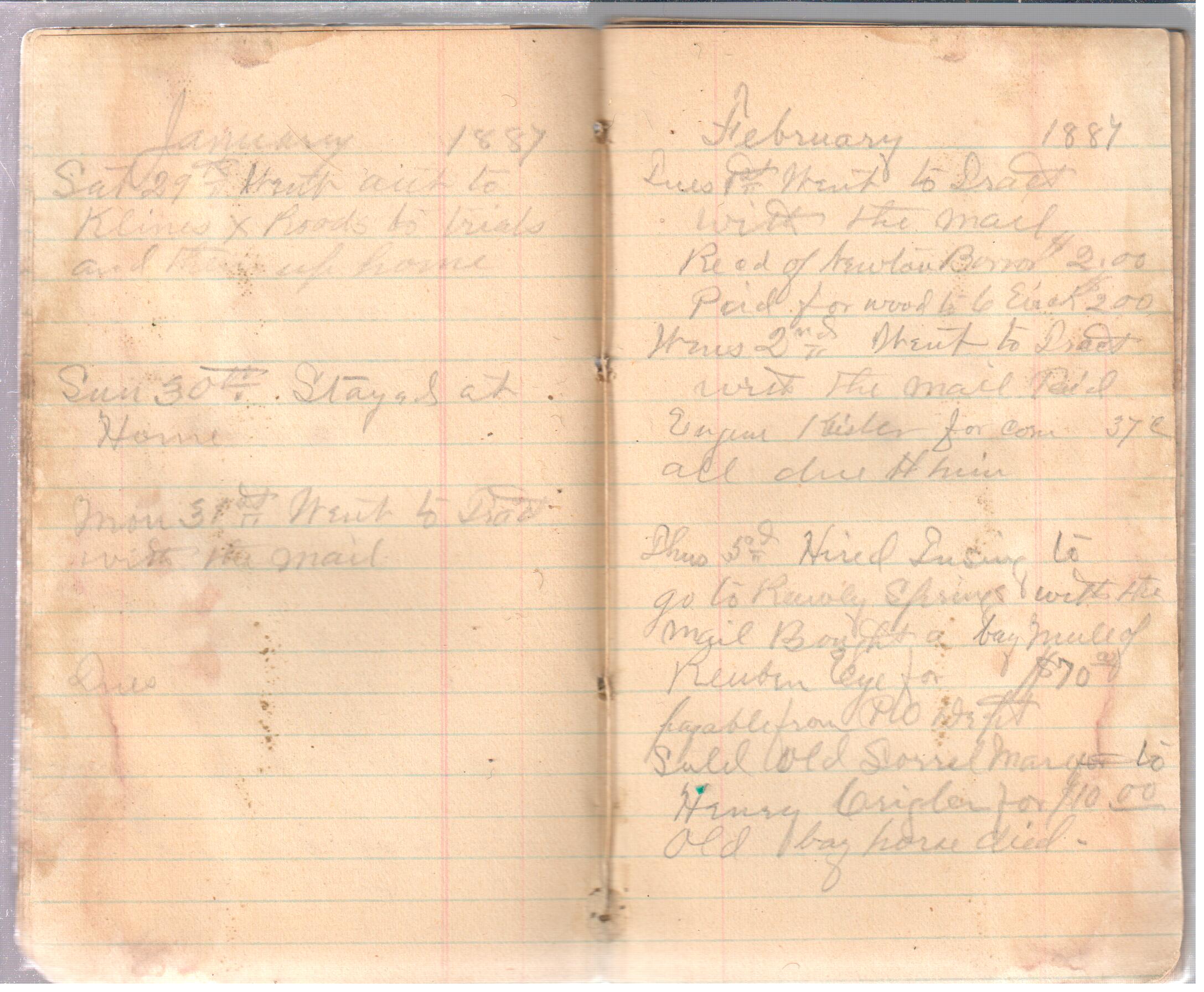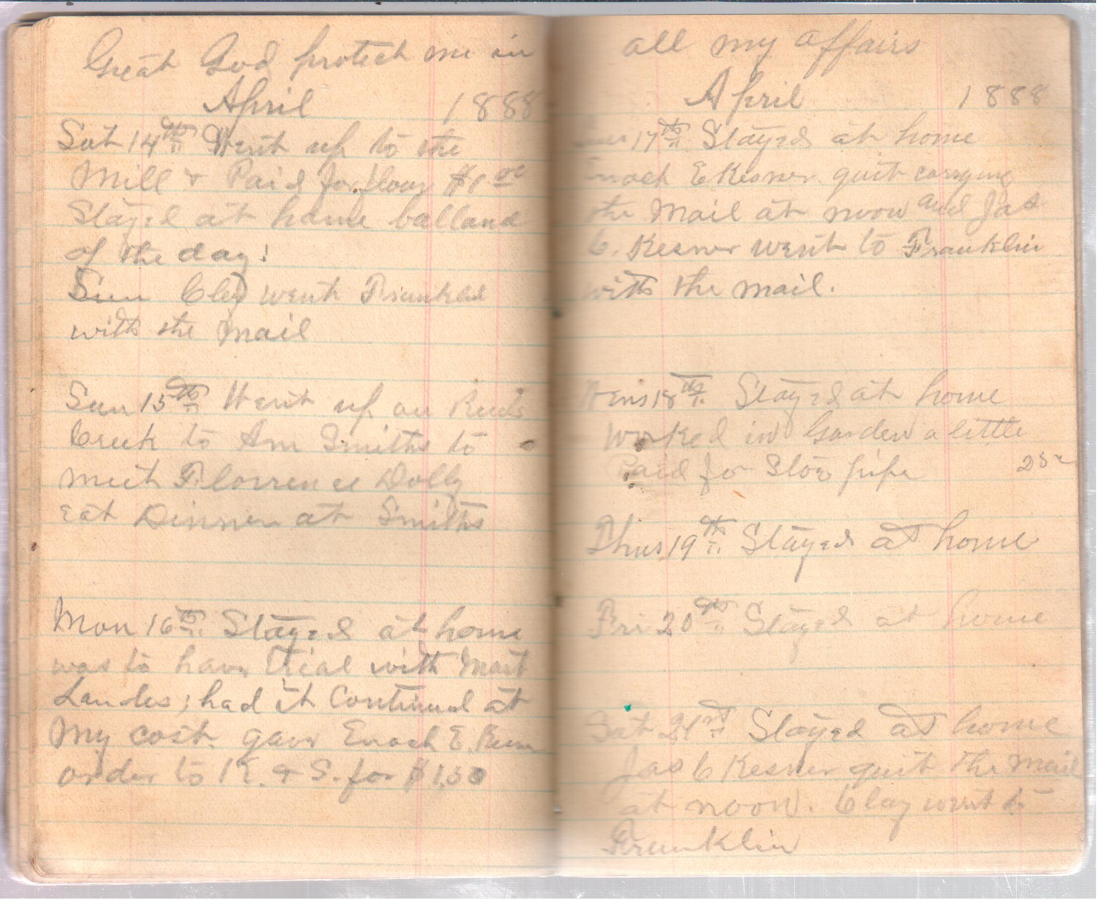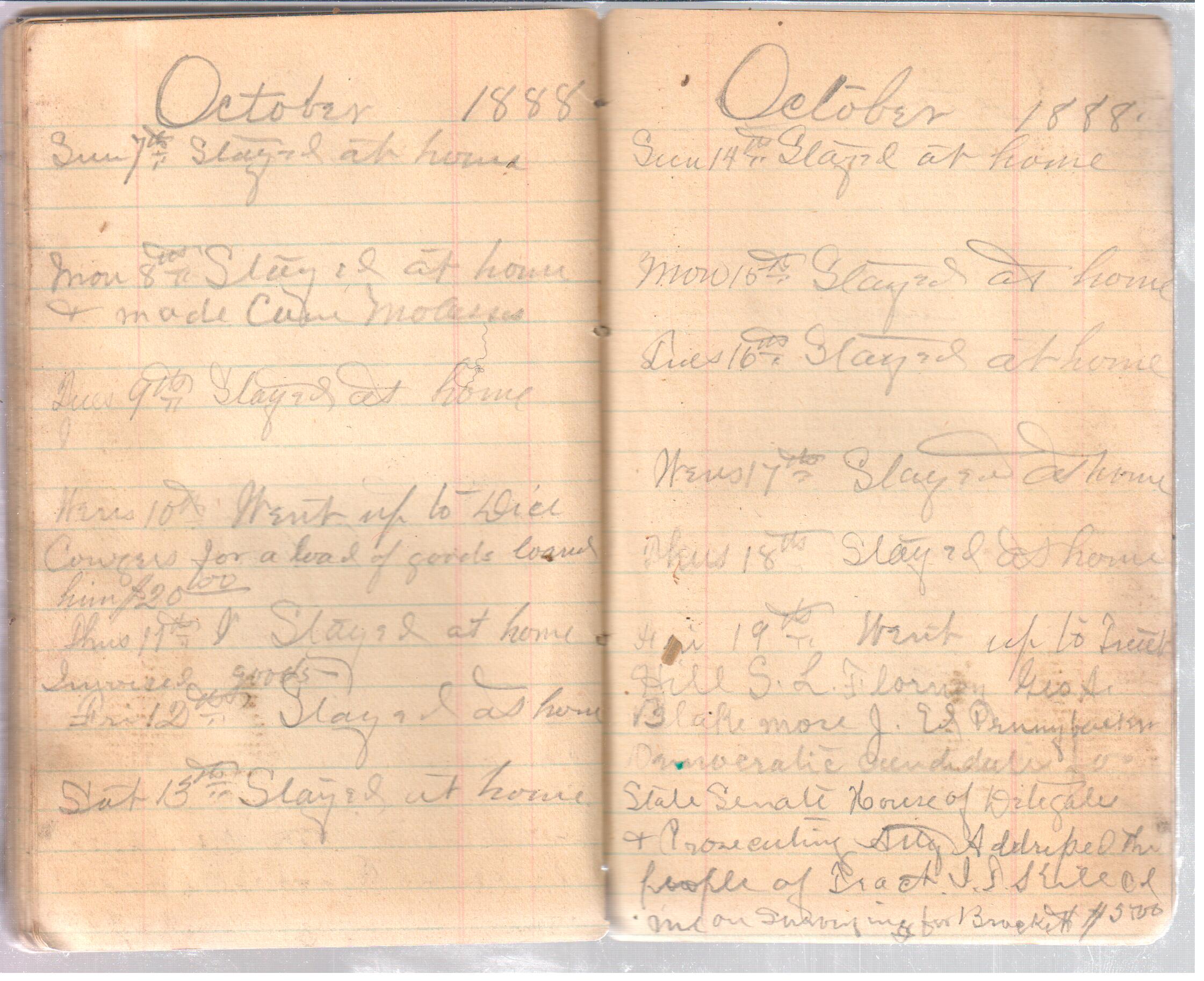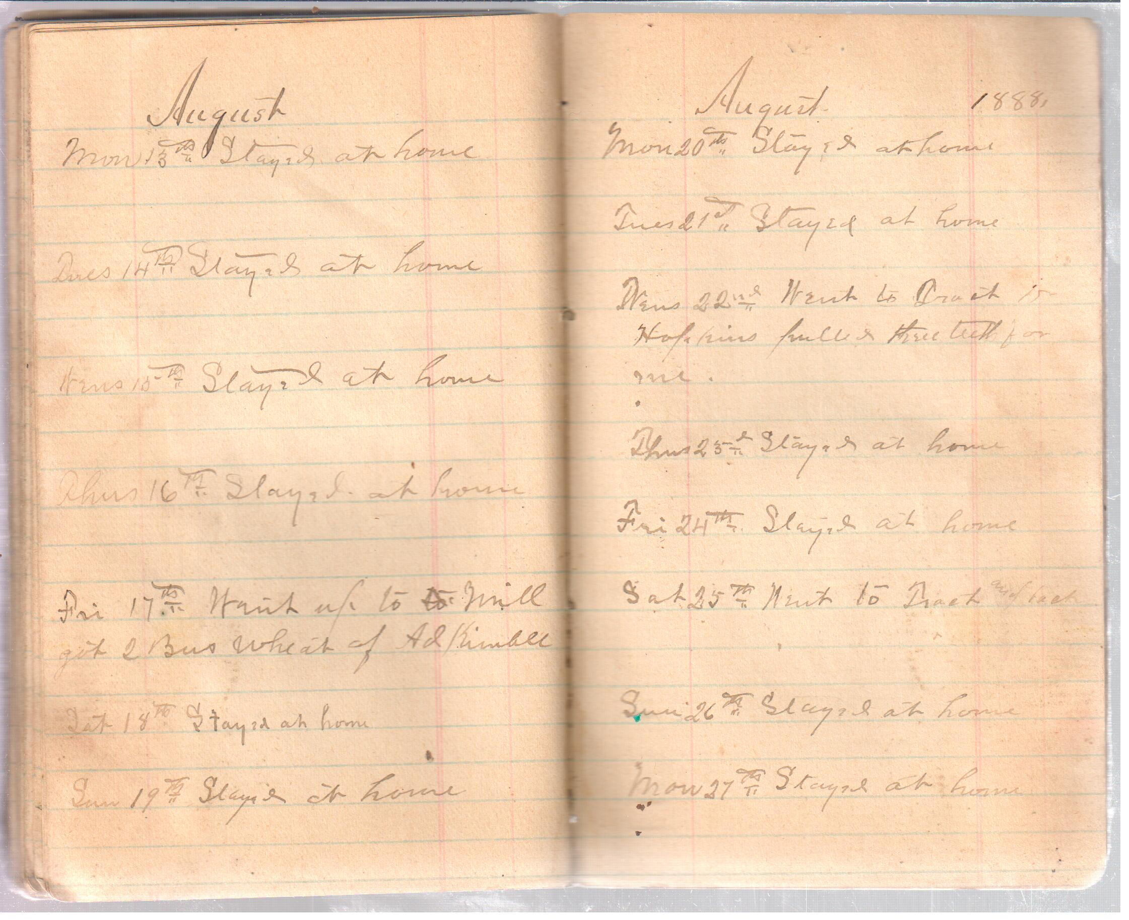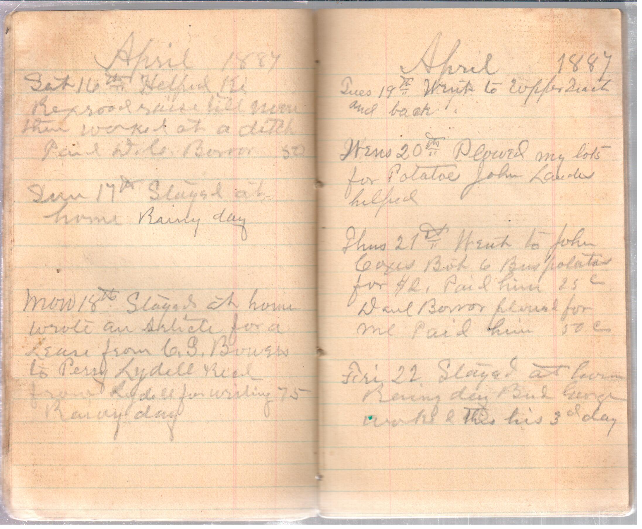 D. A. Landes Diaries: 1887-1888-1889 Only the first 2 weeks of 1889 are entered in this diary. The majority of 1889 is entered in a separate diary. Use slideshow or see pages individually: Page 0 Pages 1-2 Pages 2-3 Pages 4-5 Pages 6-7 Pages 9-10 Pages 11-12 Pages 13-14 Pages 15-16 Pages 17-18 Pages 19-20 Pages 21-22 Pages 23-24 Pages 25-26 Pages 27-28 Pages 29-30 Pages 31-32 Pages 33-34 Pages 35-36 Pages 37-38 Pages 39-40 Pages 41-42 Pages 43-44 Pages 45-46 Pages 47-48 Pages 49-50 Pages 51-52 Pages 53-54 Pages 55-56 Pages 57-58 Pages 59-60 Pages 61-62 Pages 63-64 Pages 65-66 Pages 67-68 Pages 69-70 Pages 71-72 Pages 73-74 Pages 75-76 Pages 77-78 Pages 79-80 Pages 81-82 Pages 83-84 Pages 85-86 Pages 87-88 Pages 89-90 Pages 91-92 Pages 93-94 Pages 95-96 Pages 97-98 Pages 99-100 Pages 101-102 Pages 103-104 Pages 105-106 Pages 107-108 Pages 109-110 Pages 111-112 Pages 113-114 Pages 115-116 Pages 117-118 Pages 119-120 Pages 121-122 Pages 123-124 Pages 125-126 Pages 127-128 Pages 129-130 Pages 131-132 Pages 133-134 Pages 135-136 Pages 137-138 Pages 139-140 Pages 141-142 Pages 143-144 Pages 145-146