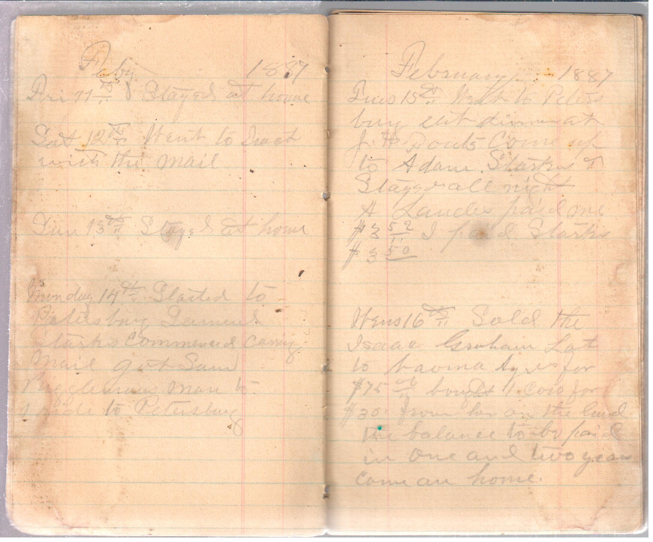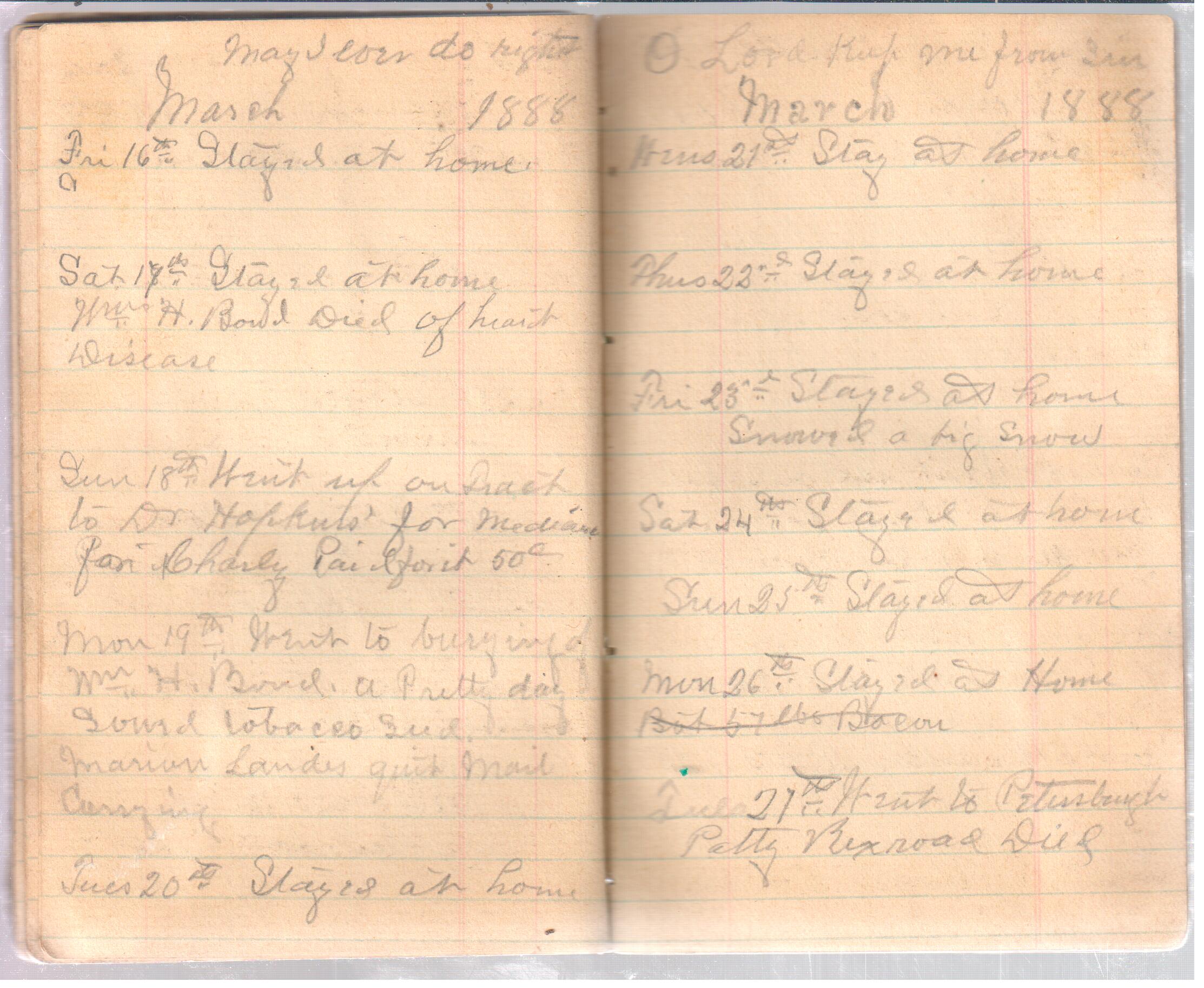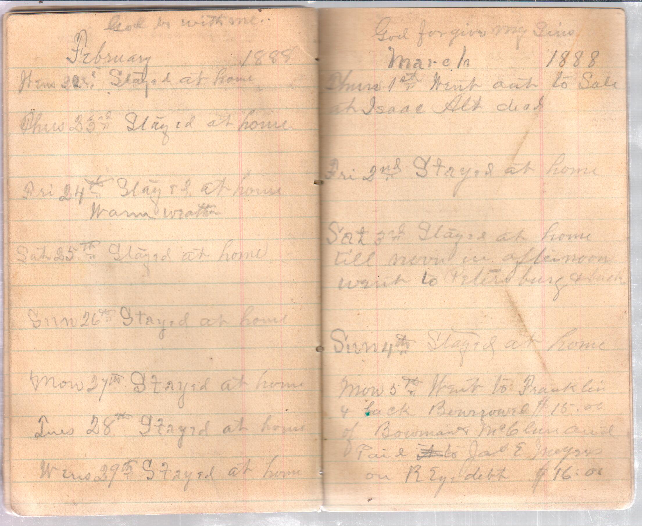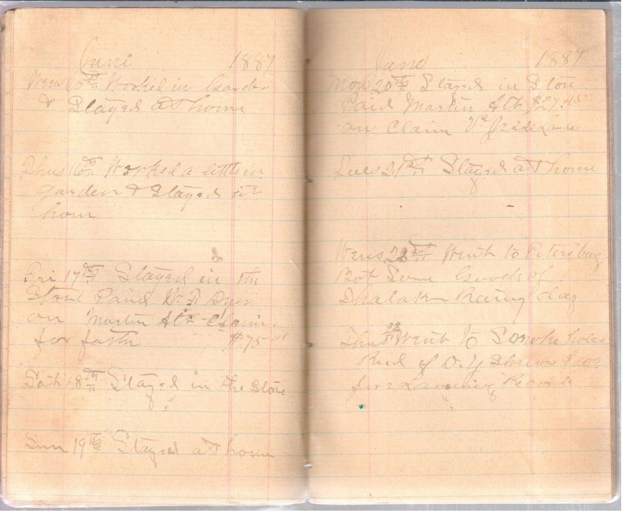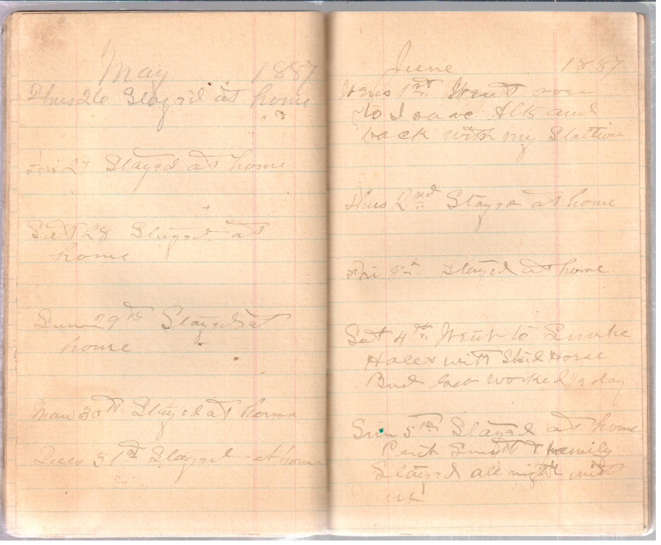 D. A. Landes Diaries: 1887-1888-1889 Only the first 2 weeks of 1889 are entered in this diary. The majority of 1889 is entered in a separate diary. Use slideshow or see pages individually: Page 0 Pages 1-2 Pages 2-3 Pages 4-5 Pages 6-7 Pages 9-10 Pages 11-12 Pages 13-14 Pages 15-16 Pages 17-18 Pages 19-20 Pages 21-22 Pages 23-24 Pages 25-26 Pages 27-28 Pages 29-30 Pages 31-32 Pages 33-34 Pages 35-36 Pages 37-38 Pages 39-40 Pages 41-42 Pages 43-44 Pages 45-46 Pages 47-48 Pages 49-50 Pages 51-52 Pages 53-54 Pages 55-56 Pages 57-58 Pages 59-60 Pages 61-62 Pages 63-64 Pages 65-66 Pages 67-68 Pages 69-70 Pages 71-72 Pages 73-74 Pages 75-76 Pages 77-78 Pages 79-80 Pages 81-82 Pages 83-84 Pages 85-86 Pages 87-88 Pages 89-90 Pages 91-92 Pages 93-94 Pages 95-96 Pages 97-98 Pages 99-100 Pages 101-102 Pages 103-104 Pages 105-106 Pages 107-108 Pages 109-110 Pages 111-112 Pages 113-114 Pages 115-116 Pages 117-118 Pages 119-120 Pages 121-122 Pages 123-124 Pages 125-126 Pages 127-128 Pages 129-130 Pages 131-132 Pages 133-134 Pages 135-136 Pages 137-138 Pages 139-140 Pages 141-142 Pages 143-144 Pages 145-146