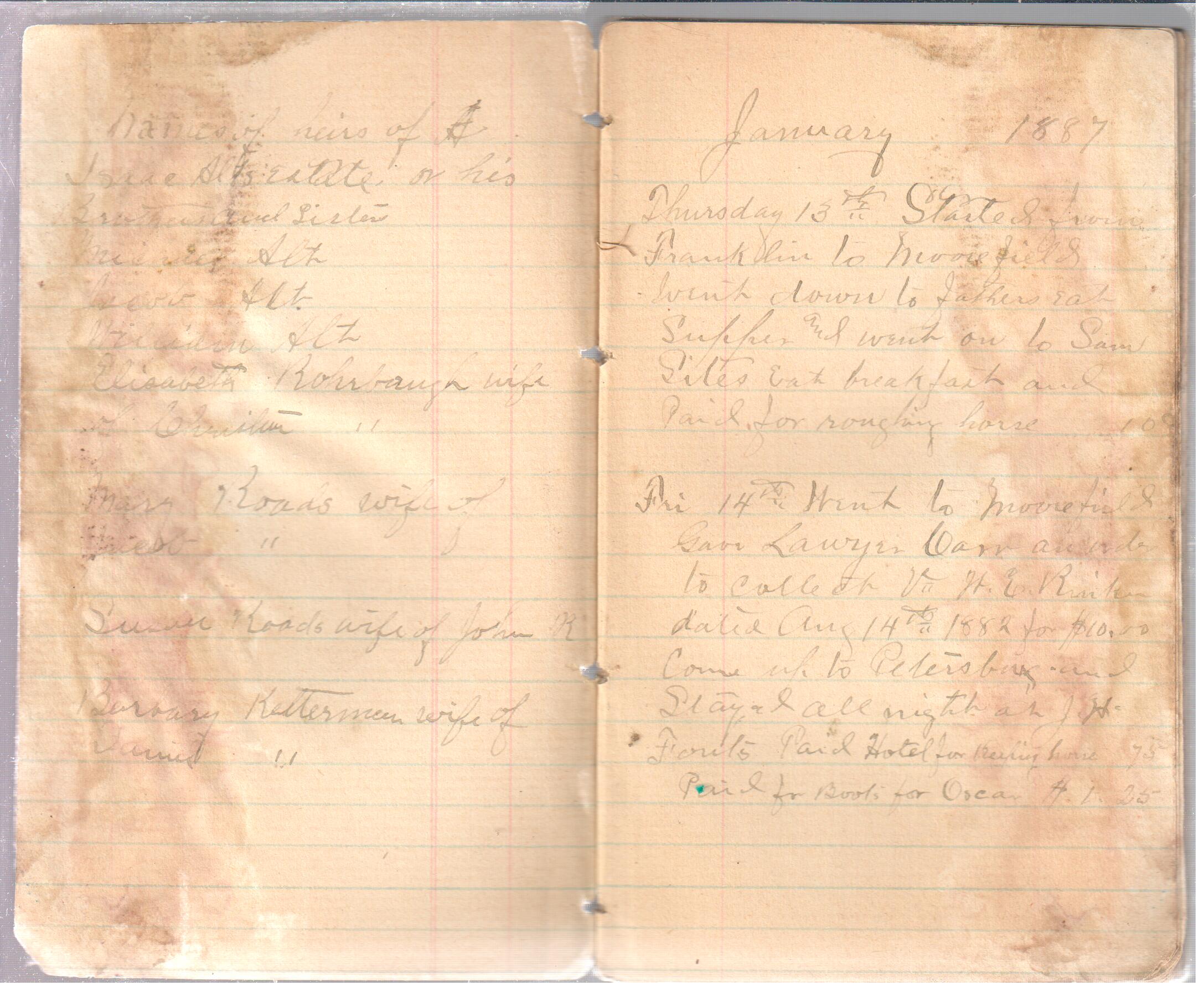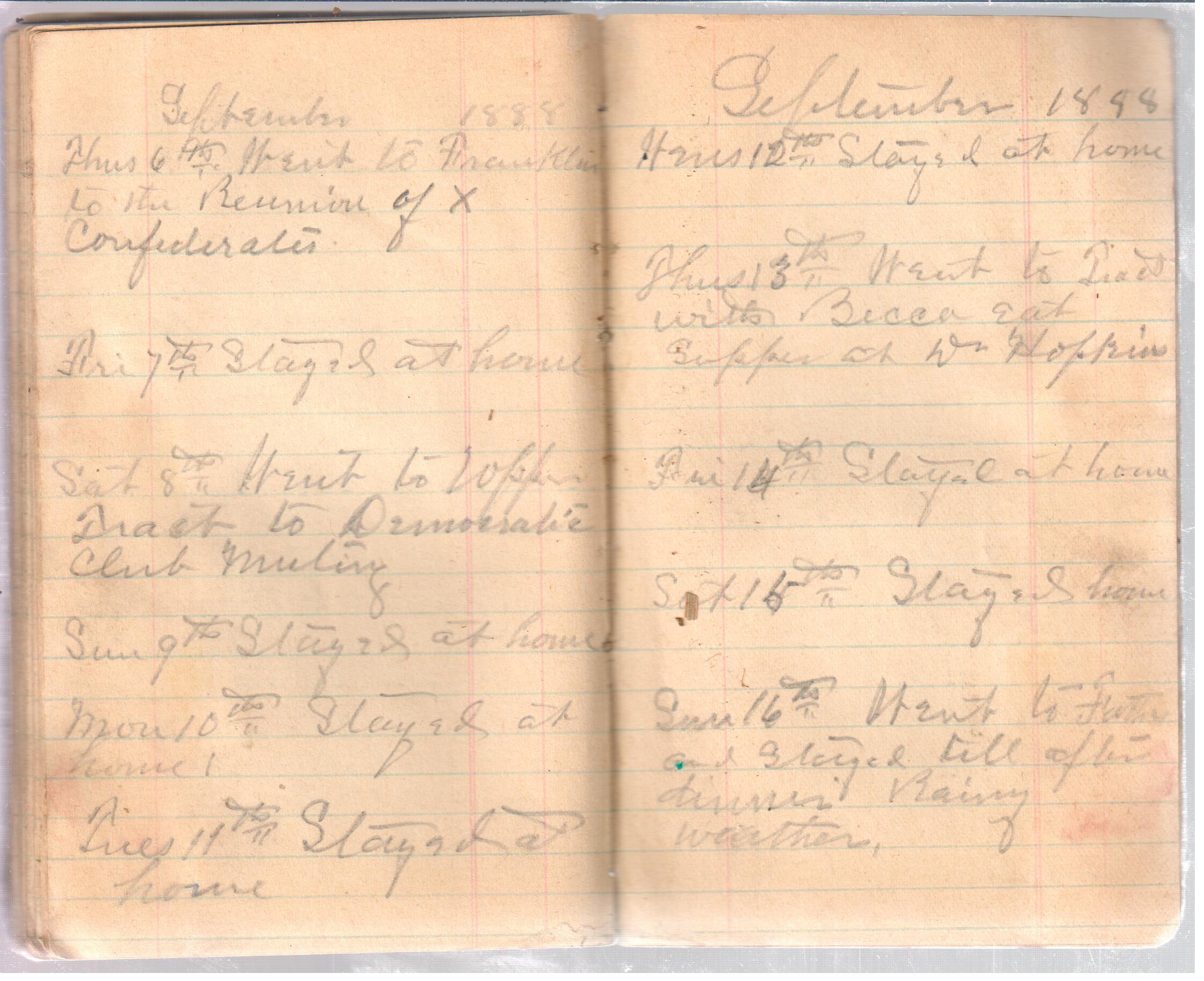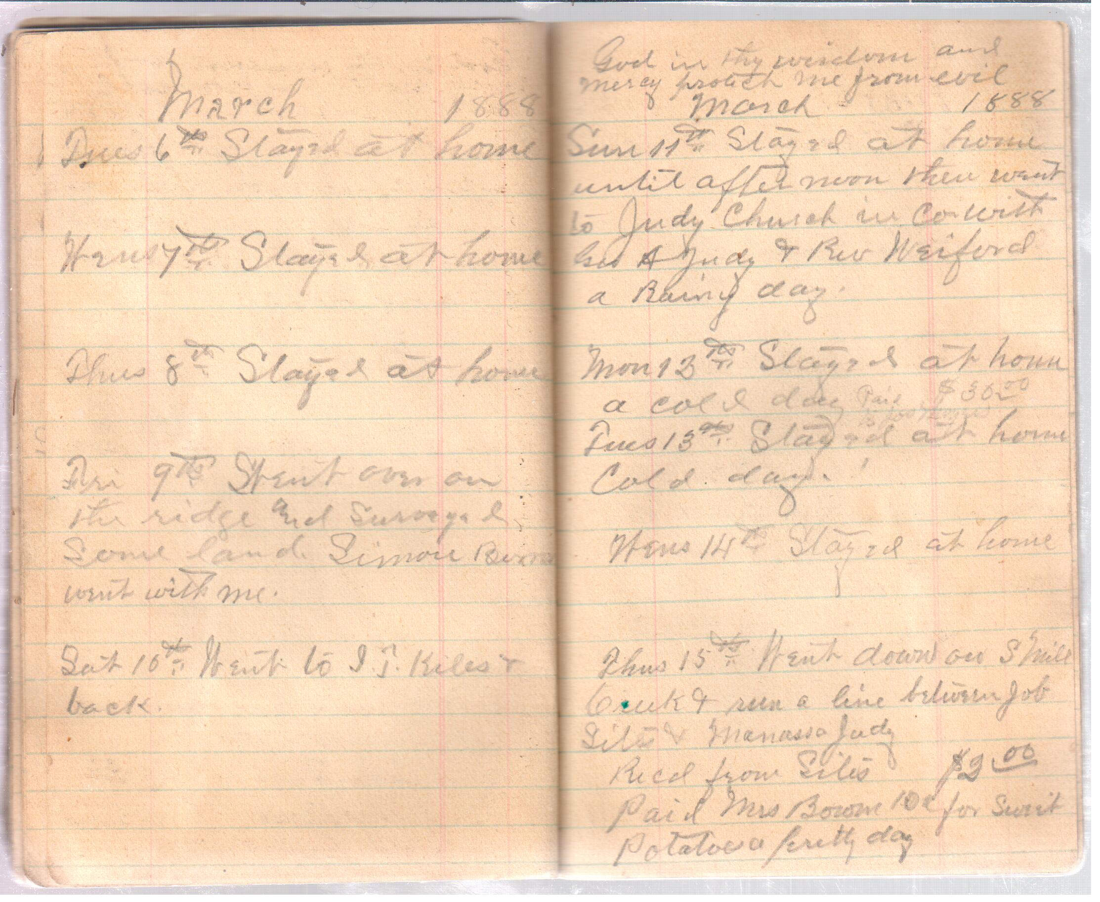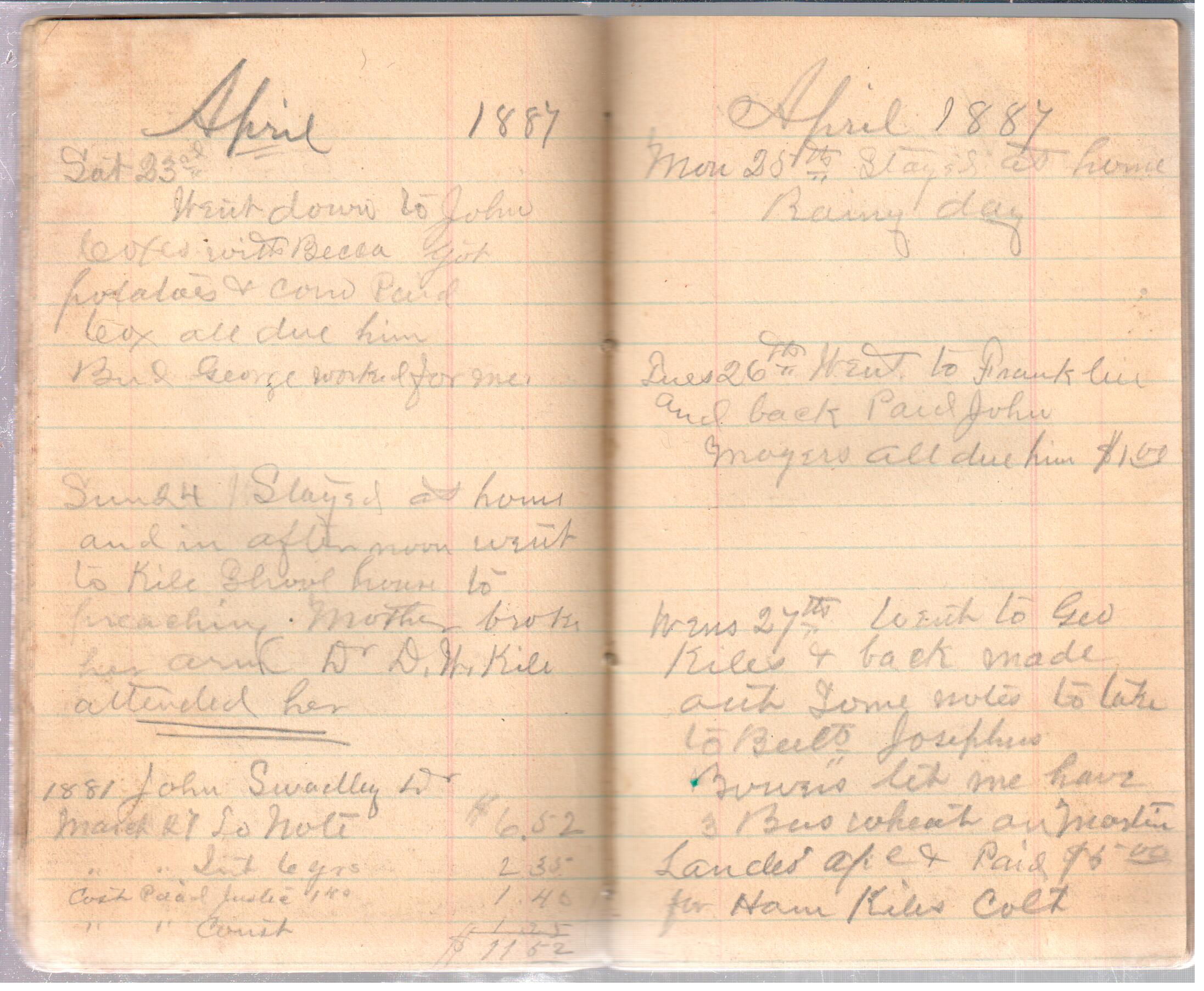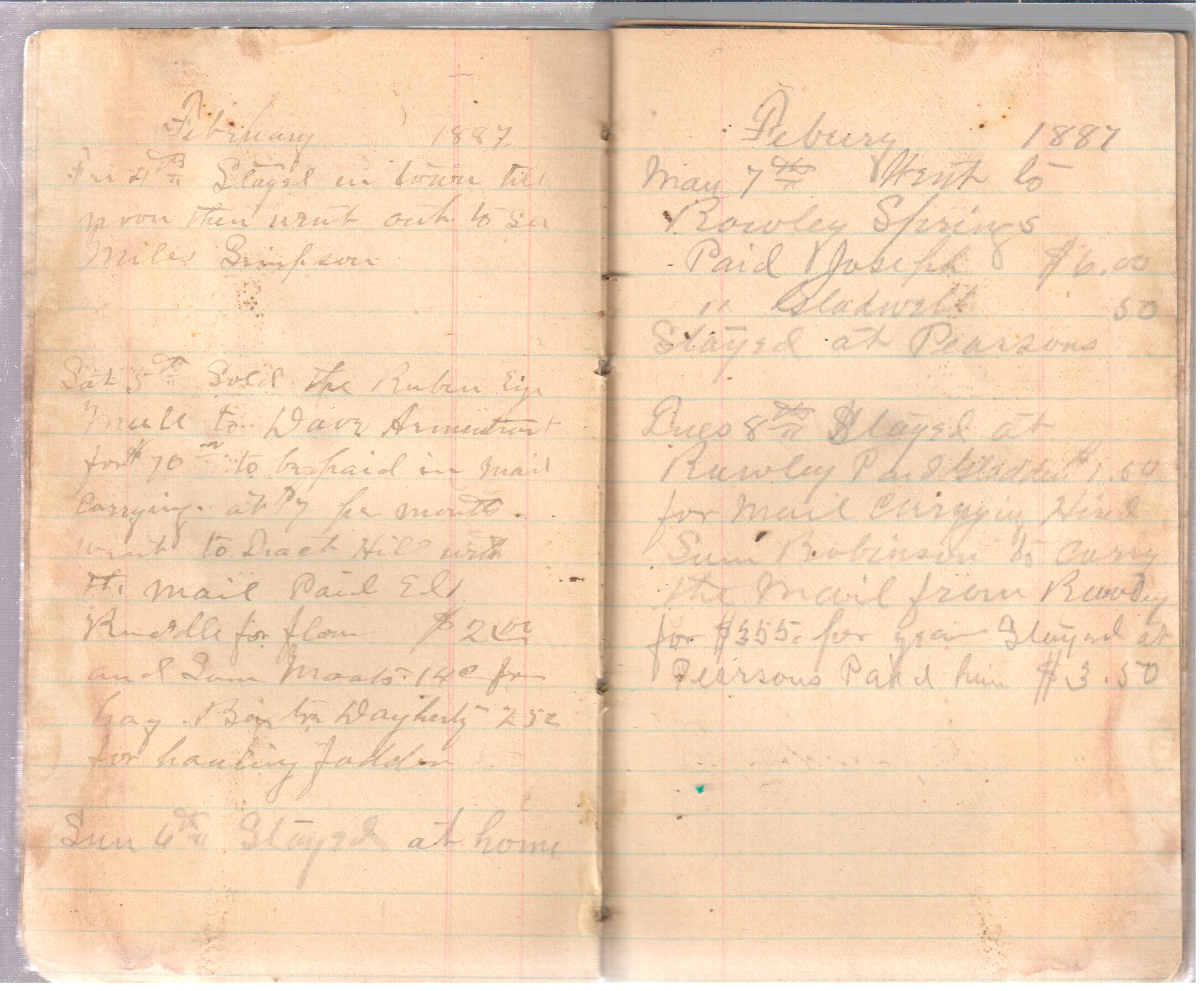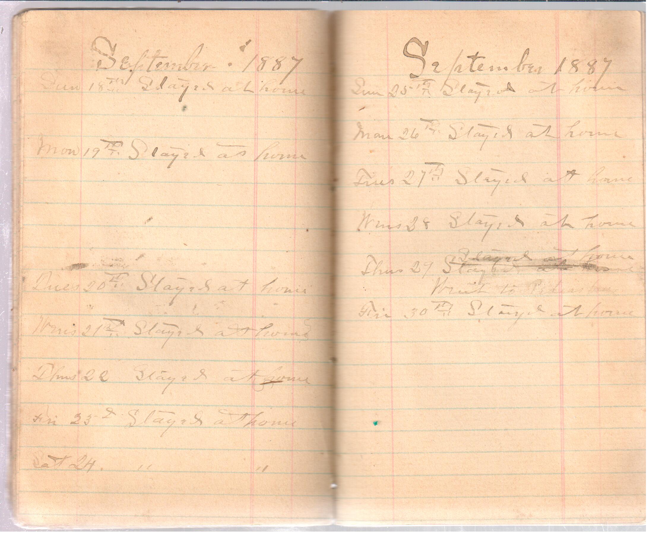 D. A. Landes Diaries: 1887-1888-1889 Only the first 2 weeks of 1889 are entered in this diary. The majority of 1889 is entered in a separate diary. Use slideshow or see pages individually: Page 0 Pages 1-2 Pages 2-3 Pages 4-5 Pages 6-7 Pages 9-10 Pages 11-12 Pages 13-14 Pages 15-16 Pages 17-18 Pages 19-20 Pages 21-22 Pages 23-24 Pages 25-26 Pages 27-28 Pages 29-30 Pages 31-32 Pages 33-34 Pages 35-36 Pages 37-38 Pages 39-40 Pages 41-42 Pages 43-44 Pages 45-46 Pages 47-48 Pages 49-50 Pages 51-52 Pages 53-54 Pages 55-56 Pages 57-58 Pages 59-60 Pages 61-62 Pages 63-64 Pages 65-66 Pages 67-68 Pages 69-70 Pages 71-72 Pages 73-74 Pages 75-76 Pages 77-78 Pages 79-80 Pages 81-82 Pages 83-84 Pages 85-86 Pages 87-88 Pages 89-90 Pages 91-92 Pages 93-94 Pages 95-96 Pages 97-98 Pages 99-100 Pages 101-102 Pages 103-104 Pages 105-106 Pages 107-108 Pages 109-110 Pages 111-112 Pages 113-114 Pages 115-116 Pages 117-118 Pages 119-120 Pages 121-122 Pages 123-124 Pages 125-126 Pages 127-128 Pages 129-130 Pages 131-132 Pages 133-134 Pages 135-136 Pages 137-138 Pages 139-140 Pages 141-142 Pages 143-144 Pages 145-146