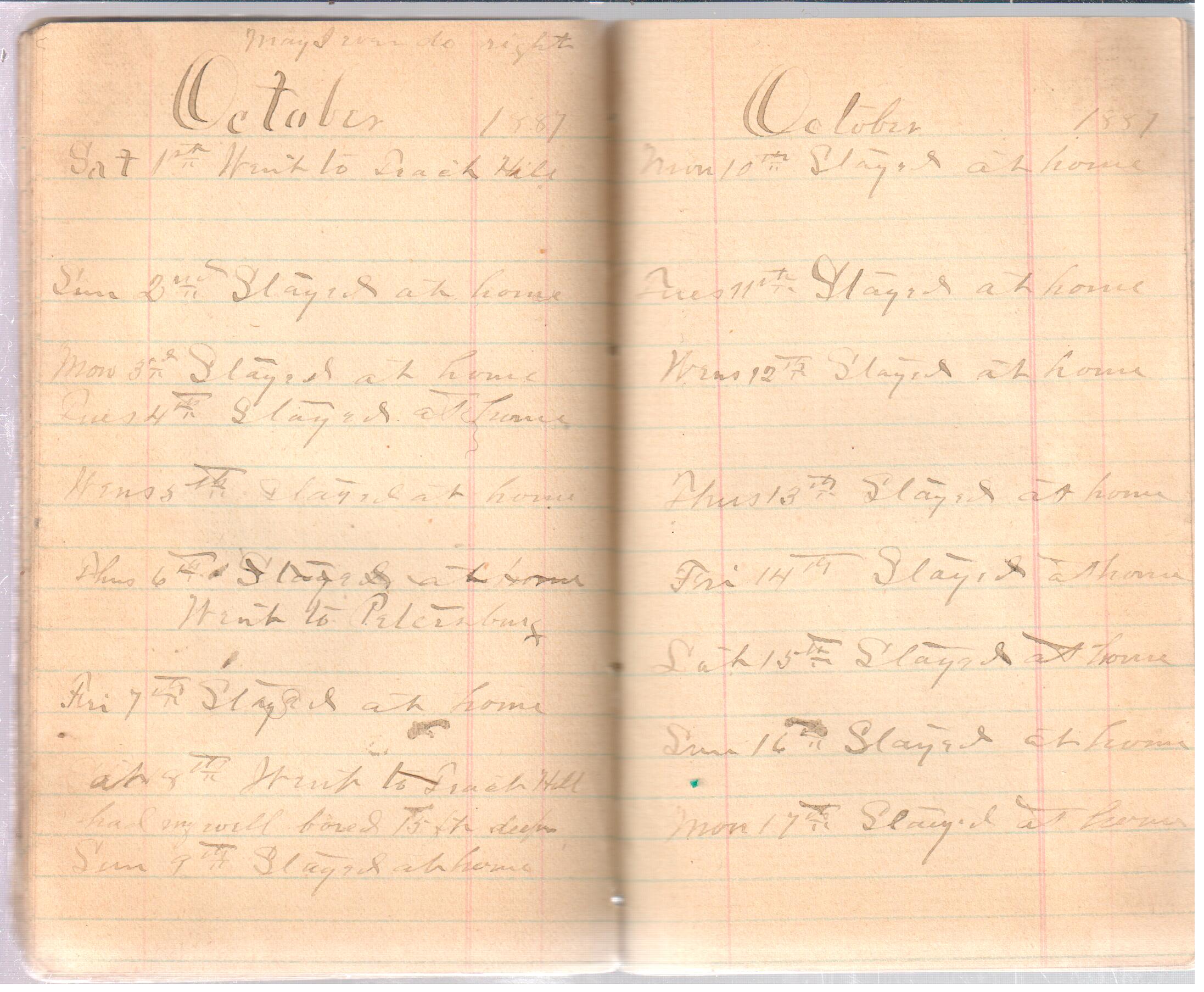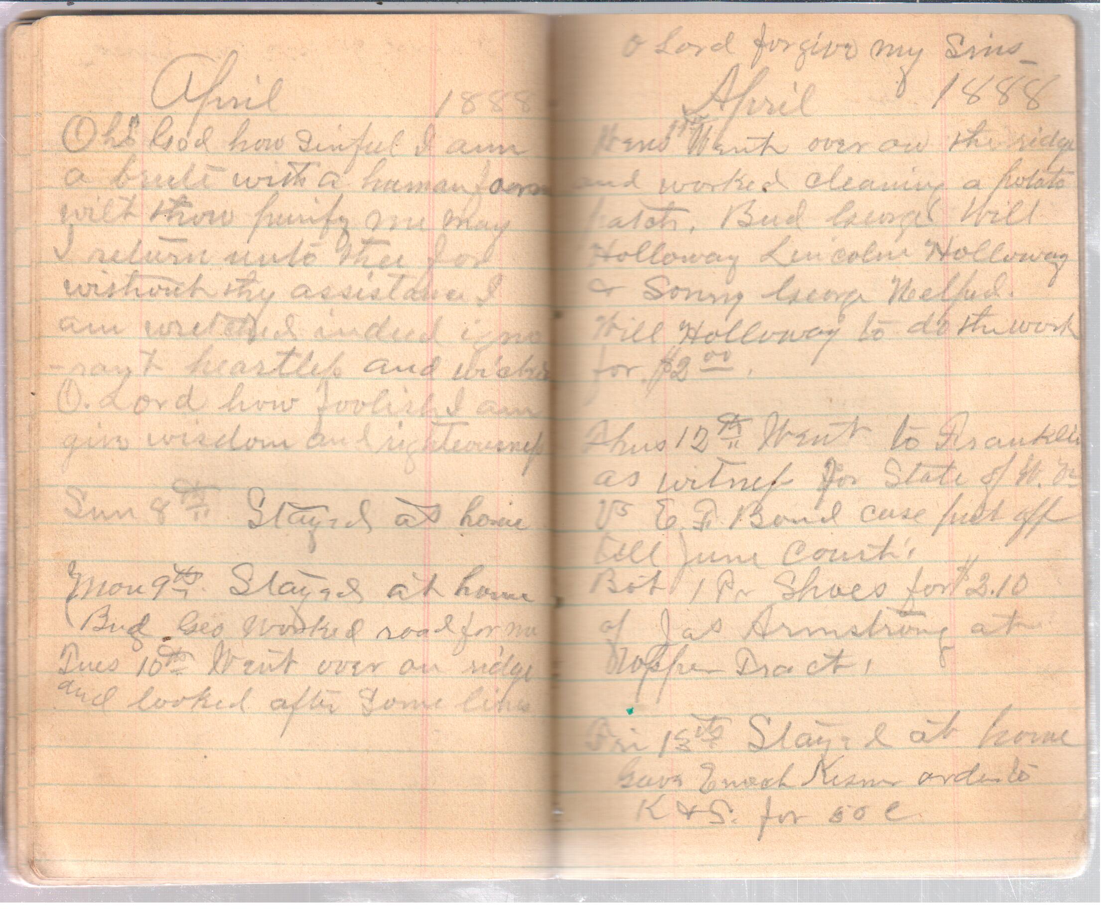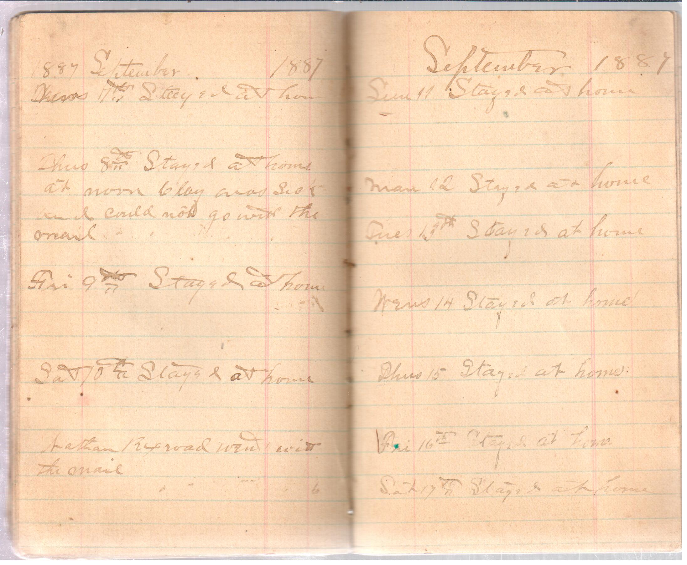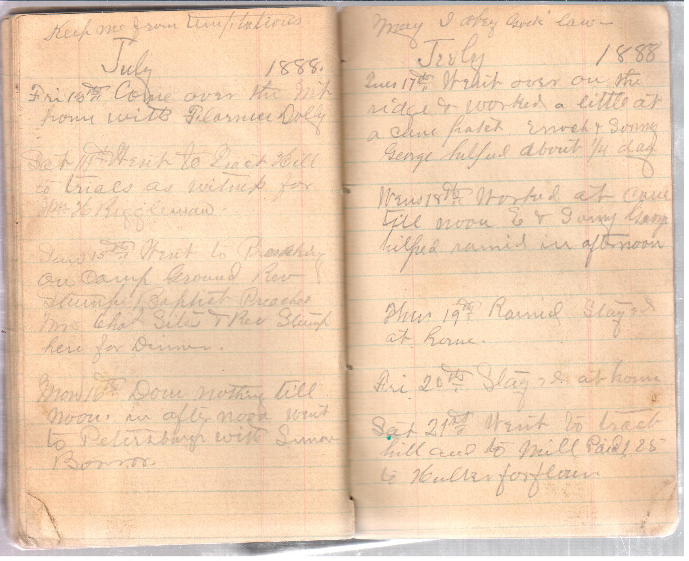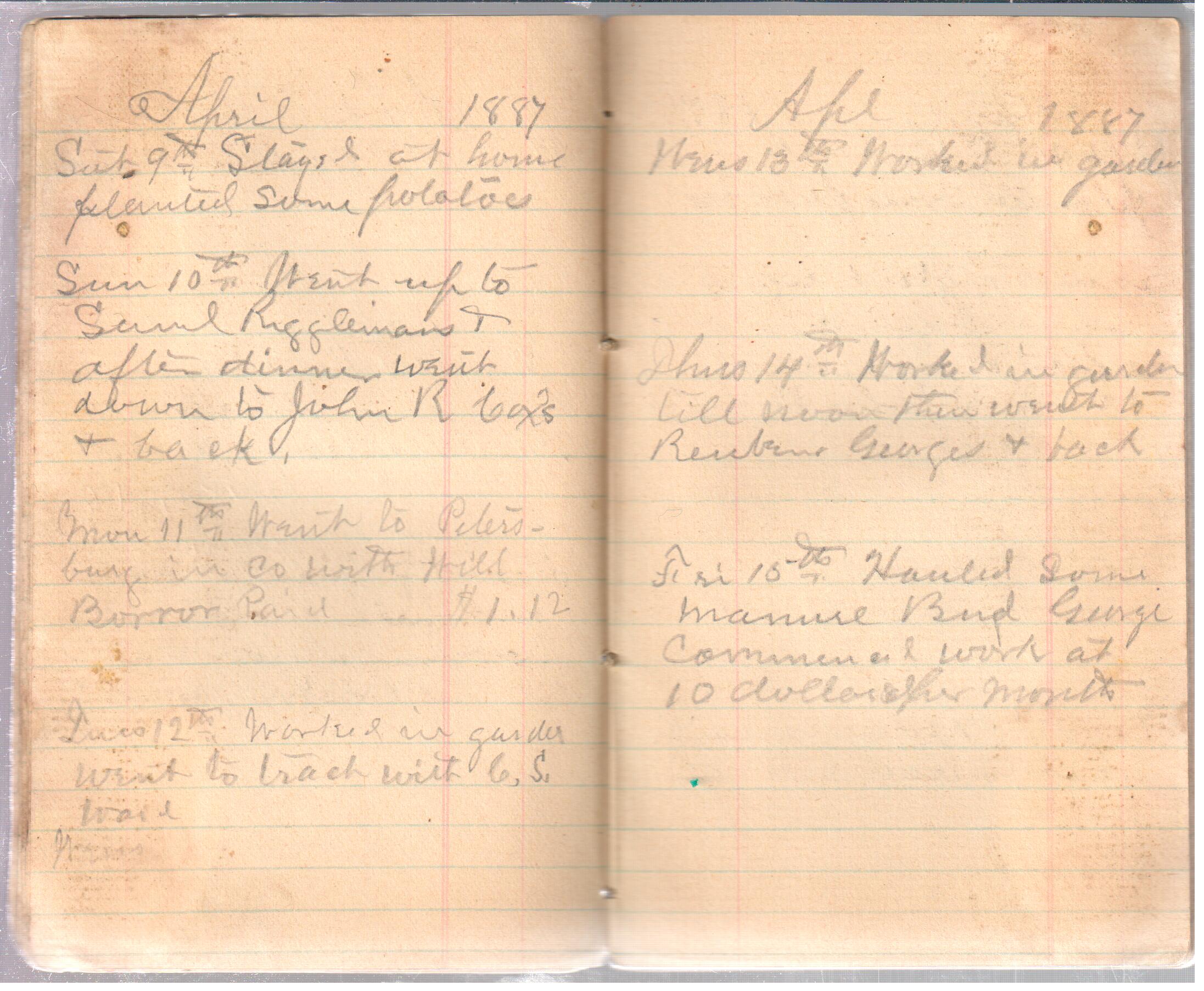 D. A. Landes Diaries: 1887-1888-1889 Only the first 2 weeks of 1889 are entered in this diary. The majority of 1889 is entered in a separate diary. Use slideshow or see pages individually: Page 0 Pages 1-2 Pages 2-3 Pages 4-5 Pages 6-7 Pages 9-10 Pages 11-12 Pages 13-14 Pages 15-16 Pages 17-18 Pages 19-20 Pages 21-22 Pages 23-24 Pages 25-26 Pages 27-28 Pages 29-30 Pages 31-32 Pages 33-34 Pages 35-36 Pages 37-38 Pages 39-40 Pages 41-42 Pages 43-44 Pages 45-46 Pages 47-48 Pages 49-50 Pages 51-52 Pages 53-54 Pages 55-56 Pages 57-58 Pages 59-60 Pages 61-62 Pages 63-64 Pages 65-66 Pages 67-68 Pages 69-70 Pages 71-72 Pages 73-74 Pages 75-76 Pages 77-78 Pages 79-80 Pages 81-82 Pages 83-84 Pages 85-86 Pages 87-88 Pages 89-90 Pages 91-92 Pages 93-94 Pages 95-96 Pages 97-98 Pages 99-100 Pages 101-102 Pages 103-104 Pages 105-106 Pages 107-108 Pages 109-110 Pages 111-112 Pages 113-114 Pages 115-116 Pages 117-118 Pages 119-120 Pages 121-122 Pages 123-124 Pages 125-126 Pages 127-128 Pages 129-130 Pages 131-132 Pages 133-134 Pages 135-136 Pages 137-138 Pages 139-140 Pages 141-142 Pages 143-144 Pages 145-146
