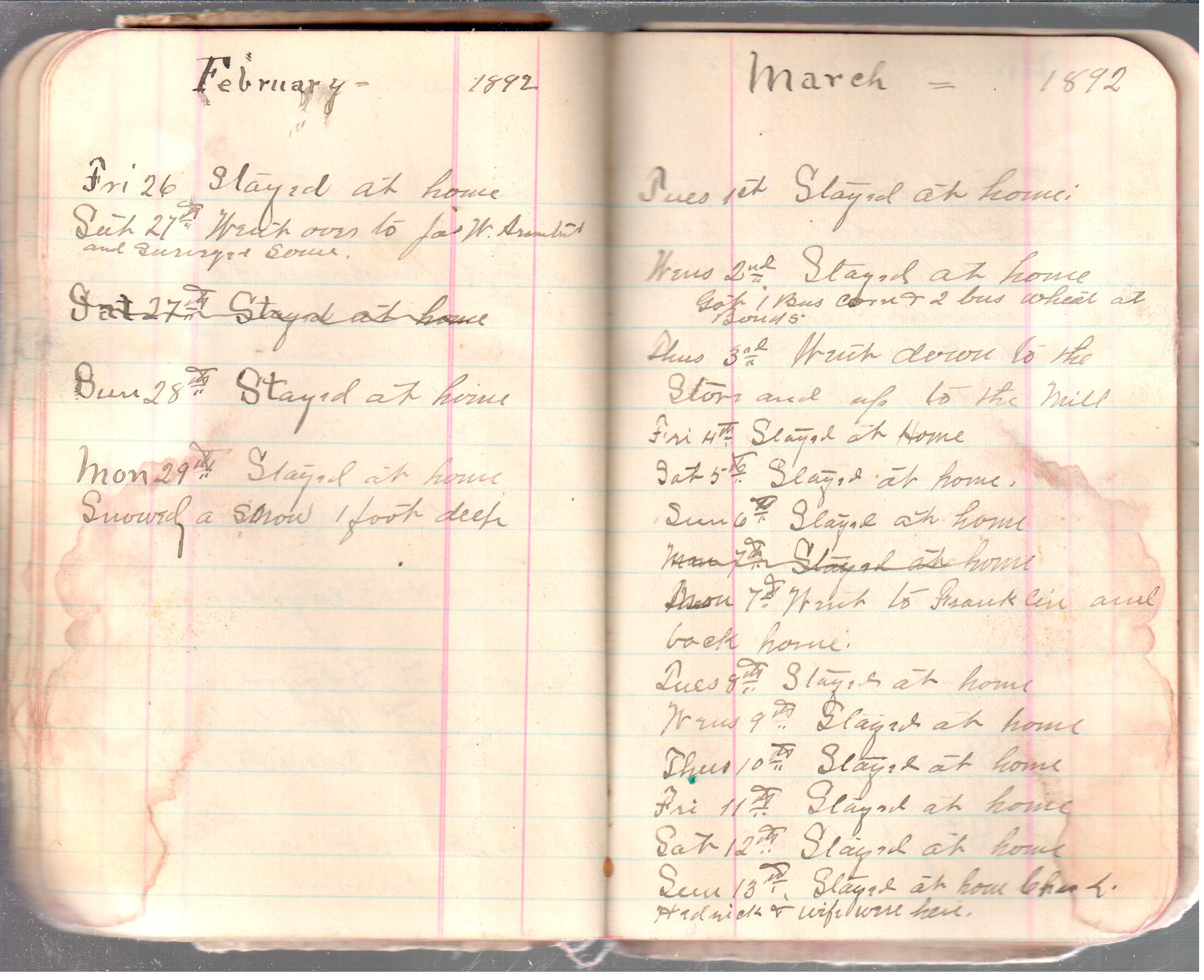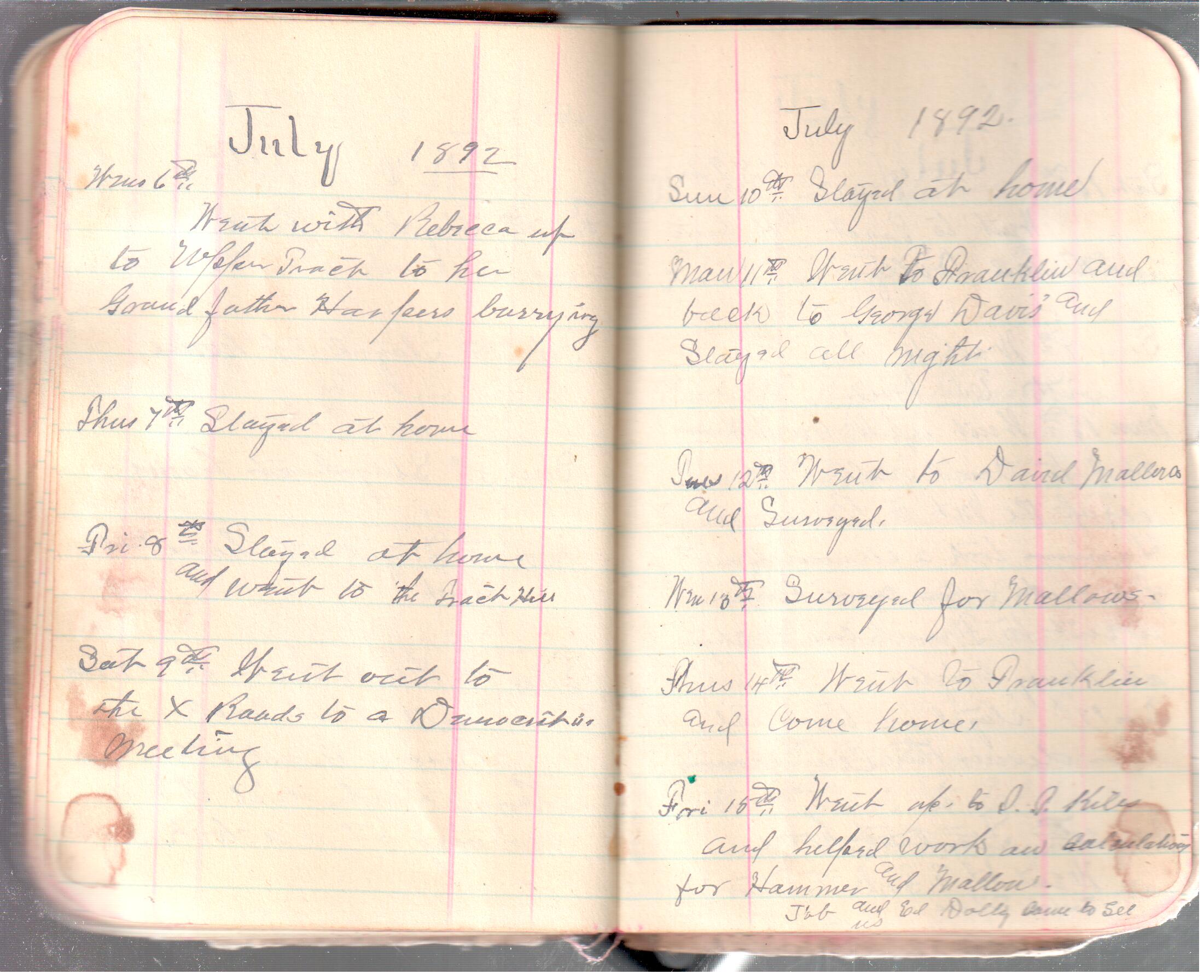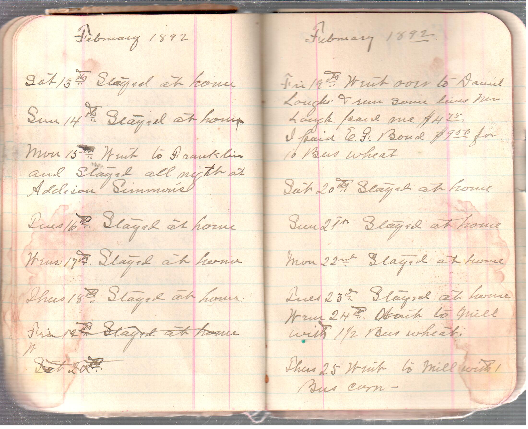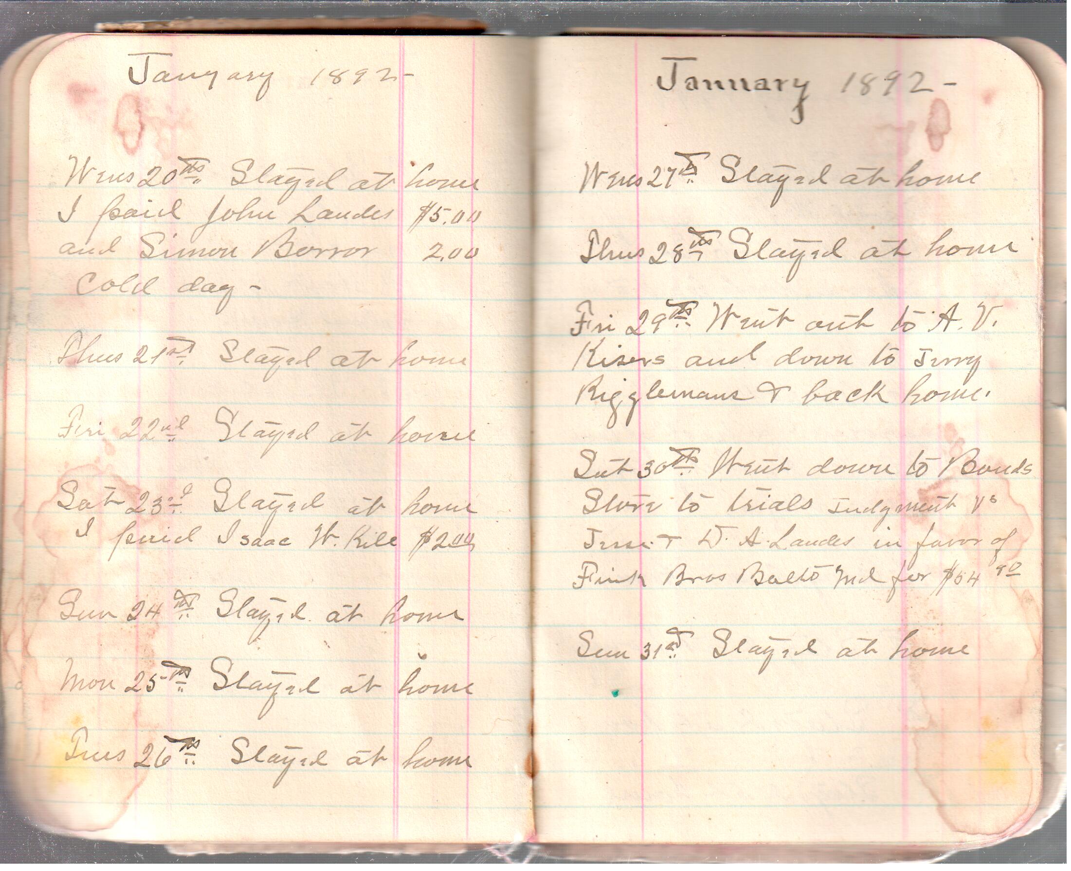 D. A. Landes Diaries: 1892 Use slideshow or see pages individually: Outside covers ABCD Index Pages 0-1 Pages 2-3 Pages 4-5 Pages 6-7 Pages 8-9 Pages 10-11 Pages 12-13 Pages 14-15 Pages 16-17 Pages 18-19 Pages 20-21 Pages 22-23 Pages 24-25 Pages 26-27 Pages 28-29 Pages 30-31 Pages 32-33 Pages 34-35 Pages 36-37 Pages 38-39 Pages 40-41 Pages 42-43 Pages 44-45 Pages 46-47 Pages 48-49 Pages 50-51 Pages 52-53 Pages 54-55 Pages 56-57 Pages 58-59 Pages 60-61 Pages 61-62 Pages 62-63 Pages 64-65 Pages 66-67 Pages 68-69 Pages 70-71 Pages 72-73 Pages 74-75 Pages 76-77 Inside back A receipt