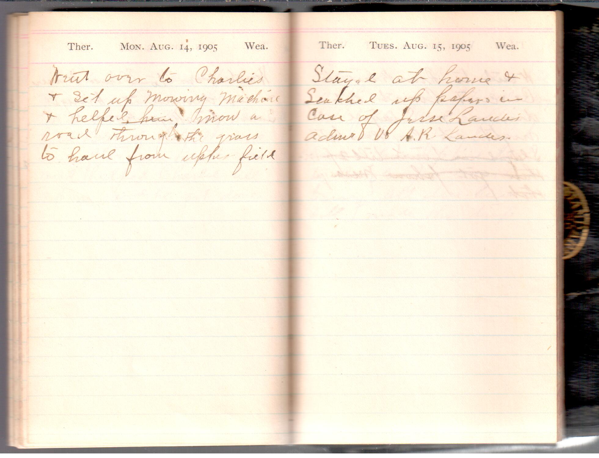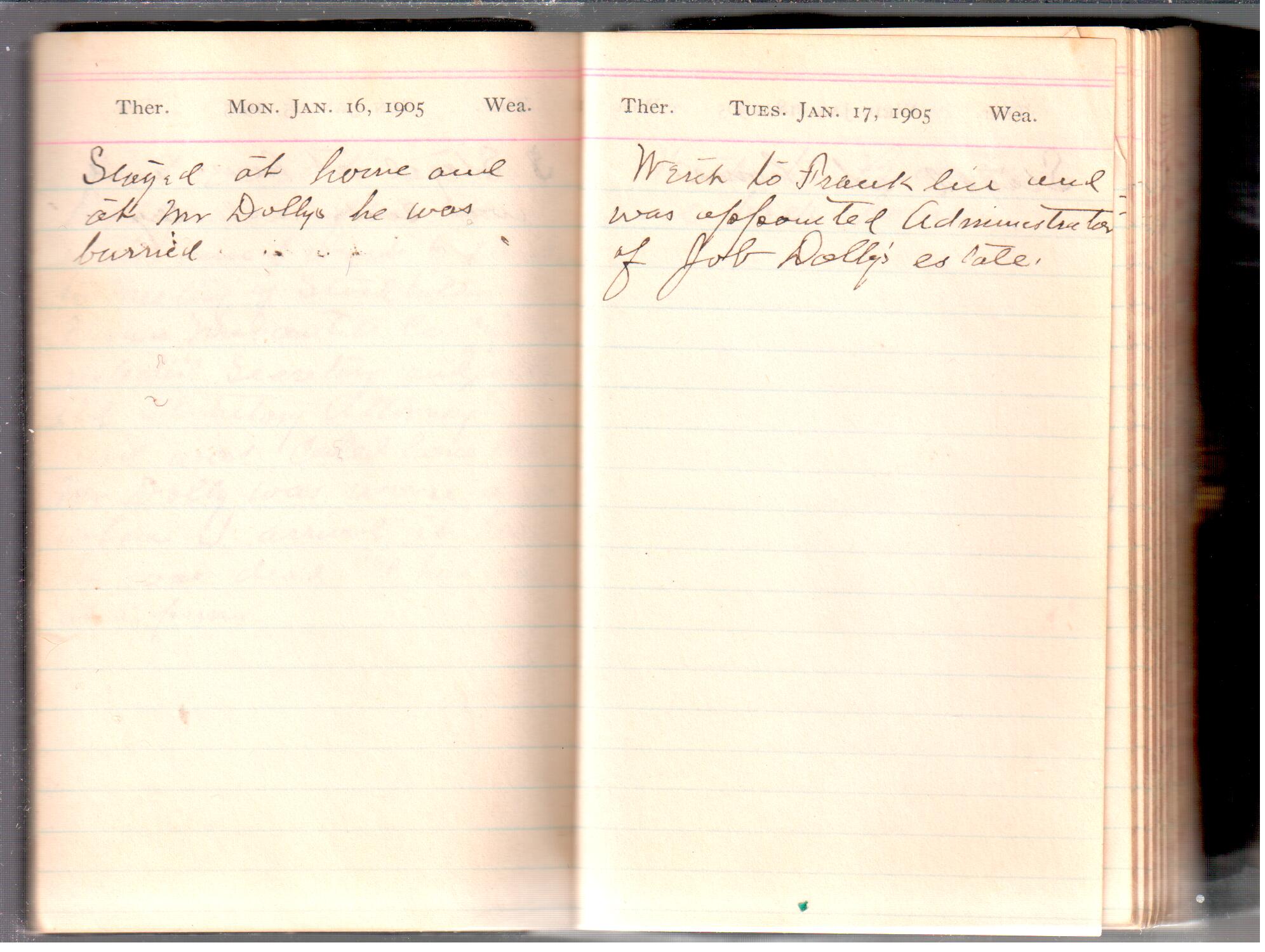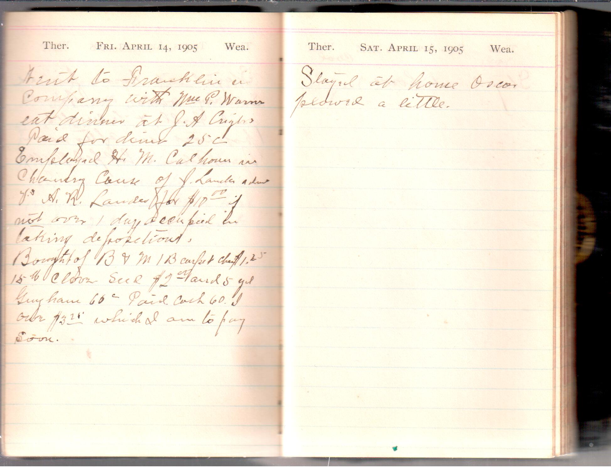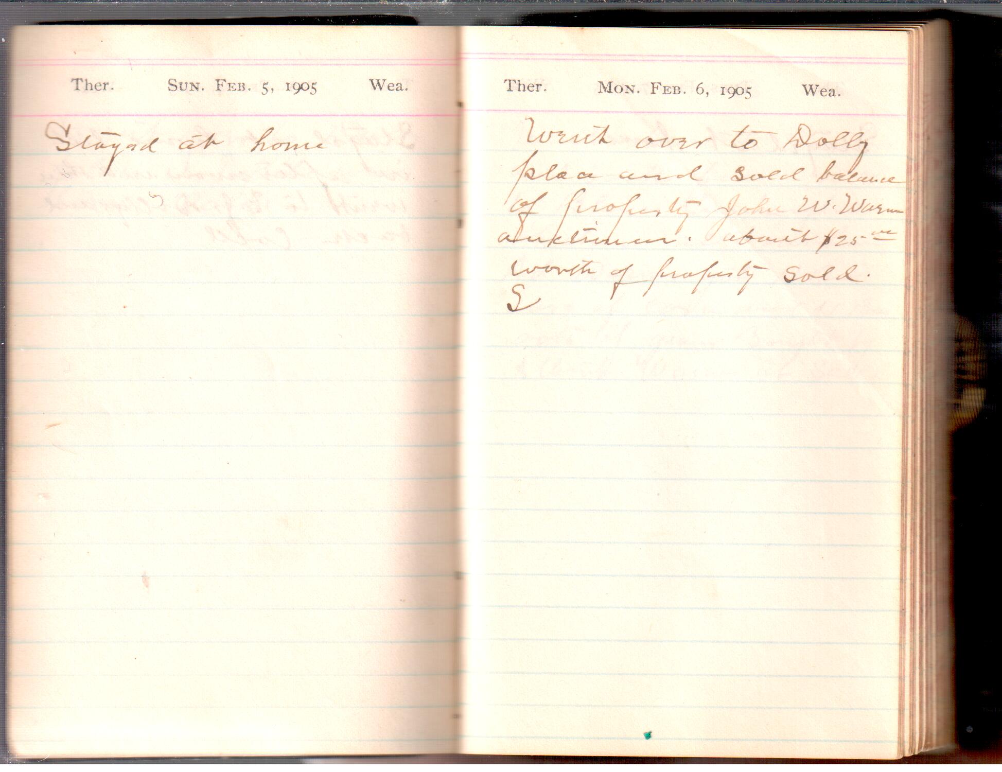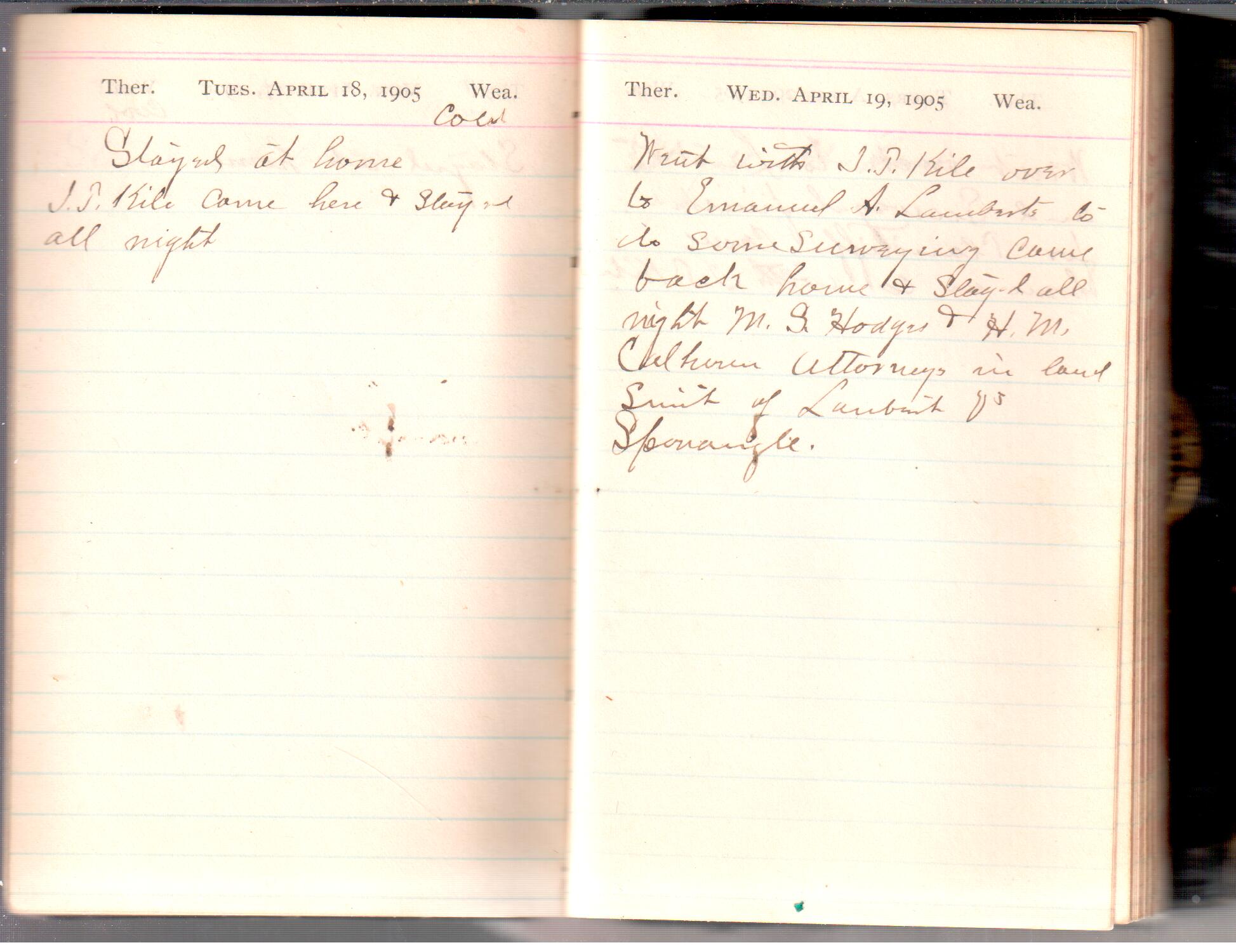 D. A. Landes Diaries: 1905 There are no entries for January 1 - January 11, 1905 Use slideshow or see pages individually: Pages 0-0 Pages 0-1 Pages 0-2 Pages 1-2 Pages 2-3 Pages 4-5 Pages 6-7 Pages 9-10 Pages 11-12 Pages 13-14 Pages 15-16 Pages 17-18 Pages 19-20 Pages 21-22 Pages 23-24 Pages 25-26 Pages 27-28 Pages 29-30 Pages 31-32 Pages 33-34 Pages 35-36 Pages 37-38 Pages 39-40 Pages 41-42 Pages 43-44 Pages 45-46 Pages 47-48 Pages 49-50 Pages 51-52 Pages 53-54 Pages 55-56 Pages 57-58 Pages 59-60 Pages 61-62 Pages 63-64 Pages 65-66 Pages 66-67 Pages 67-68 Pages 69-70 Pages 71-72 Pages 73-74 Pages 75-76 Pages 77-78 Pages 79-80 Pages 81-82 Pages 83-84 Pages 85-86 Pages 87-88 Pages 89-90 Pages 91-92 Pages 93-94 Pages 95-96 Pages 97-98 Pages 99-100 Pages 101-102 Pages 103-104 Pages 105-106 Pages 107-108 Pages 109-110 Pages 111-112 Pages 113-114 Pages 115-116 Pages 117-118 Pages 119-120 Pages 121-122 Pages 123-124 Pages 125-126 Pages 127-128 Pages 129-130 Pages 131-132 Pages 133-134 Pages 135-136 Pages 137-138 Pages 139-140 Pages 141-142 Pages 143-144 Pages 145-146 Pages 147-148 Pages 149-150 Pages 151-152 Pages 152-153 Pages 153-154 Pages 155-156 Pages 157-158 Pages 159-160 Pages 161-162 Pages 163-164 Pages 165-166 Pages 167-168 Pages 169-170 Pages 171-172 Pages 173-174 Pages 175-176 Pages 177-178 Pages 179-180 Pages 181-182 Pages 183-184 Pages 185-186 Pages 187-188 Pages 189-190 Pages 191-192 Pages 193-194 Pages 195-196 Pages 197-198 Pages 199-200 Pages 201-202 Pages 203-204 Pages 205-206 Pages 207-208 Pages 209-210 Pages 211-212 Pages 213-214 Pages 215-216 Pages 217-218 Pages 219-220 Pages 221-222 Pages 223-224 Pages 225-226 Pages 227-228 Pages 229-230 Pages 231-232 Pages 233-234 Pages 235-236 Pages 237-238 Pages 239-240 Pages 241-242 Pages 243-244 Pages 245-246 Pages 247-248 Pages 249-250 Pages 251-252 Pages 252-253 Pages 253-254 Pages 255-256 Pages 257-258 Pages 259-260 Pages 261-262 Pages 263-264 Pages 265-266 Pages 267-268 Pages 269-270 Pages 271-272 Pages 273-274 Pages 275-276 Pages 277-278 Pages 279-280 Pages 281-282 Pages 283-284 Pages 285-286 Pages 287-288 Pages 289-290 Pages 291-292 Pages 293-294 Pages 295-296 Pages 297-298 Pages 199-200 Pages 301-302 Pages 303-304 Pages 305-306 Pages 307-308 Pages 309-310 Pages 311-312 Pages 313-314 Pages 315-316 Pages 317-318 Pages 319-320 Pages 321-322 Pages 323-324 Pages 325-326 Pages 327-328 Pages 329-330 Pages 331-332 Pages 333-334 Pages 335-336 Pages 337-338 Pages 339-340 Pages 341-342 Pages 343-344 Pages 345-346 Pages 347-348 Pages 349-350 Pages 351-352 Pages 352-353 Pages 353-354 Pages 355-356 Pages 357-358 Pages 359-360 Pages 361-362 Pages 363-364