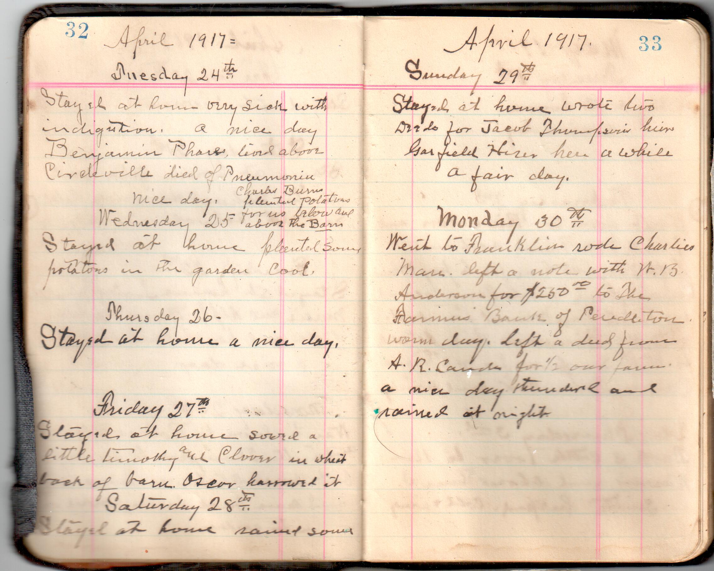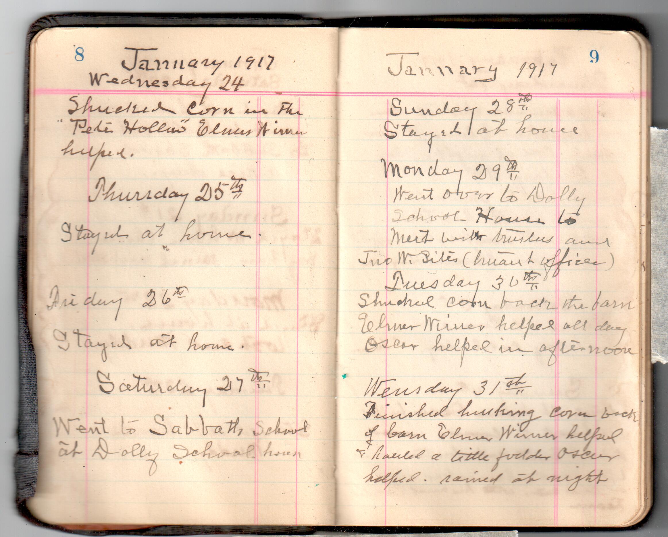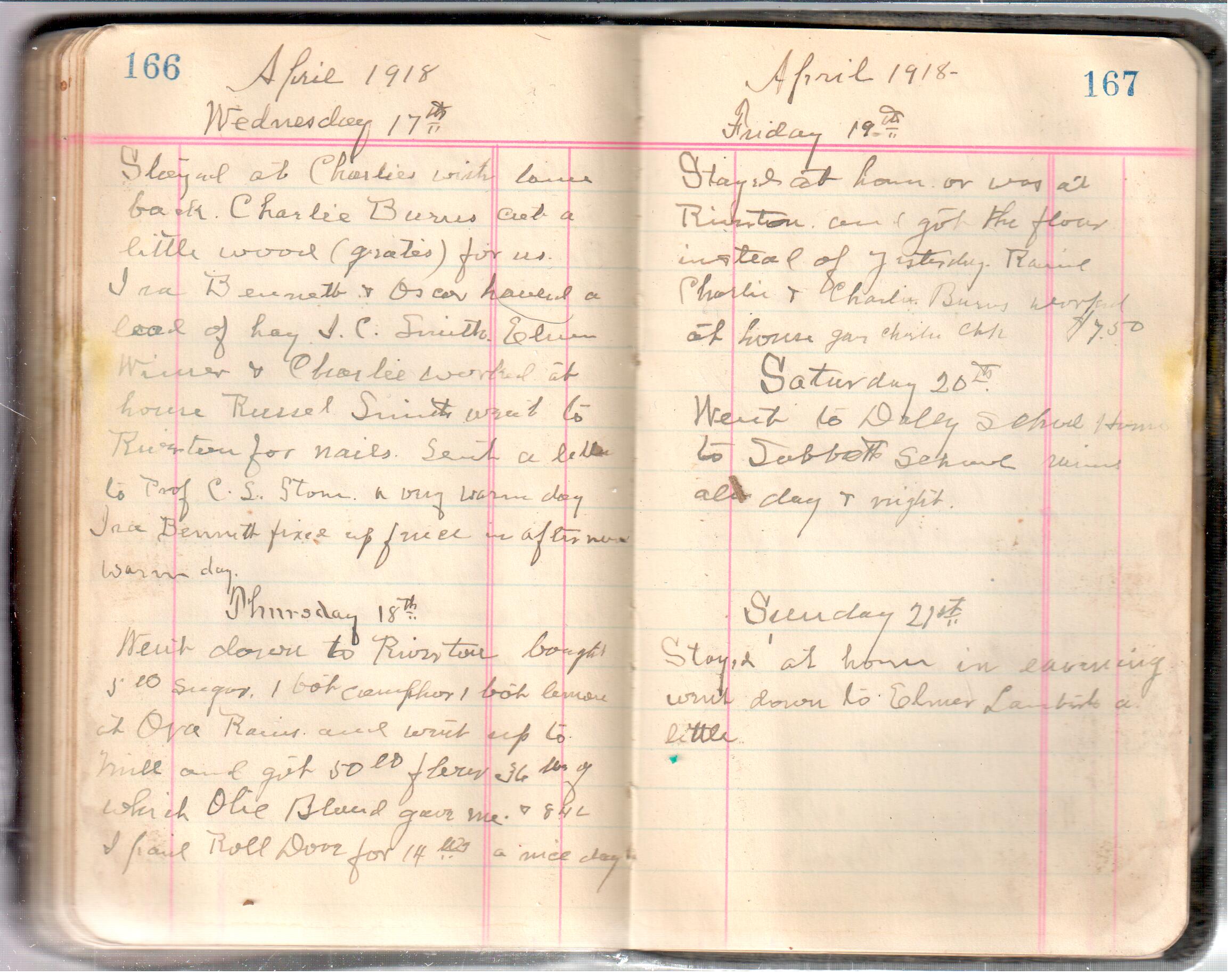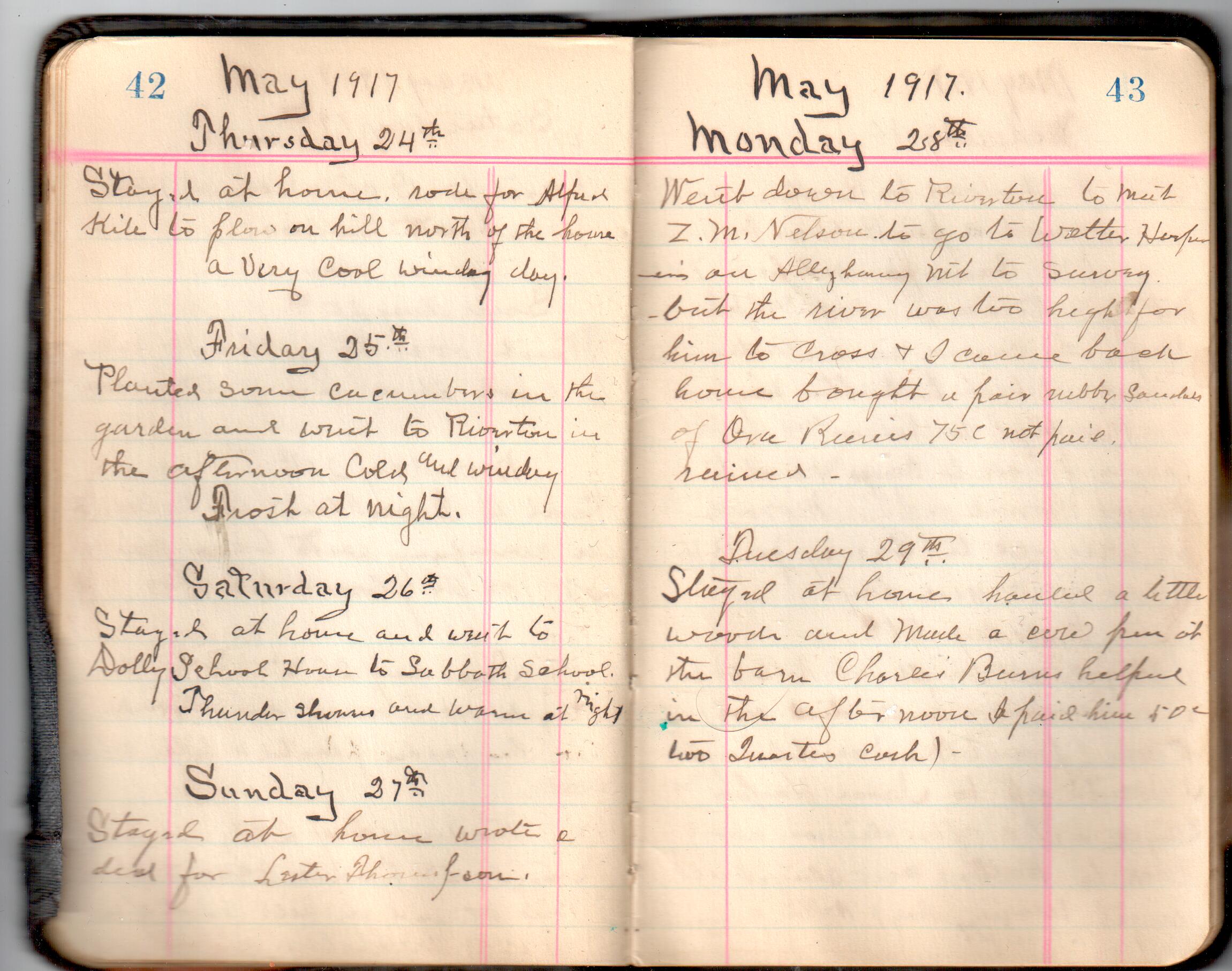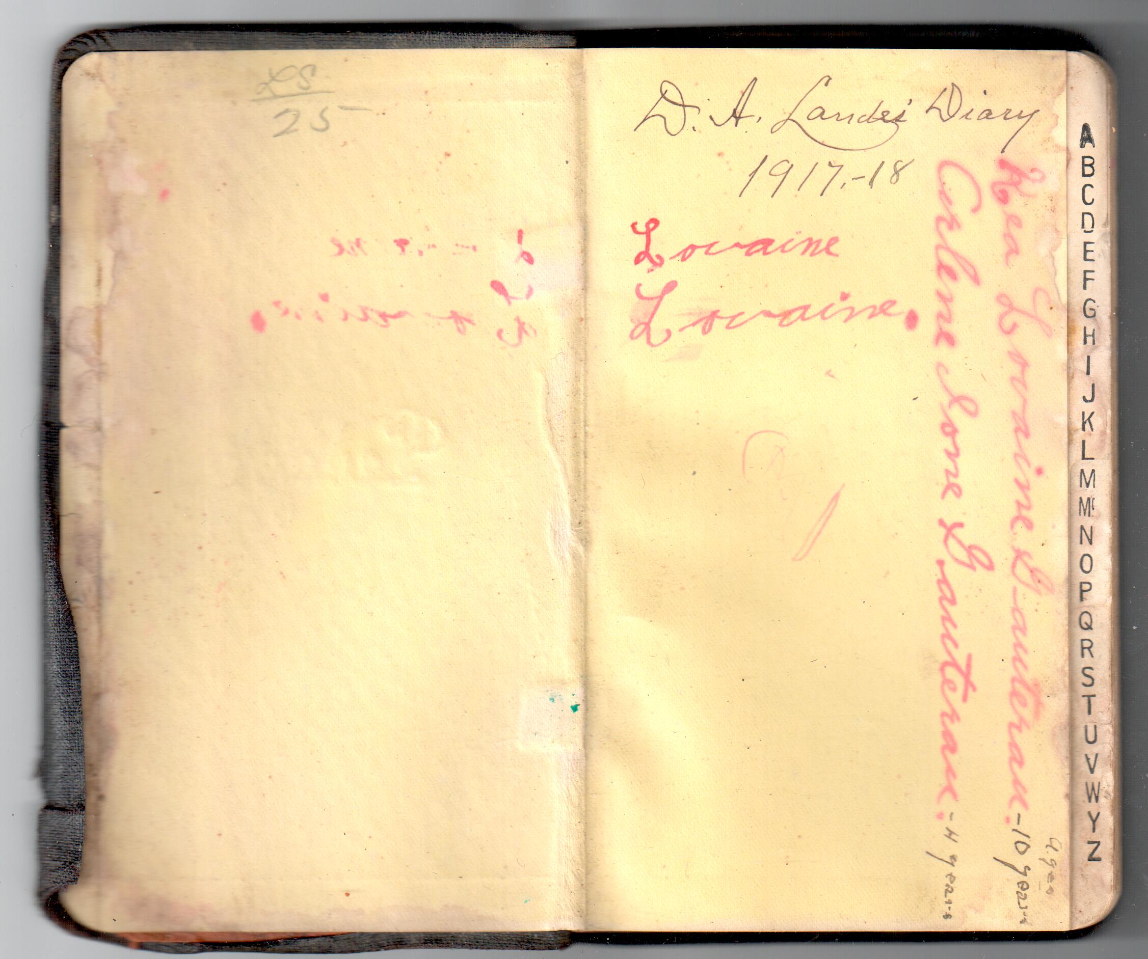 D. A. Landes Diaries: 1917-18 This diary spans January 1, 1917 - May 31, 1918. Use slideshow or see pages individually: Covers Inside Front Cover ABCD EFGH Pages 0-1 Pages 2-3 Pages 4-5 Pages 6-7 Pages 8-9 Pages 10-11 Pages 12-13 Pages 14-15 Pages 16-17 Pages 18-19 Pages 20-21 Pages 22-23 Pages 24-25 Pages 26-27 Pages 28-29 Pages 30-31 Pages 32-33 Pages 34-35 Pages 36-37 Pages 38-39 Pages 40-41 Pages 42-43 Pages 44-45 Pages 46-47 Pages 48-49 Pages 50-51 Pages 52-53 Pages 54-55 Pages 56-57 Pages 58-59 Pages 60-61 Pages 62-63 Pages 64-65 Pages 66-67 Pages 68-69 Pages 70-71 Pages 72-73 Pages 74-75 Pages 76-77 Pages 78-79 Pages 80-81 Pages 82-83 Pages 84-85 Pages 86-87 Pages 88-89 Pages 90-91 Pages 92-93 Pages 94-95 Pages 96-97 Pages 98-99 Pages 100-101 Pages 102-103 Pages 104-105 Pages 106-107 Pages 108-019 Pages 110-111 Pages 112-113 Pages 114-115 Pages 116-117 Pages 118-119 Pages 120-121 Pages 122-123 Pages 124-125 Pages 126-127 Pages 128-129 Pages 130-131 Pages 132-133 Pages 134-135 Pages 136-137 Pages 138-139 Pages 140-141 Pages 142-143 Pages 144-145 Pages 146-147 Pages 148-149 Pages 150-151 Pages 152-153 Pages 154-155 Pages 156-157 Pages 158-159 Pages 160-161 Pages 162-163 Pages 164-165 Pages 166-167 Pages 168-169 Pages 170-171 Pages 172-173 Pages 174-175 Pages 176-177 Pages 178-179 Pages 180-181 Pages 182-183