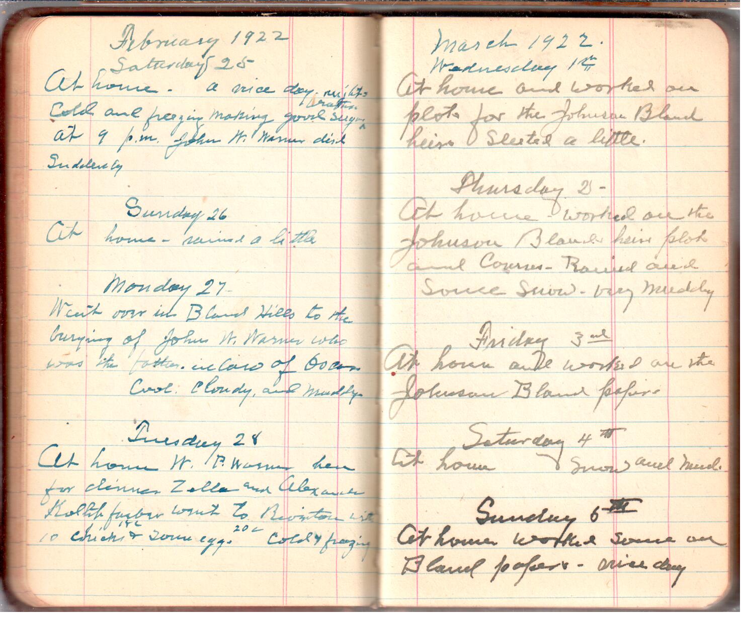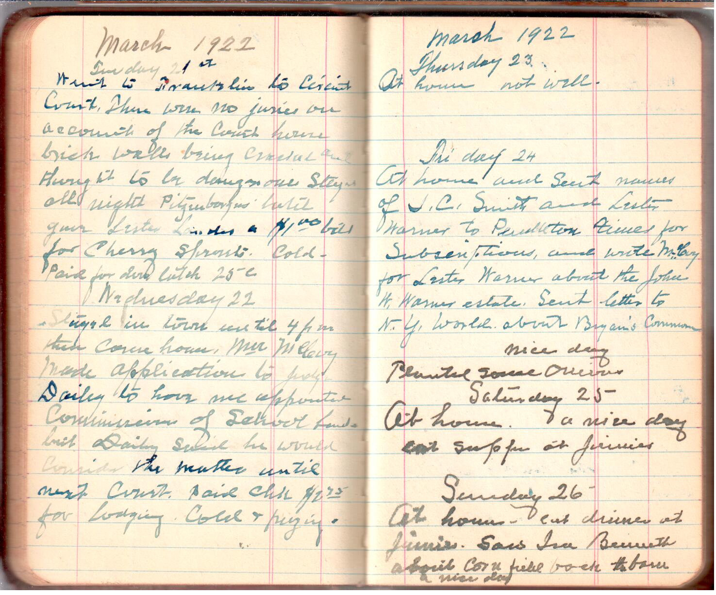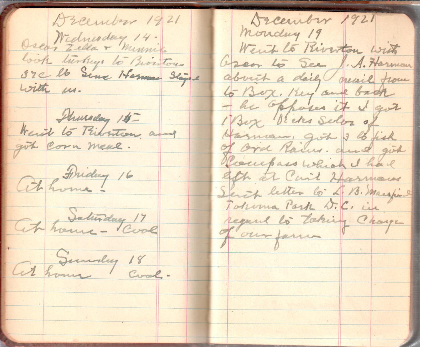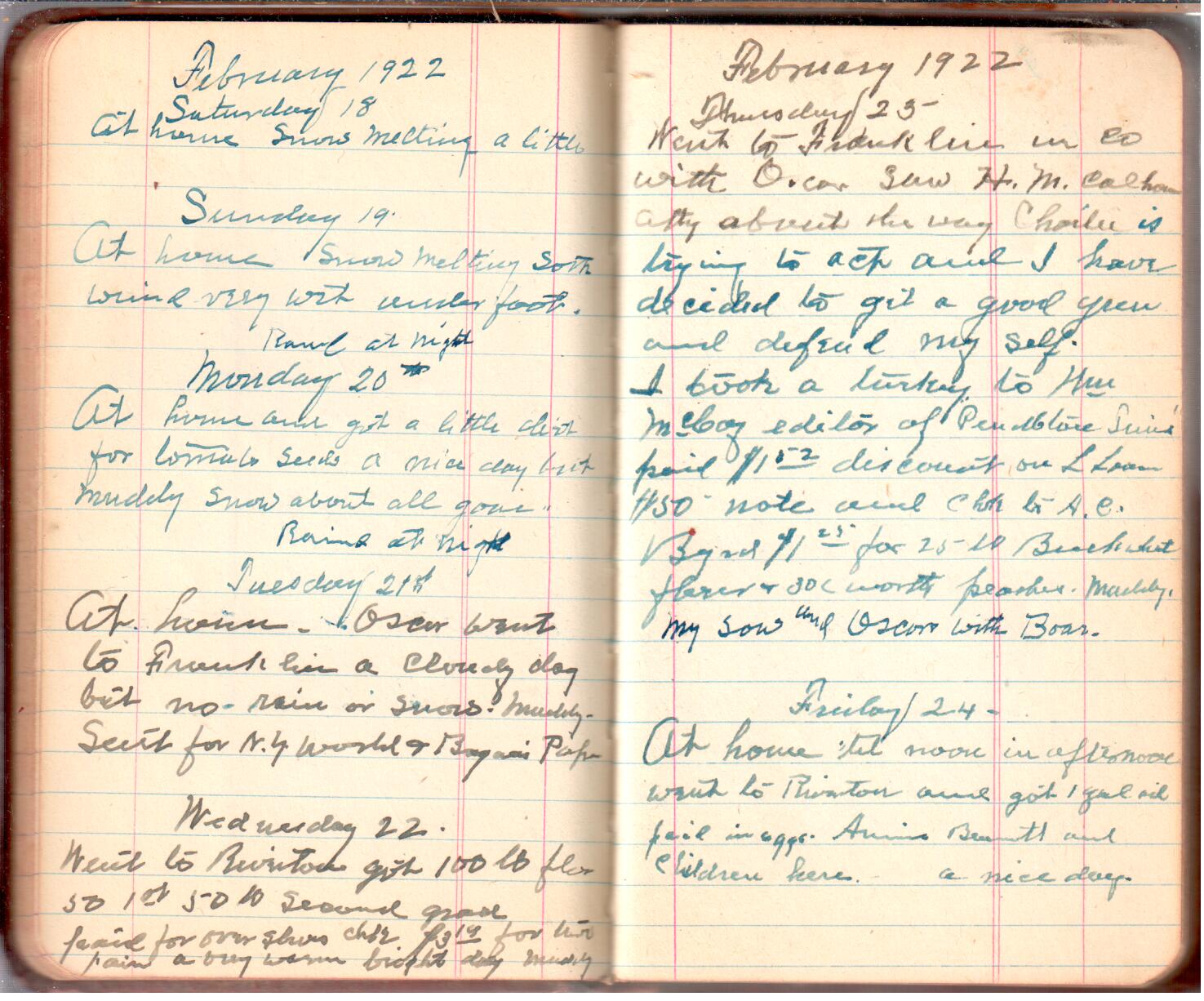D. A. Landes Diaries: 1921-23 This diary spans November 27, 1921 - April 30, 1923 Use slideshow or see pages individually: Outside cover Pages 0-0 Pages 0-1 Pages 1-2 Pages 2-3 Pages 4-5 Pages 6-7 Pages 9-10 Pages 11-12 Pages 13-14 Pages 15-16 Pages 17-18 Pages 19-20 Pages 21-22 Pages 23-24 Pages 25-26 Pages 27-28 Pages 29-30 Pages 31-32 Pages 33-34 Pages 35-36 Pages 37-38 Pages 39-40 Pages 41-42 Pages 43-44 Pages 45-46 Pages 47-48 Pages 49-50 Pages 51-52 Pages 53-54 Pages 55-56 Pages 57-58 Pages 59-60 Pages 61-62 Pages 63-64 Pages 65-66 Pages 66-67 Pages 67-68 Pages 69-70 Pages 71-72 Pages 73-74 Pages 75-76 Pages 77-78 Pages 79-80 Pages 81-82 Pages 83-84 Pages 85-86 Pages 87-88 Pages 89-90 Pages 91-92 Pages 93-94 Pages 95-96 Pages 97-98 Pages 99-100 Pages 101-102 Pages 103-104 Pages 105-106 Pages 107-108 Pages 109-110 Pages 111-112 Pages 113-114 Pages 115-116 Pages 117-118 Pages 119-120 Pages 121-122 Pages 123-124 Pages 125-126 Pages 127-128 Pages 129-130 Pages 131-132 Pages 133-134 Pages 135-136 Pages 137-138 Pages 139-140