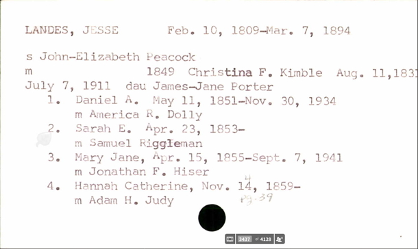 Jesse was born in 1809, probably in Rockingham County, VA, and died in 1894 in Pendleton County, WV. I say, "probably born" in Rockingham County, VA because I have not come accross any historical documents that specifically places Jesse in Rockingham County, only mentions of this in other geneology records such as the Lancaster, PA Mennonite Vital Records (ca. 1950) and the "Report of the 33rd Reunion of the Landis-Landes Families" held in Bucks County PA on Aug. 16, 1952. You will need an account on ancestry.com with a username and passord to view the original sources for these links directly. But, here they are: