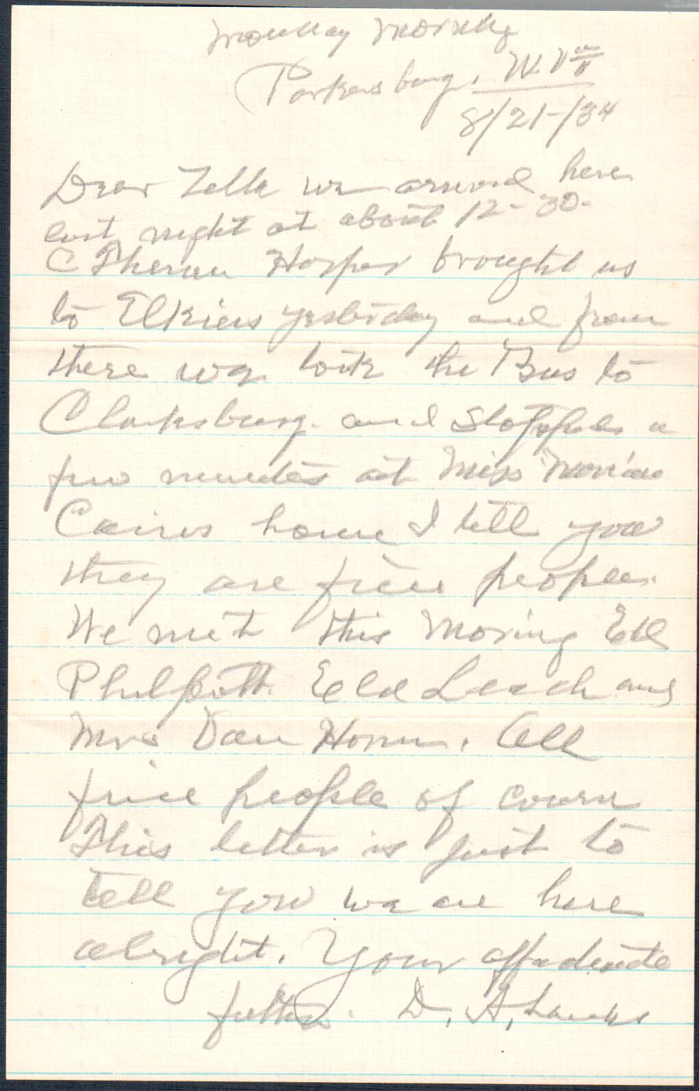 August 21, 1934: Letter to Zella Landes, Riverton, WV
