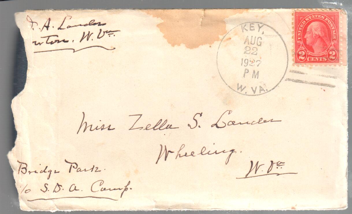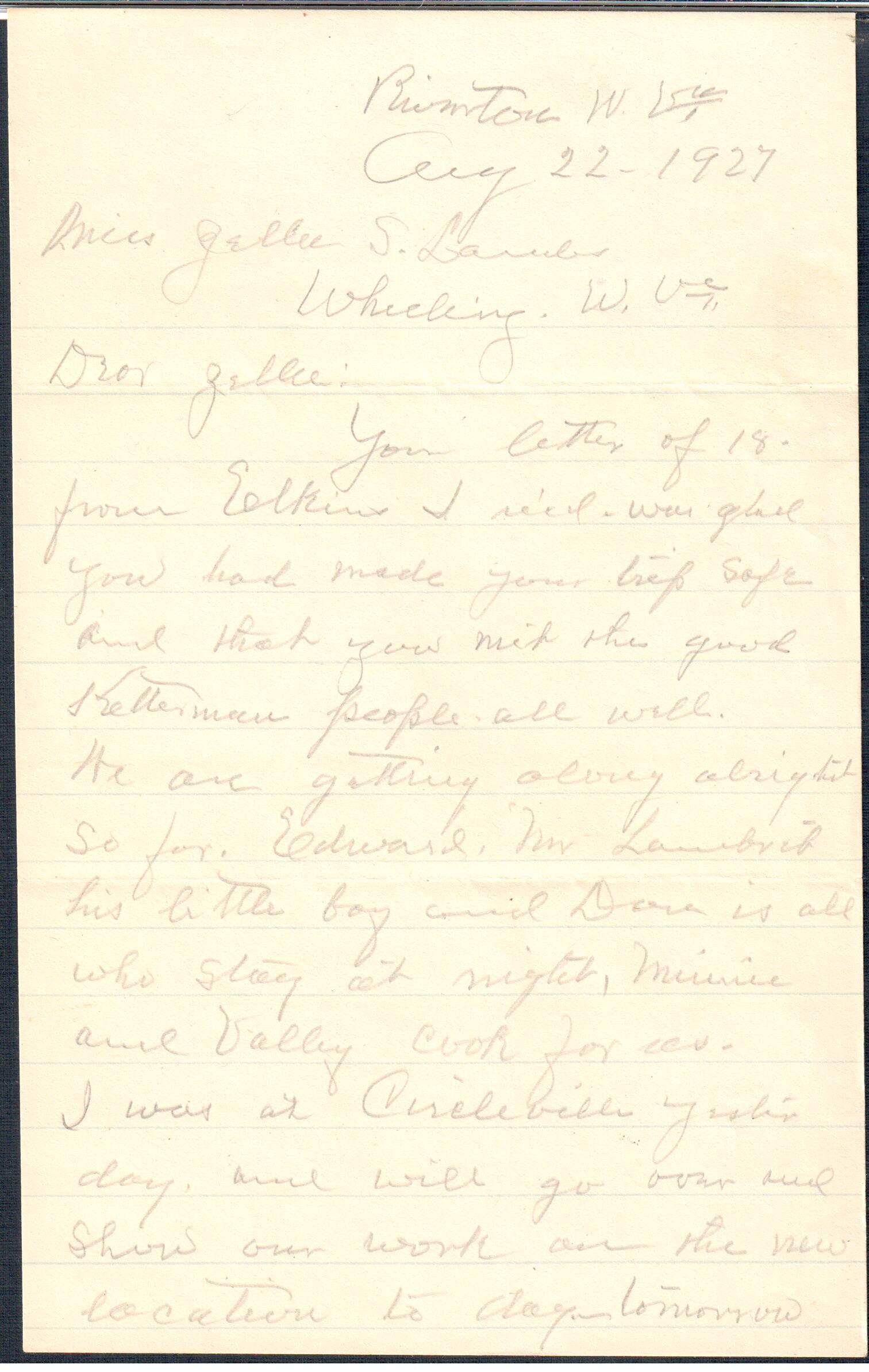 August 22, 1927: Letter to Zella Landes, Riverton, WV