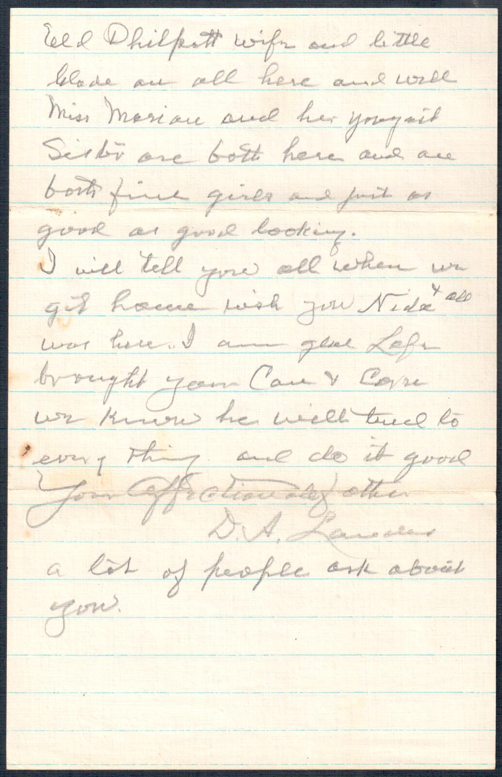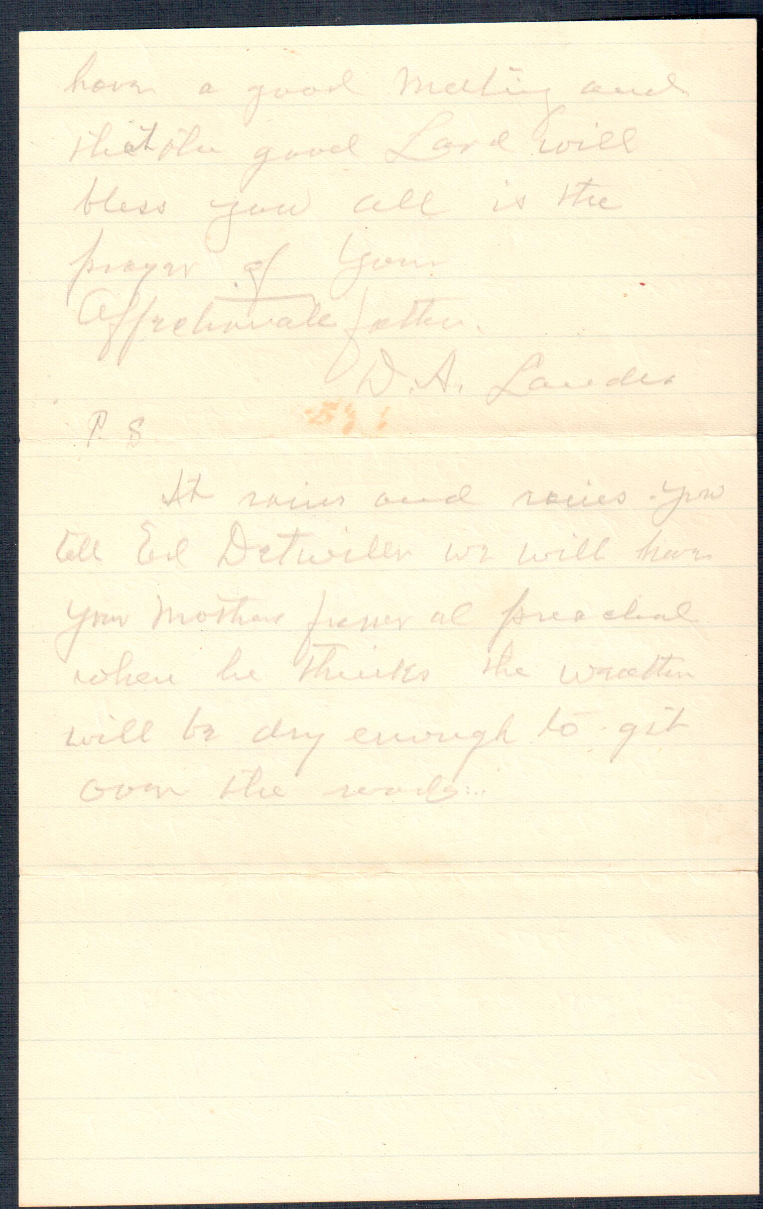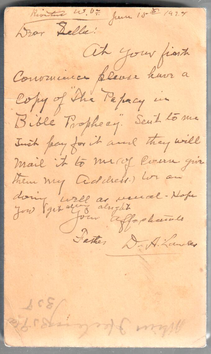 Here are links to letters, postcards, another writings either by or sent to D. A. Landes. Listed in chronological order by date. It is unclear whether the letters that are addressed to specific individuals were ever sent, or were copies of letters sent. Nevertheless, these letters were in D. A.'s personal papers. Probably the letters addressed to Zella Landes and Ruth Lawrence were saved and archived by Zella Landes.