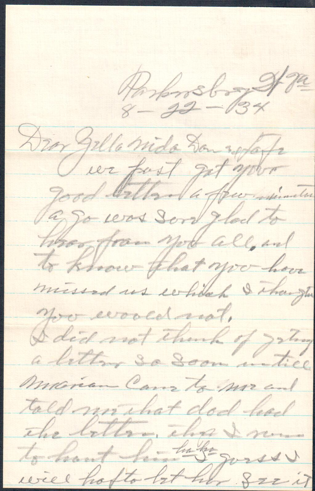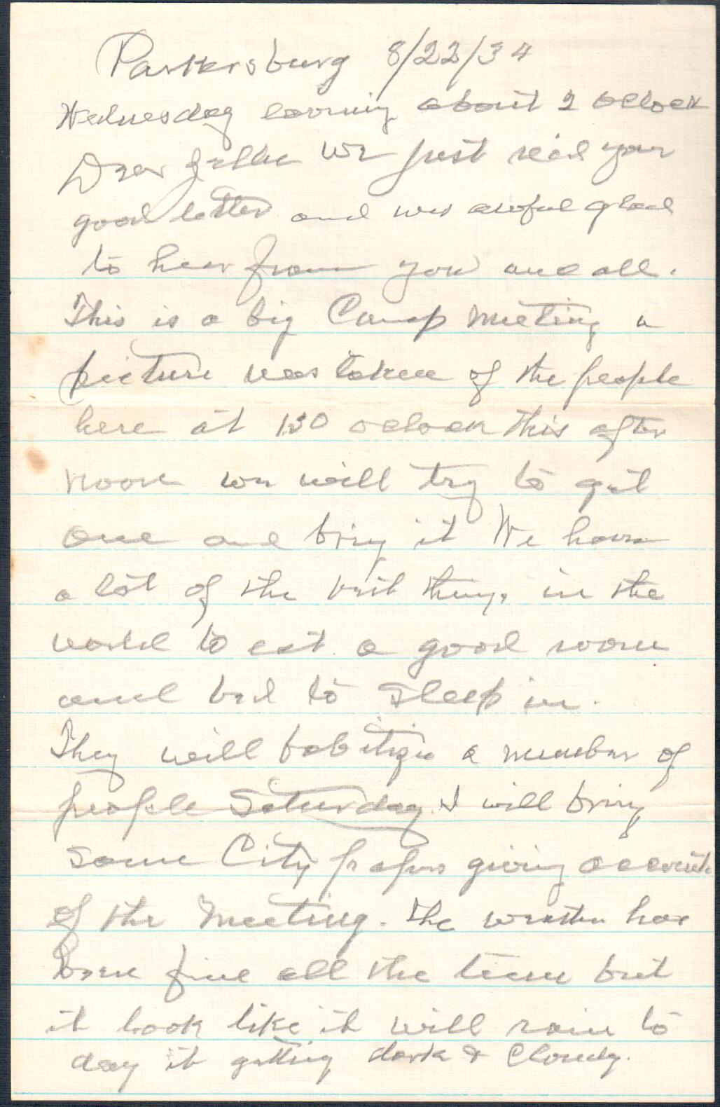 August 22, 1934: Letter to Zella Landes, Riverton, WV