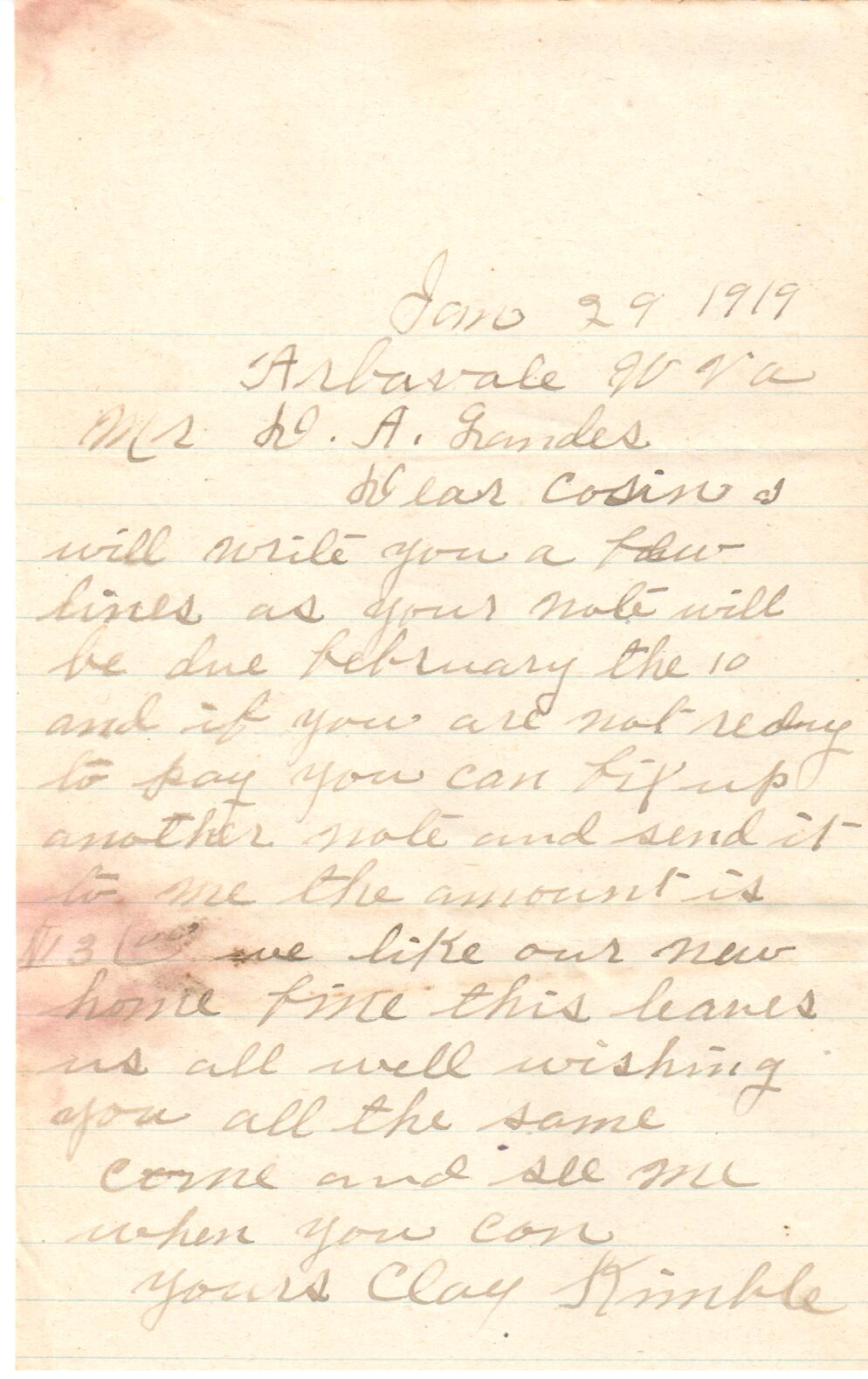 Clay Kimble letter, Jan 29, 1919: Letter from Clay Kimble to D. A.