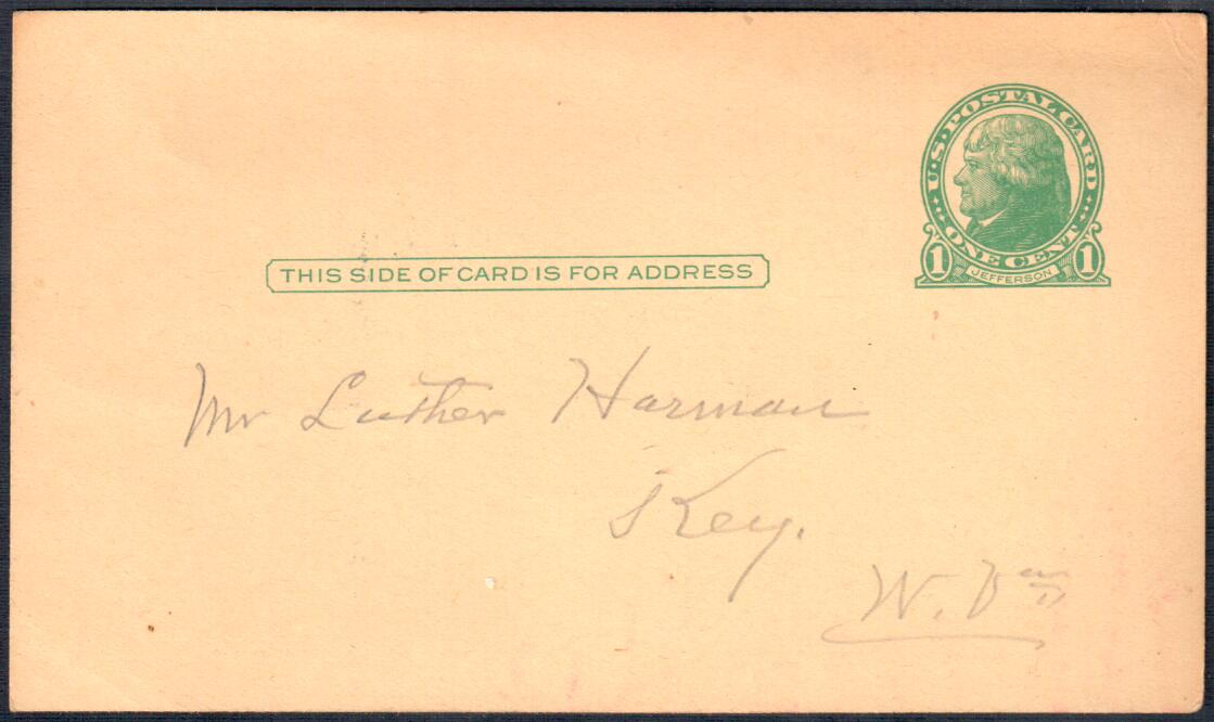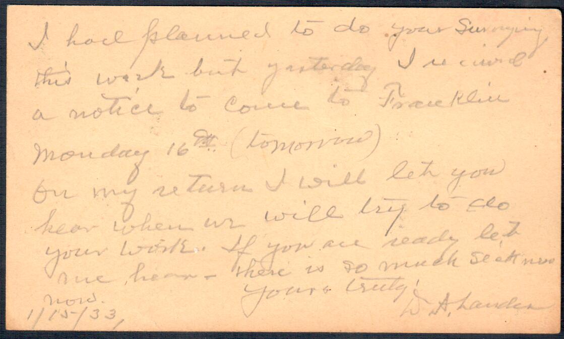 January 15, 1933: Postcard from D. A. Landes to Luther Harman, Key, WV