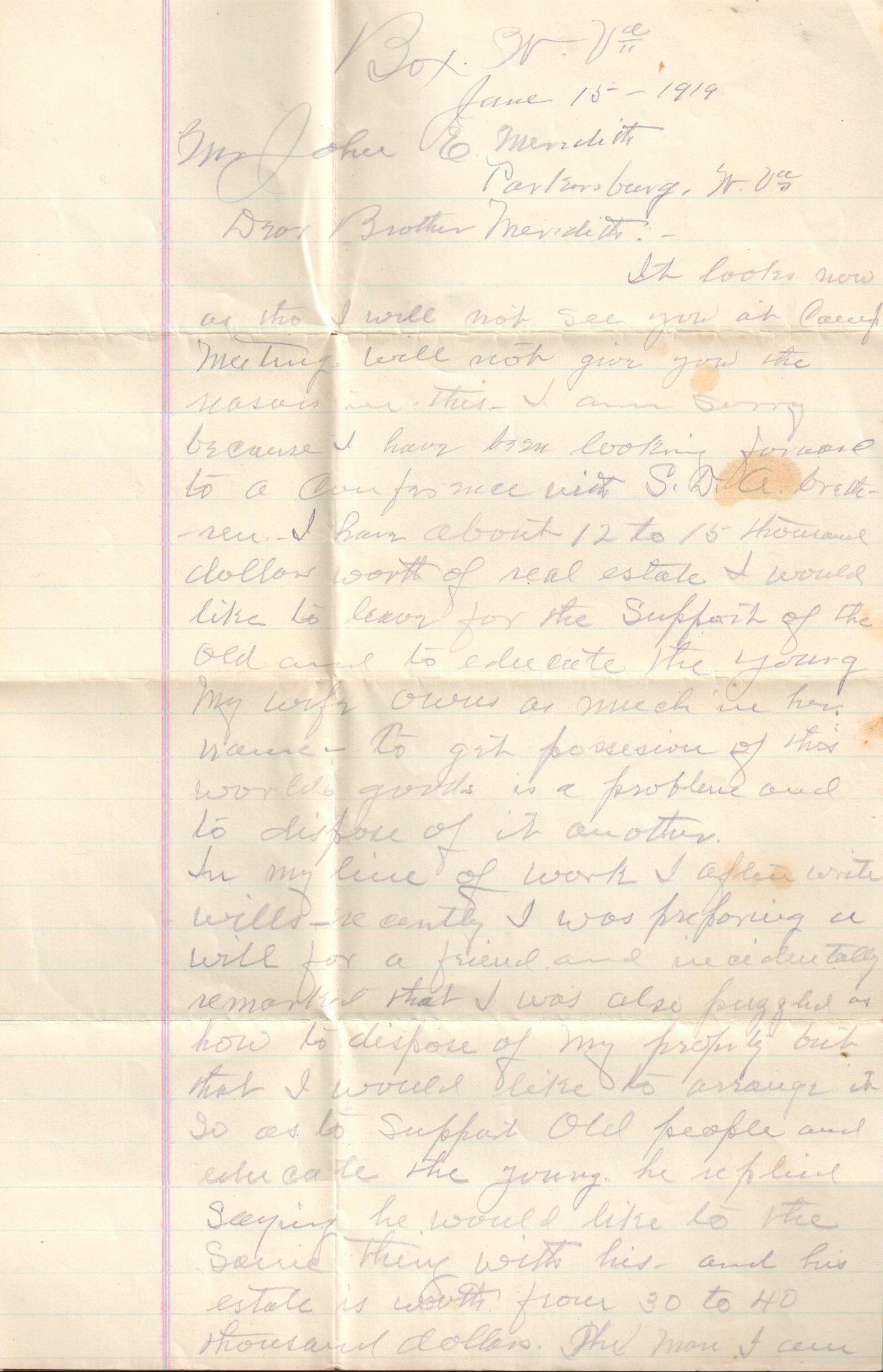June 15, 1919: Letter to Brother John E. Meredith, Parkersburg, WV
