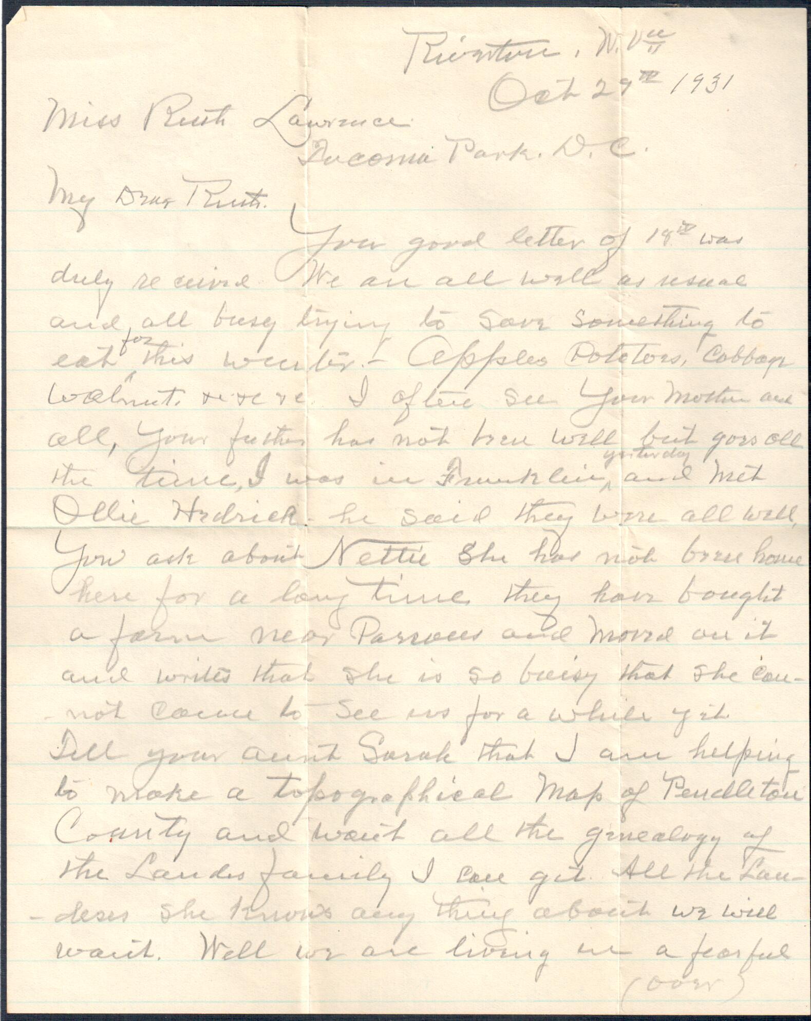 October 29, 1931: Letter to Ruth Lawrence, Takoma Park, D. C.