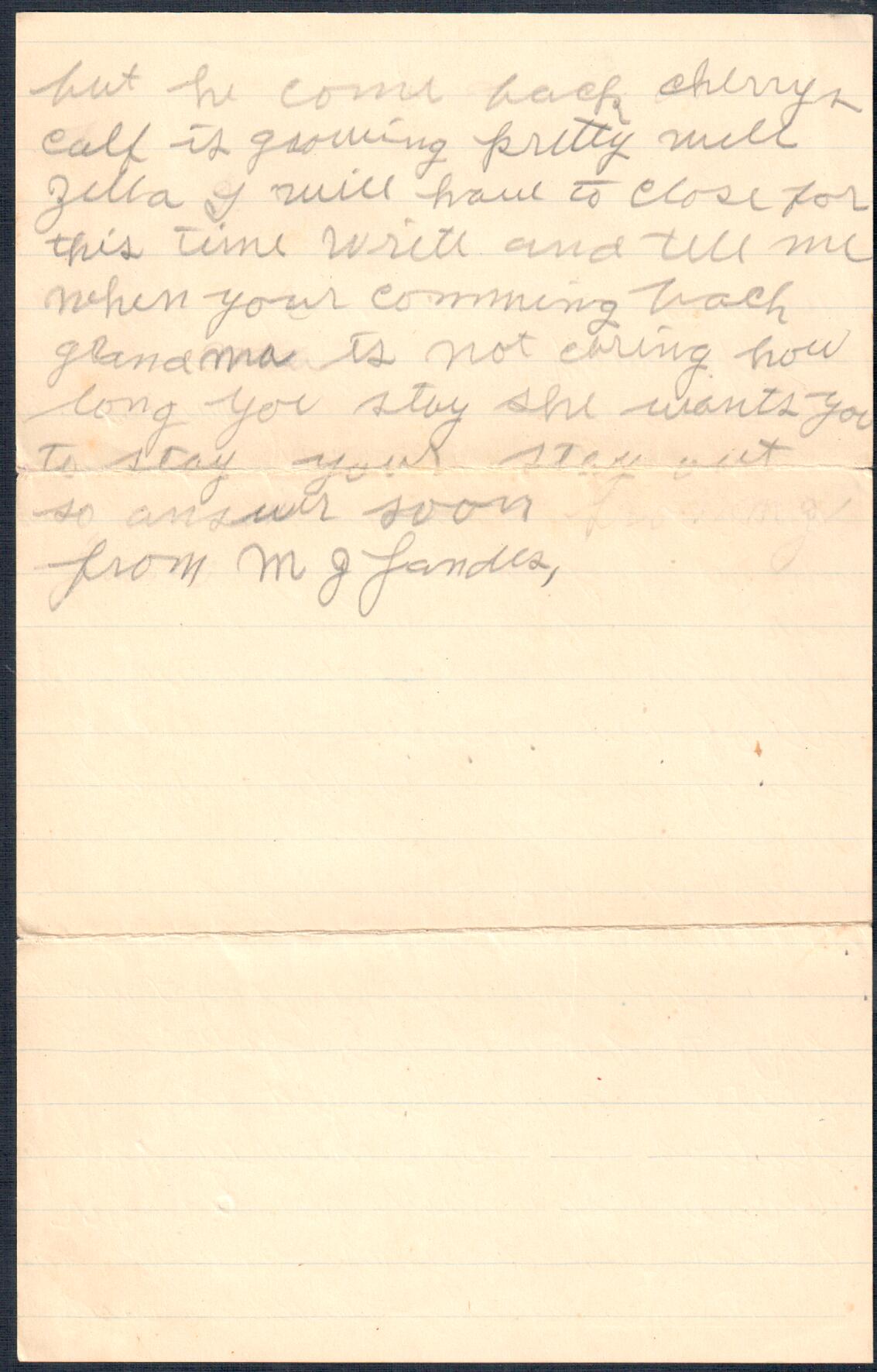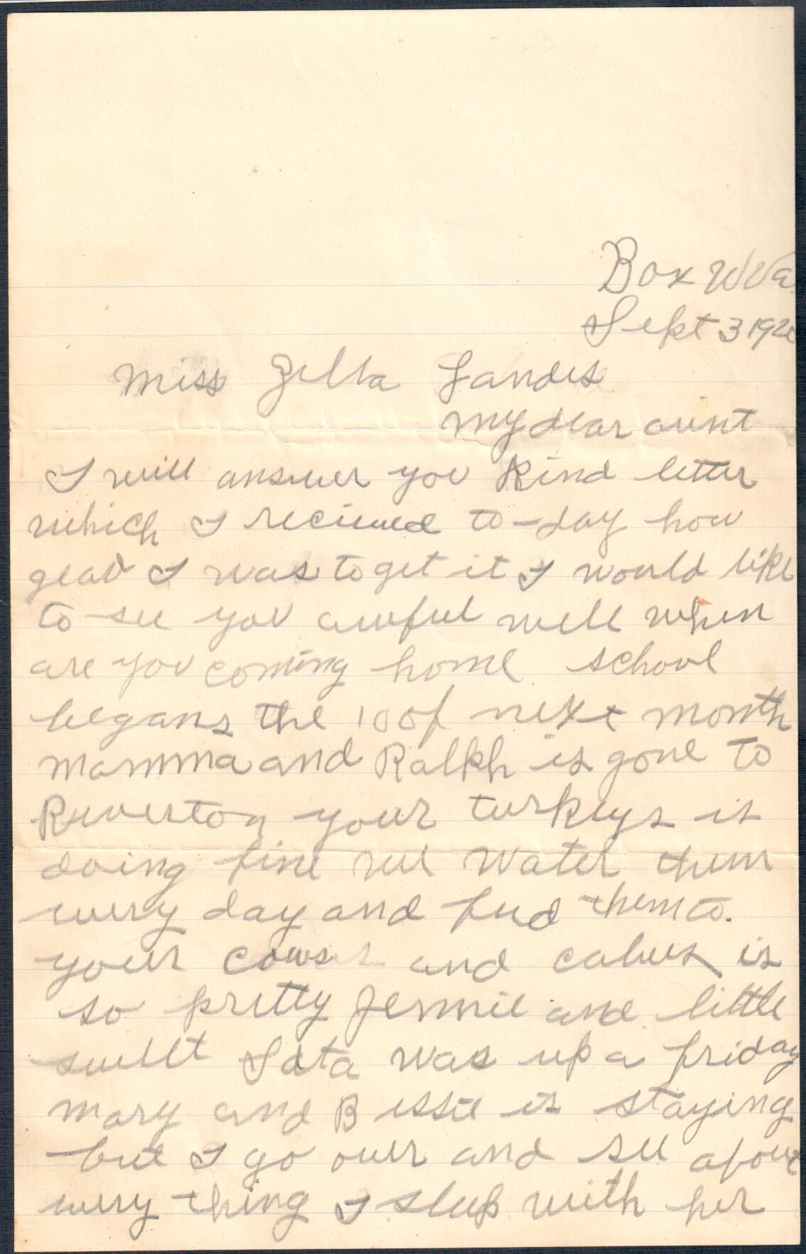 Here is a link to a letter from Mona Z. Landes to Zella Landes. Mona was Zella's niece and was the daughter of Zella's brother, Charles Jasper Landes (Charlie, C. J.). Mona (1909 - 2006) would have only been 10 years old at the writng of this letter.