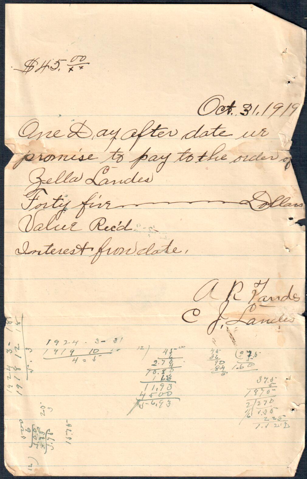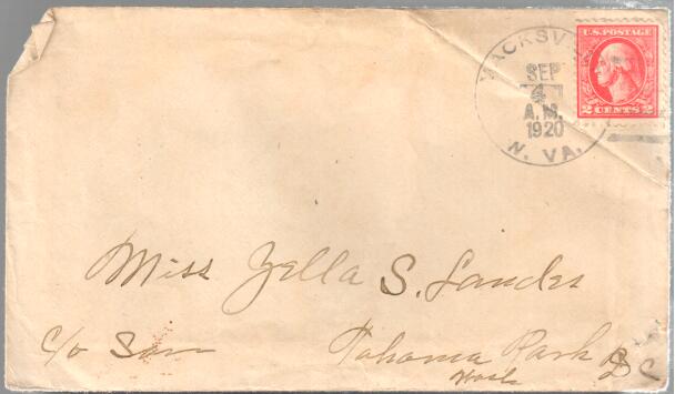Postmarked Sept. 1920, Macksville, WV, probably the envelope for either Monna Landes or one of A. R. Landes letters to Zella in Takoma Park, MD.