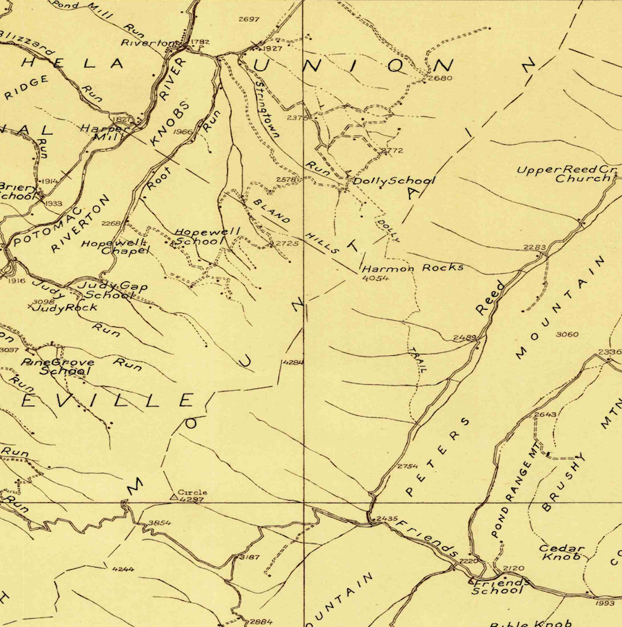 The Dolly Path. Detail of a 1921 topographic map of Pendleton County, WV showing the 'Dolly Trail' (Dolly Path) running from the Dolly School in the Bland Hills, accross North Fork Mt., and connecting to Reeds Creek about 2 miles northeast of what is now the intersection of Reeds Creek Rd and US Rt. 33.