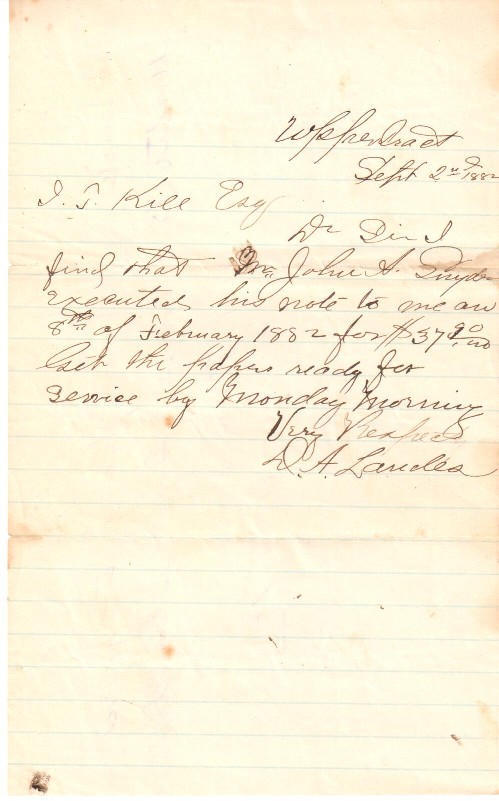 I. T. Kile letter, 1882